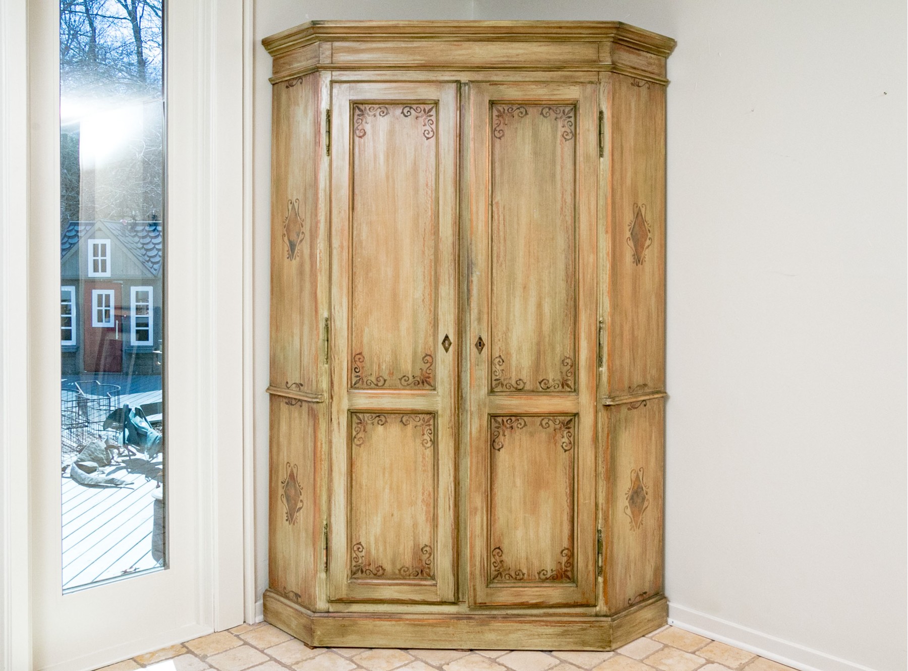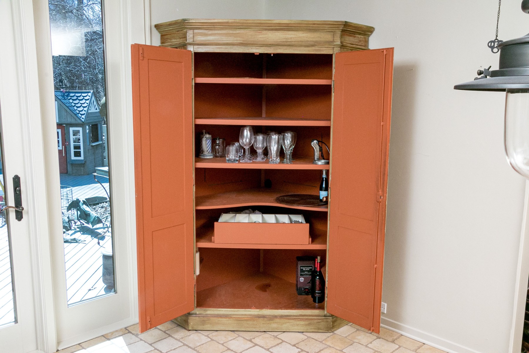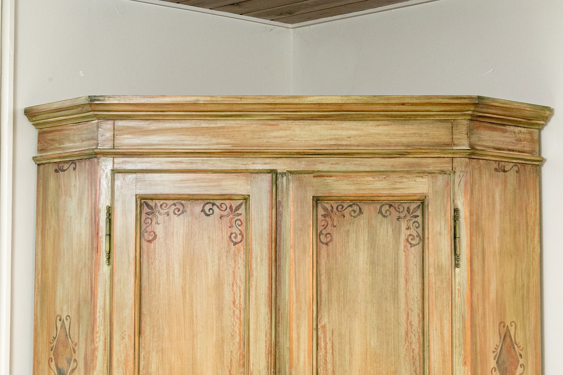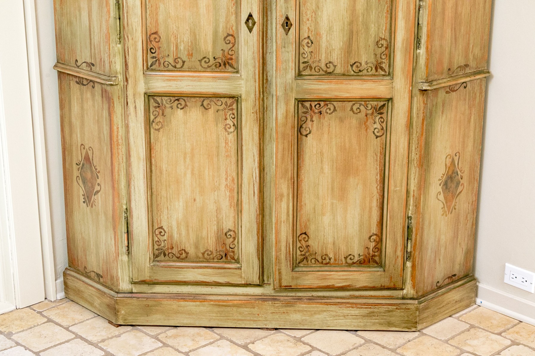 Handsomely hand painted and crafted. The corner cabinet features two hinged doors which open to reveal plenty of interior shelved storage with a pull out drawer for flatware or other utensils.