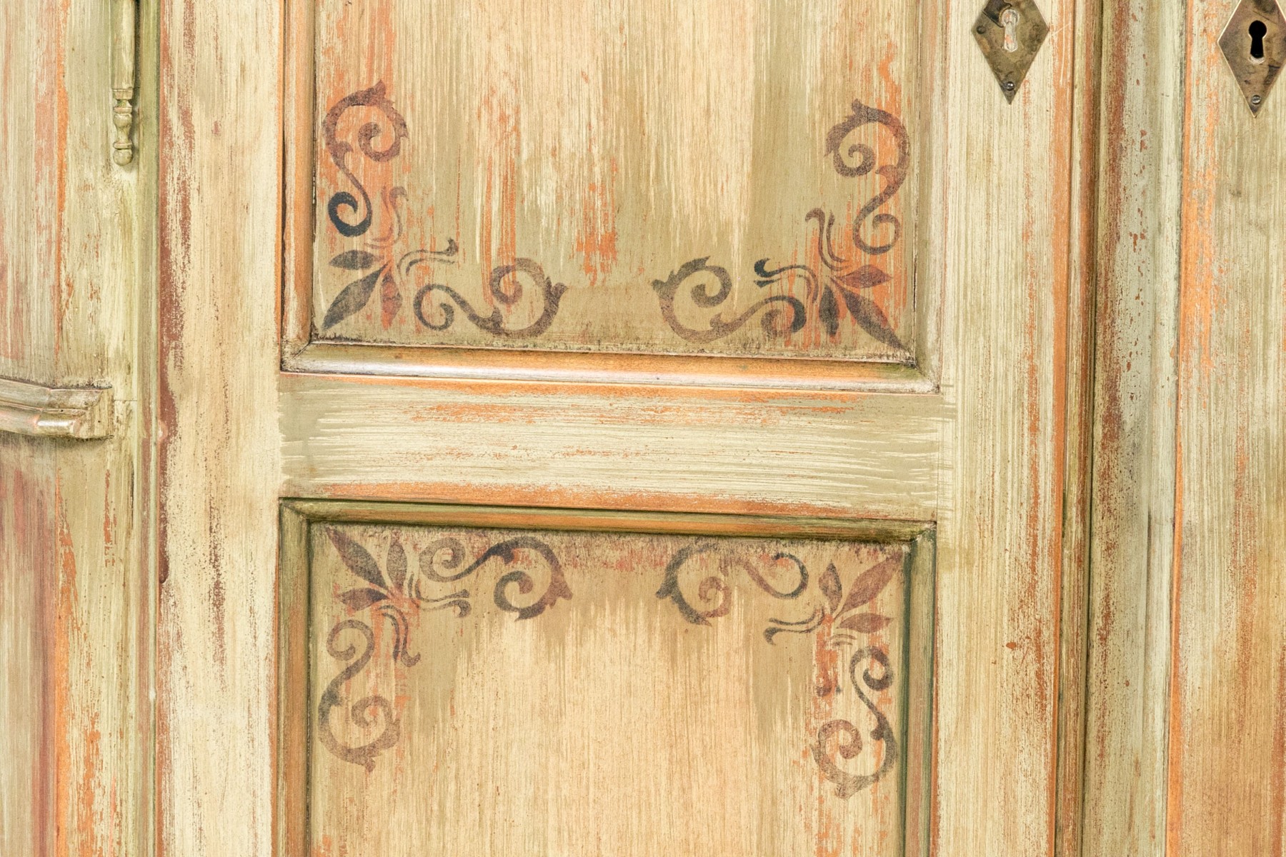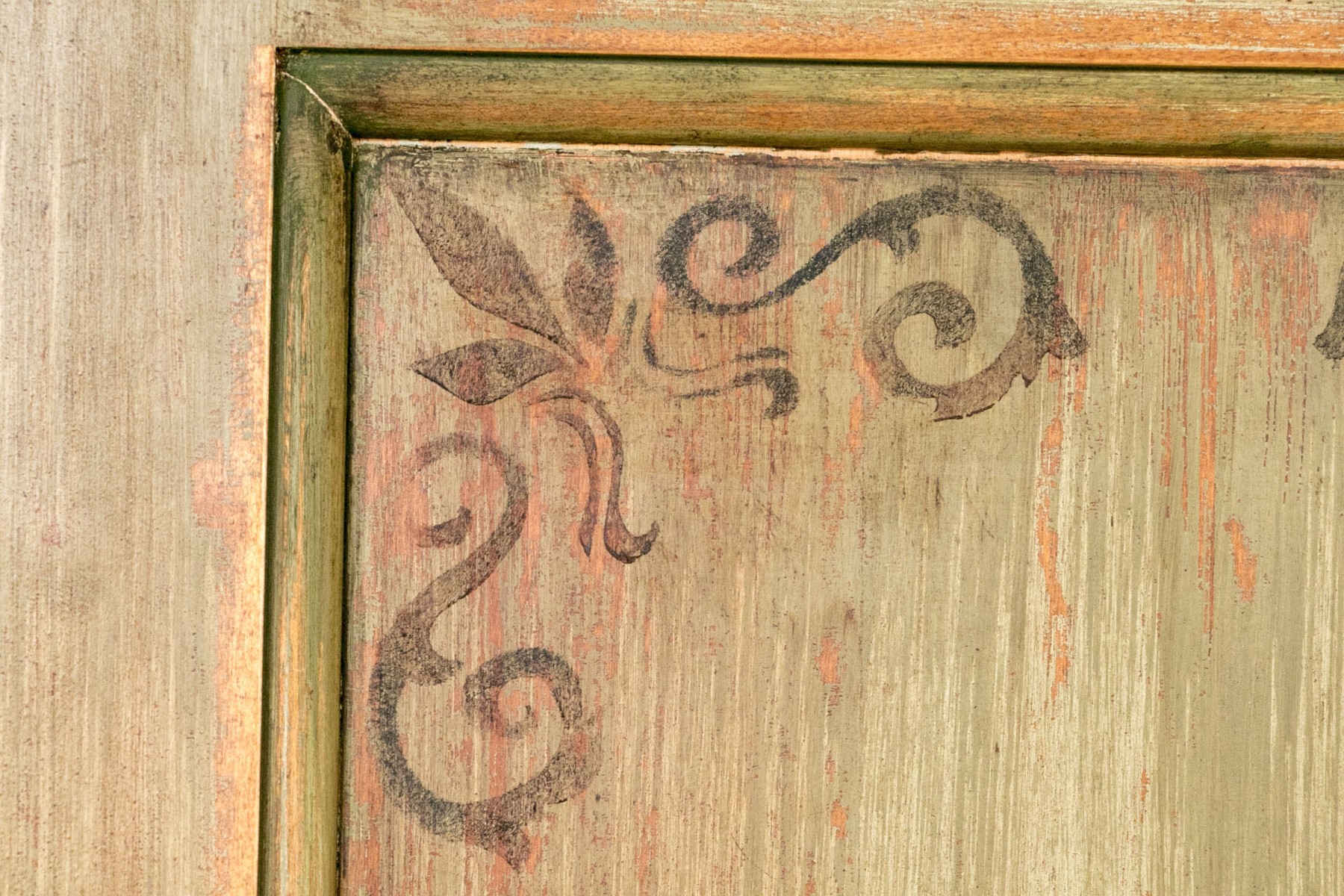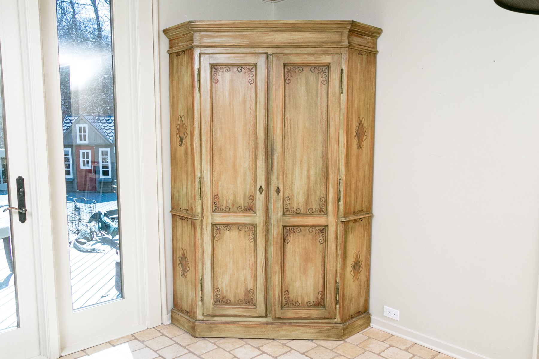Handsomely hand painted and crafted. The corner cabinet features two hinged doors which open to reveal plenty of interior shelved storage with a pull out drawer for flatware or other utensils.