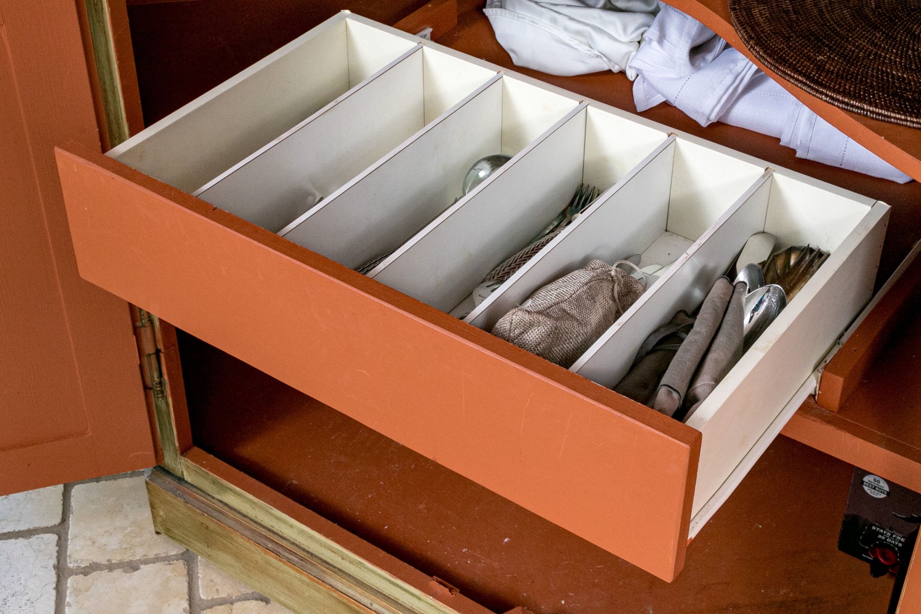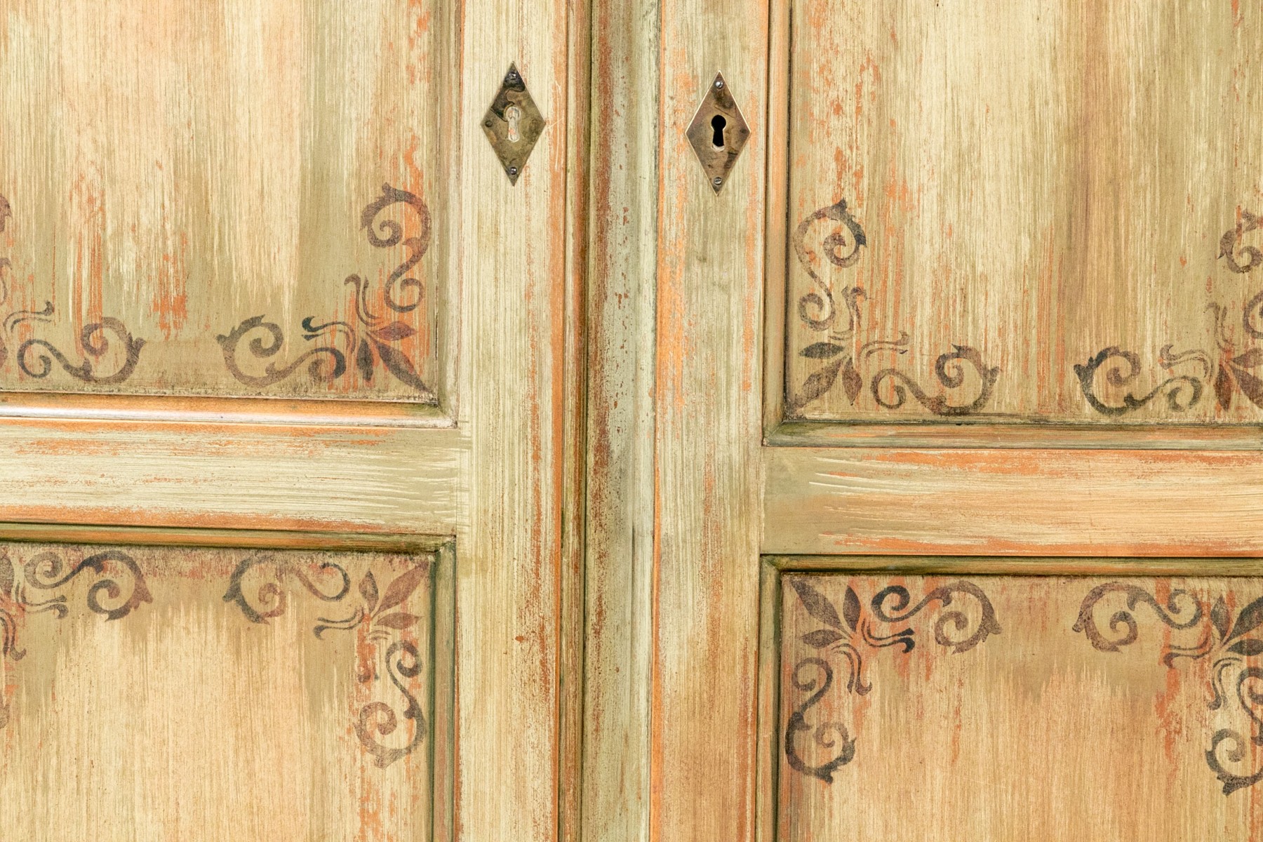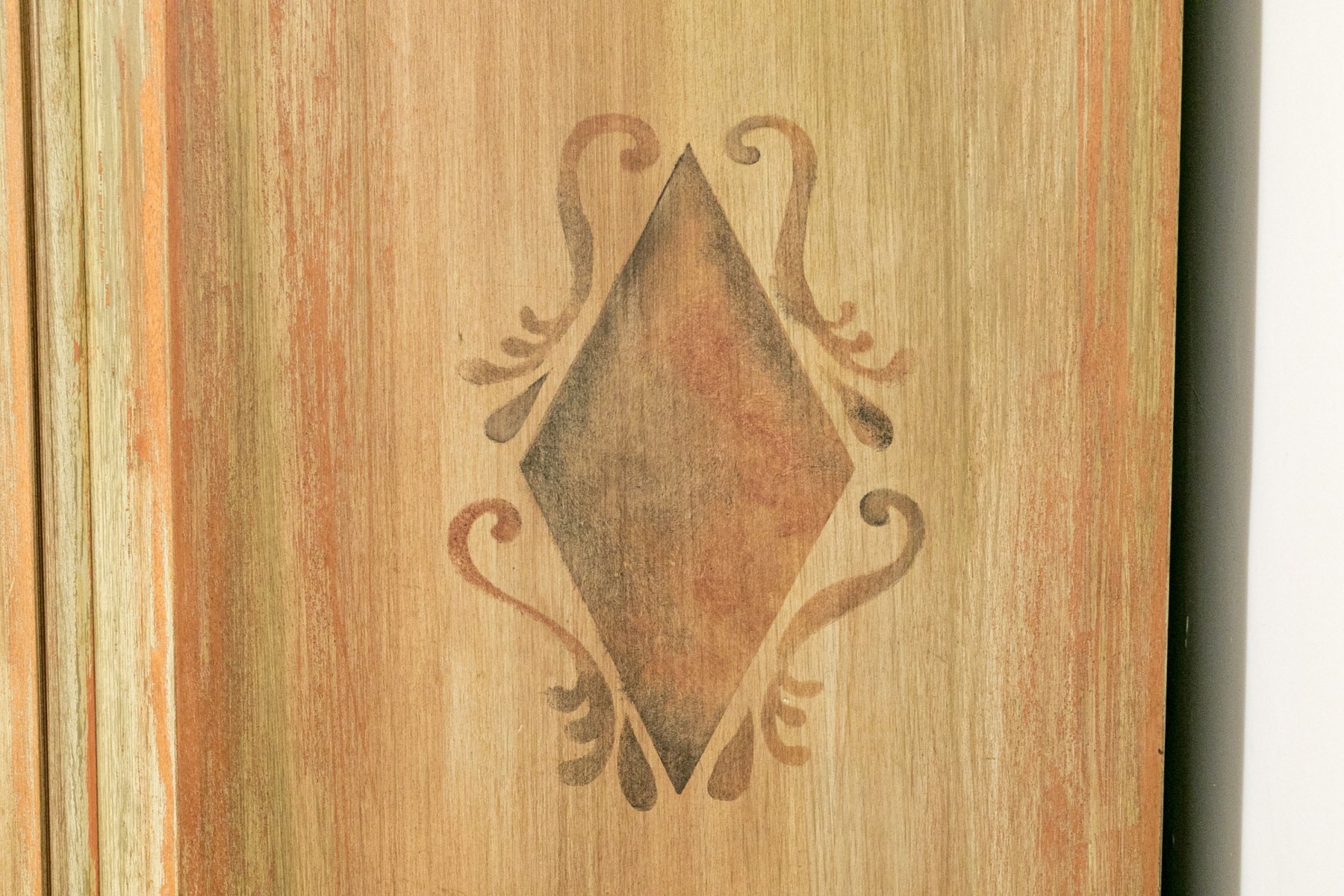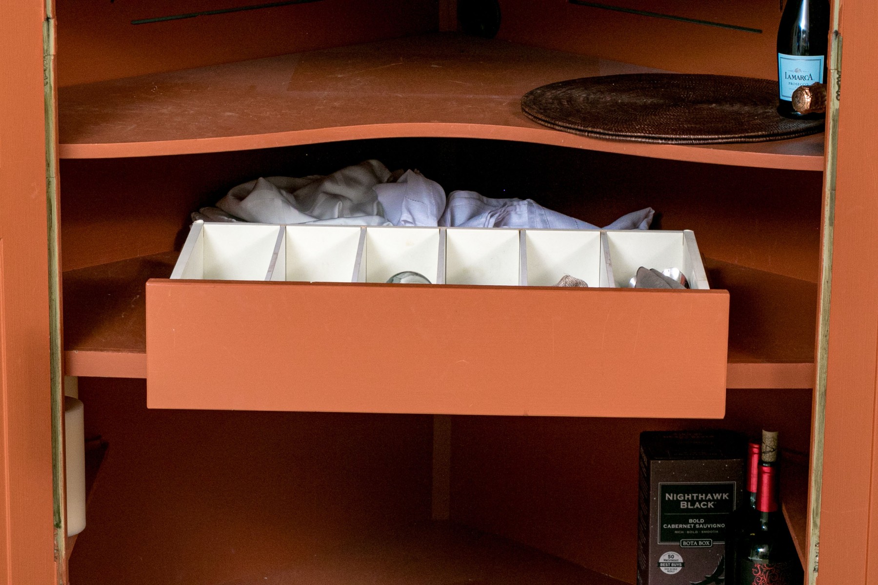 Handsomely hand painted and crafted. The corner cabinet features two hinged doors which open to reveal plenty of interior shelved storage with a pull out drawer for flatware or other utensils.