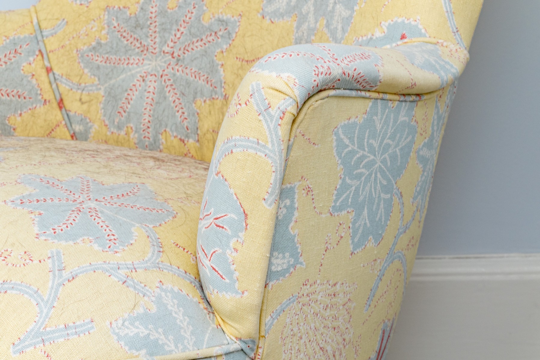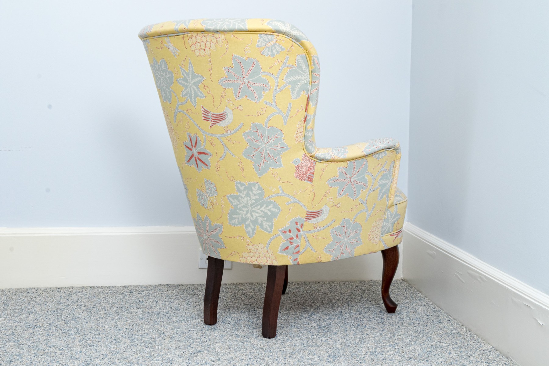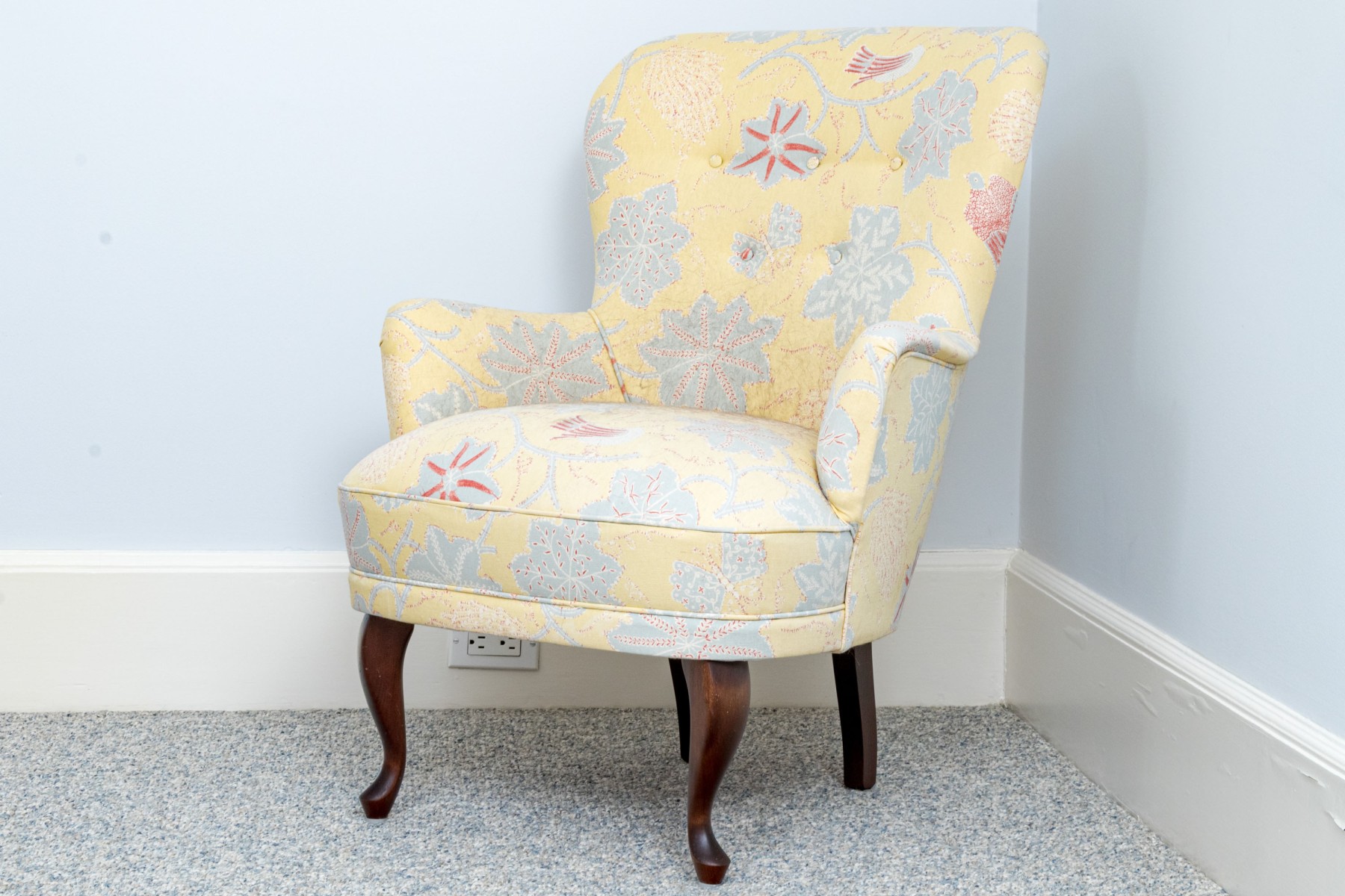 A charming wingback chair upholstered in cheery light yellow with blue and red leaf motifs. Button tufted along the back and supported by dark brown cabriole legs.
