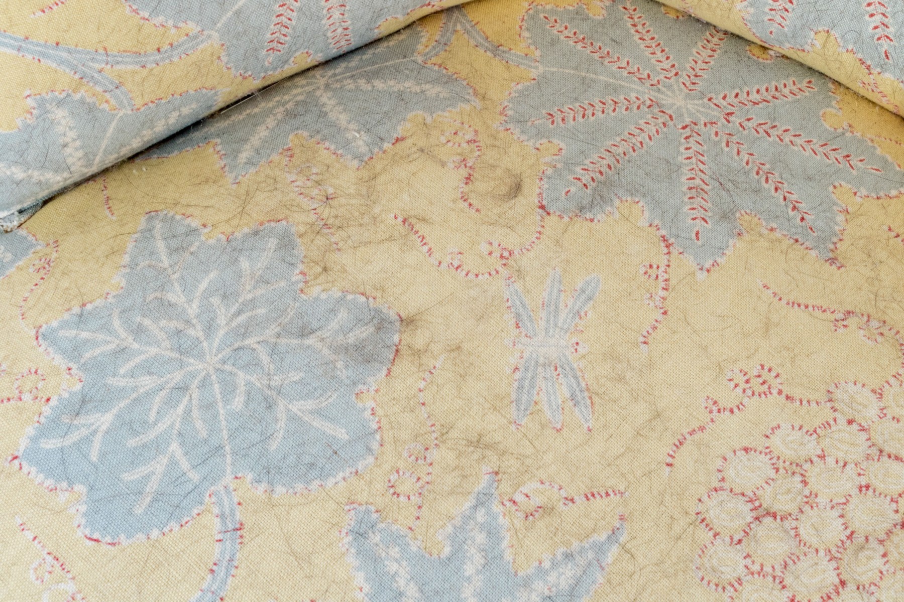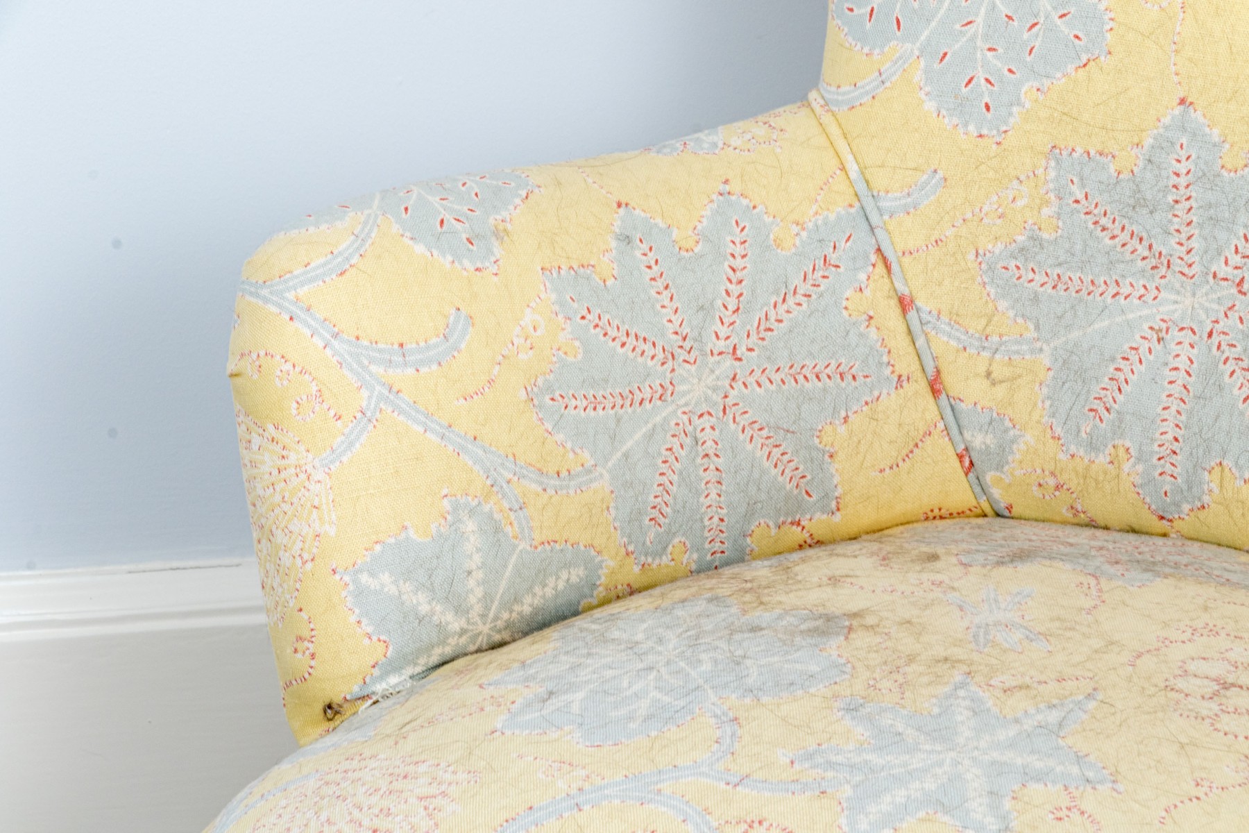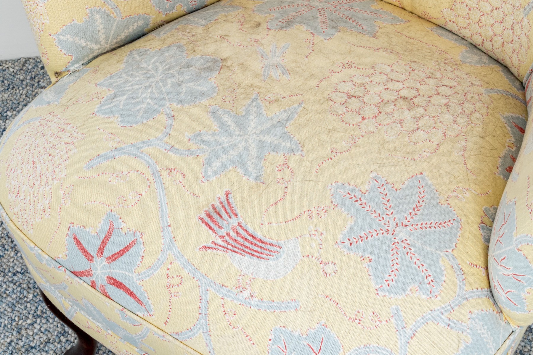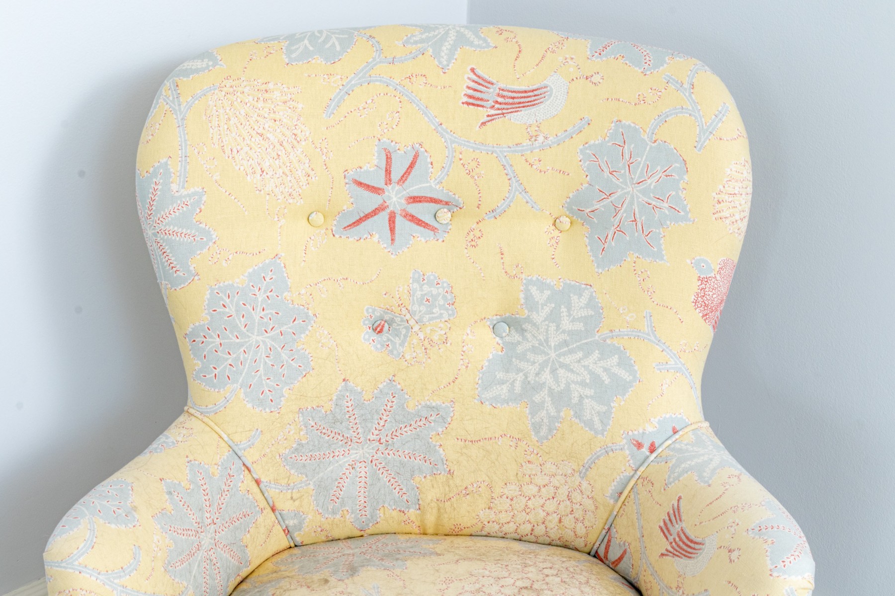 A charming wingback chair upholstered in cheery light yellow with blue and red leaf motifs. Button tufted along the back and supported by dark brown cabriole legs.