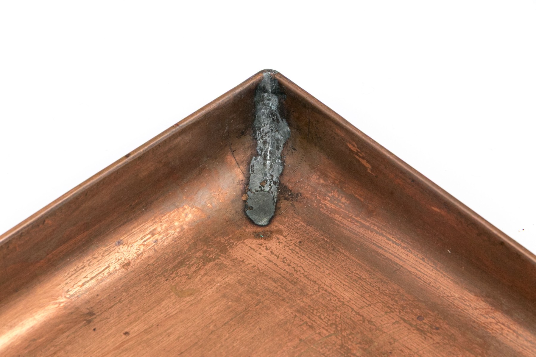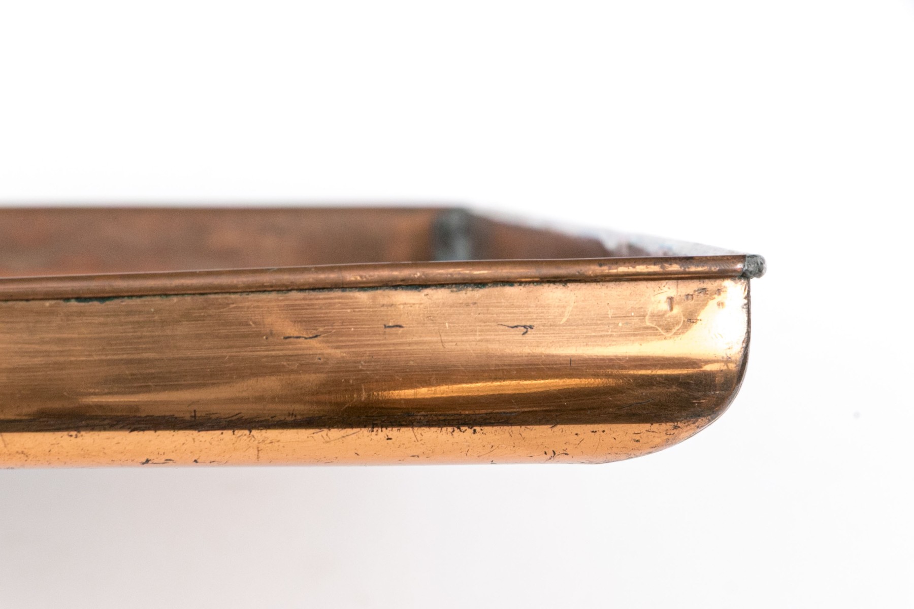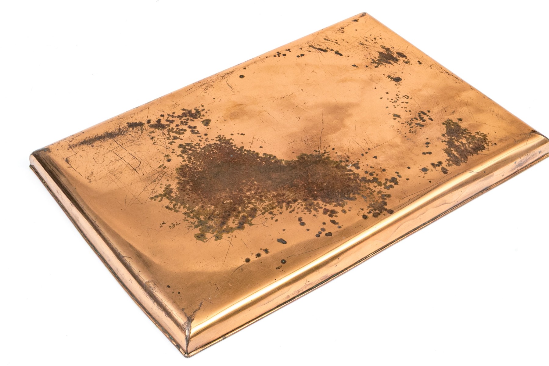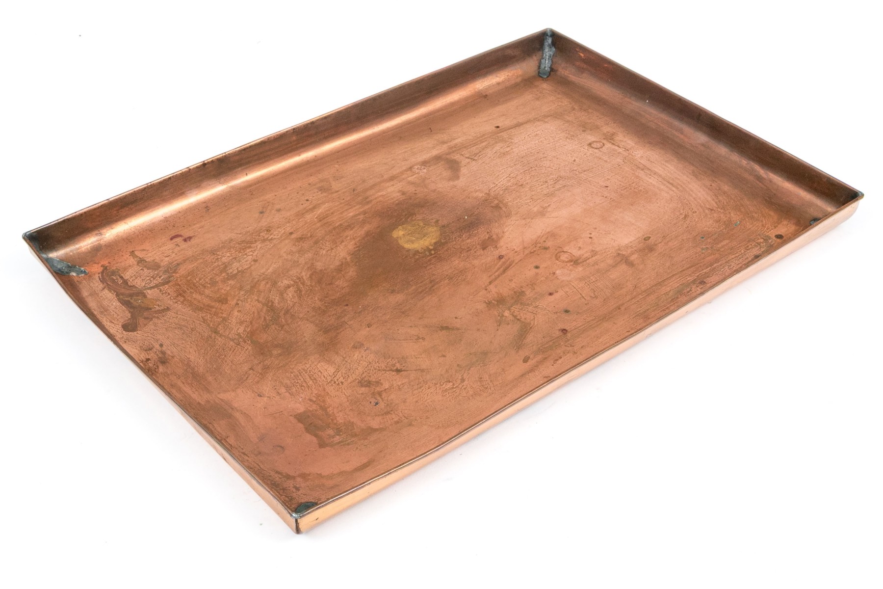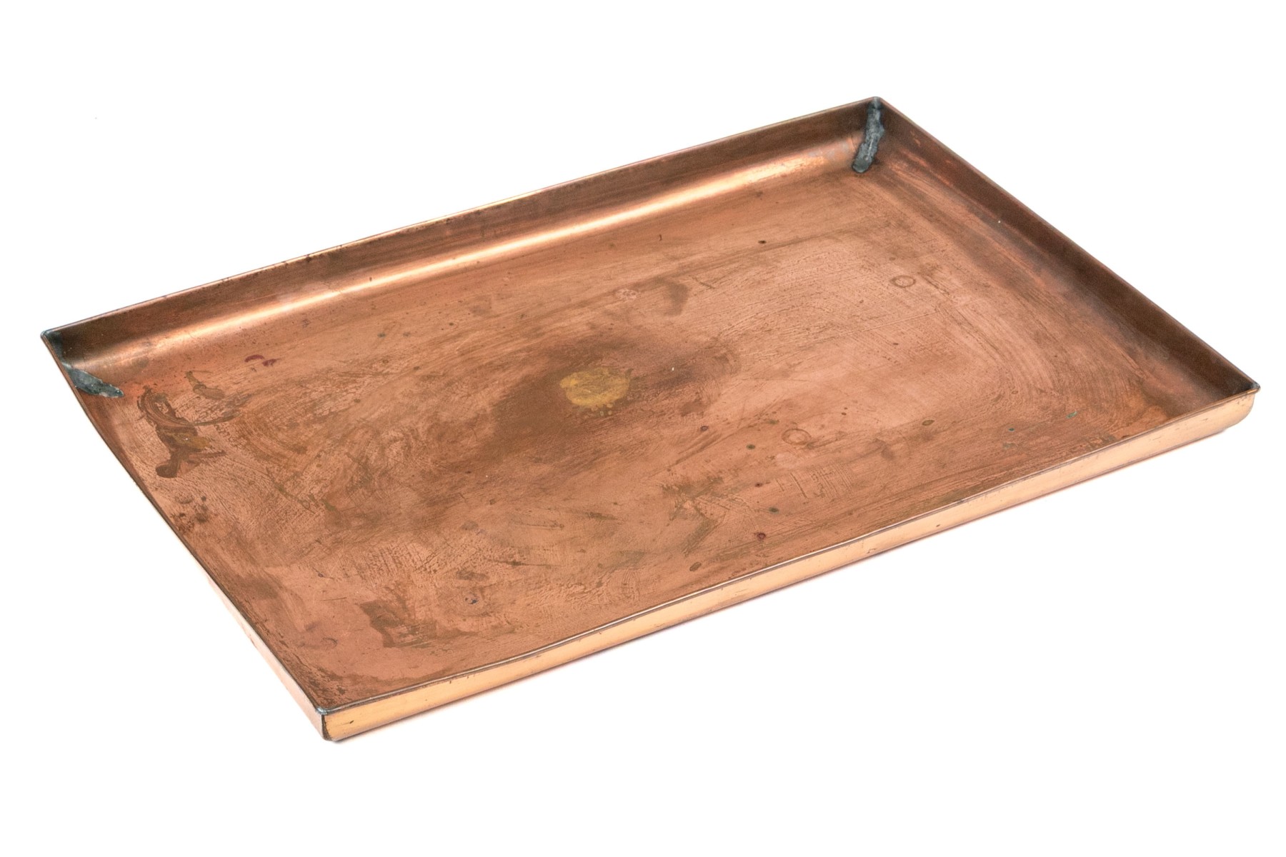 A charming, vintage and rustic copper rectangular bar tray having a low trim around the perimeter. The tray has a wonderful rustic appearance.
