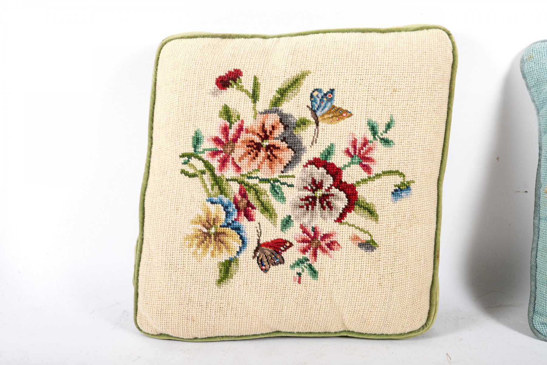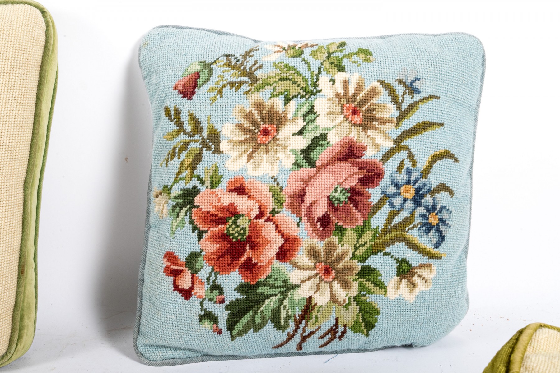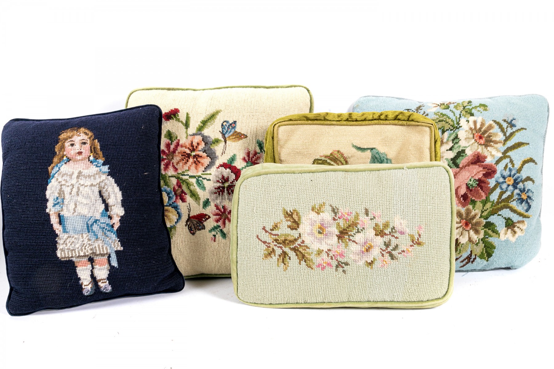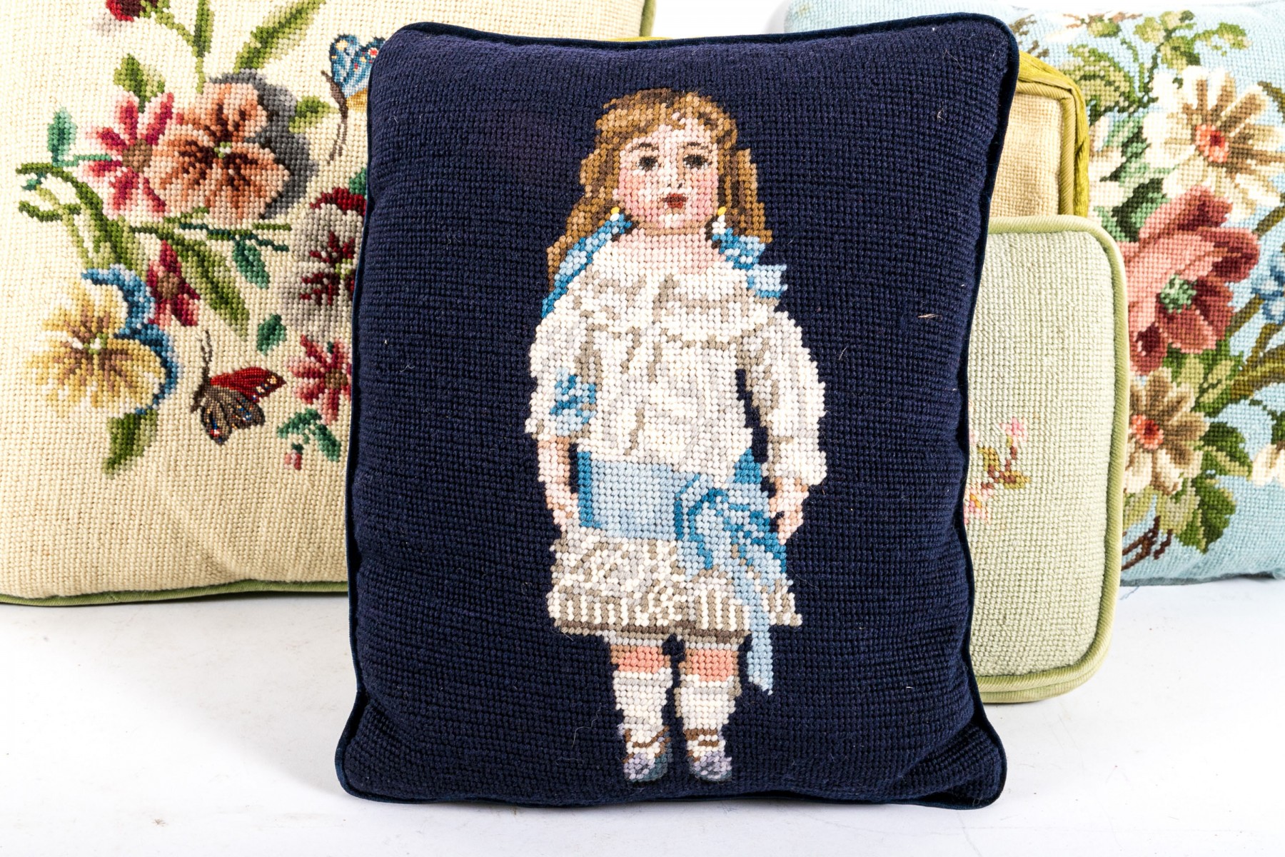 A charming collection of vintage needlepoint throw/accent pillows in blue, green and cream. Four pillows feature pretty floral sprays, while the fifth depicts a brunette doll wearing a white and blue dress. One pillow is unstuffed.
