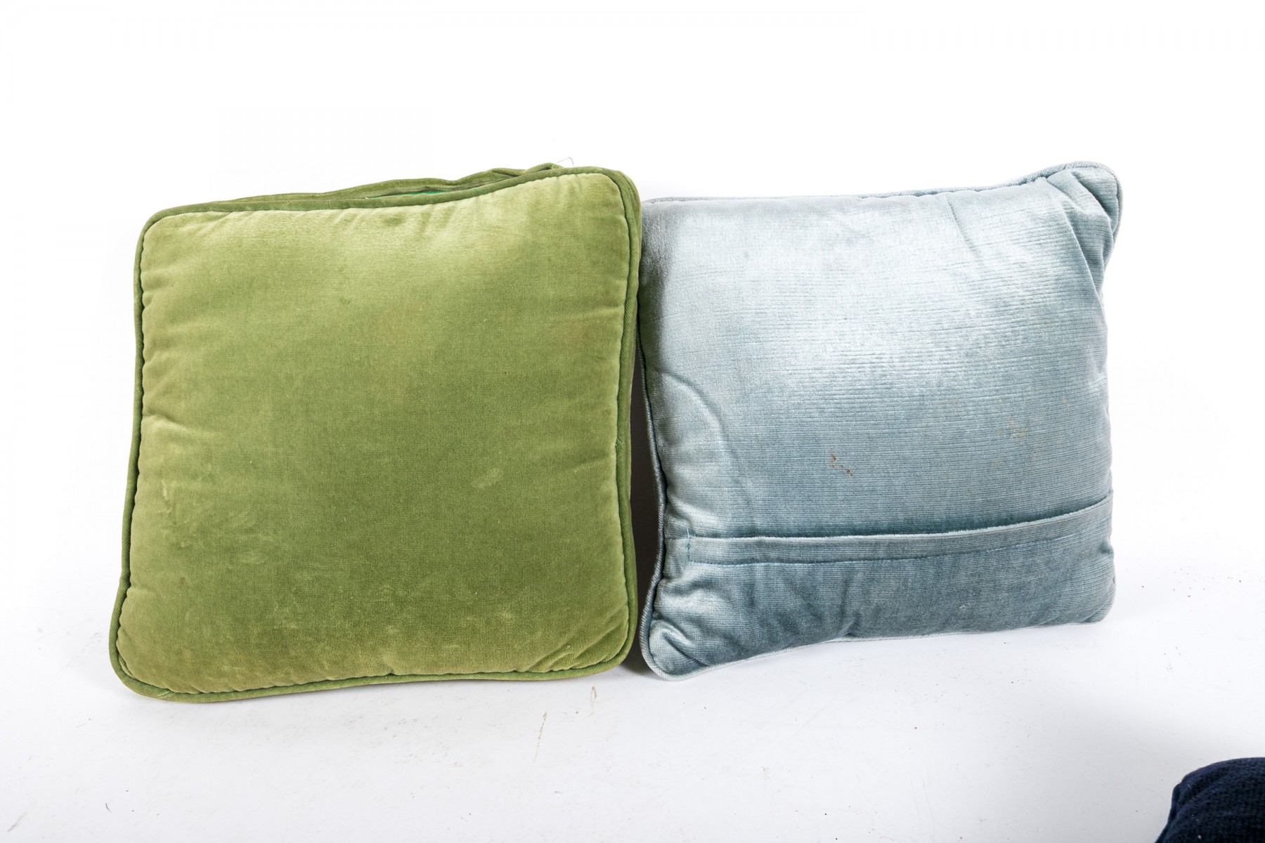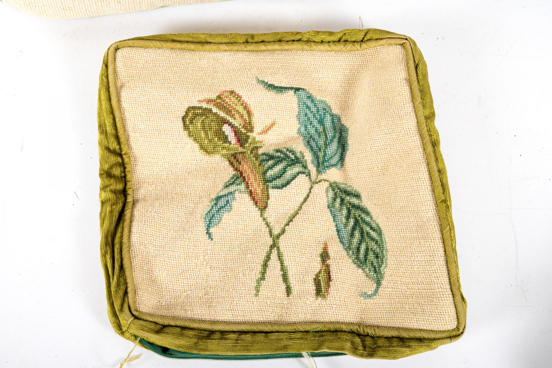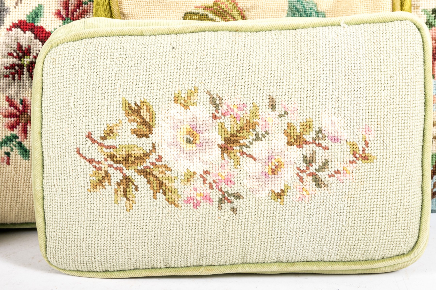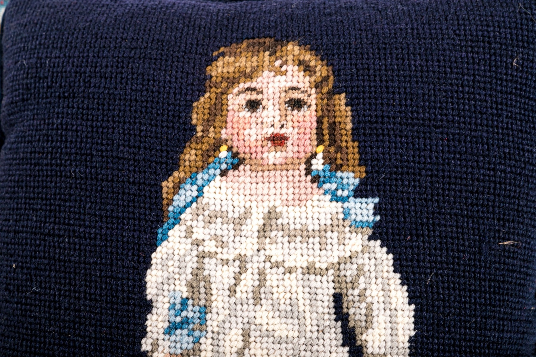 A charming collection of vintage needlepoint throw/accent pillows in blue, green and cream. Four pillows feature pretty floral sprays, while the fifth depicts a brunette doll wearing a white and blue dress. One pillow is unstuffed.