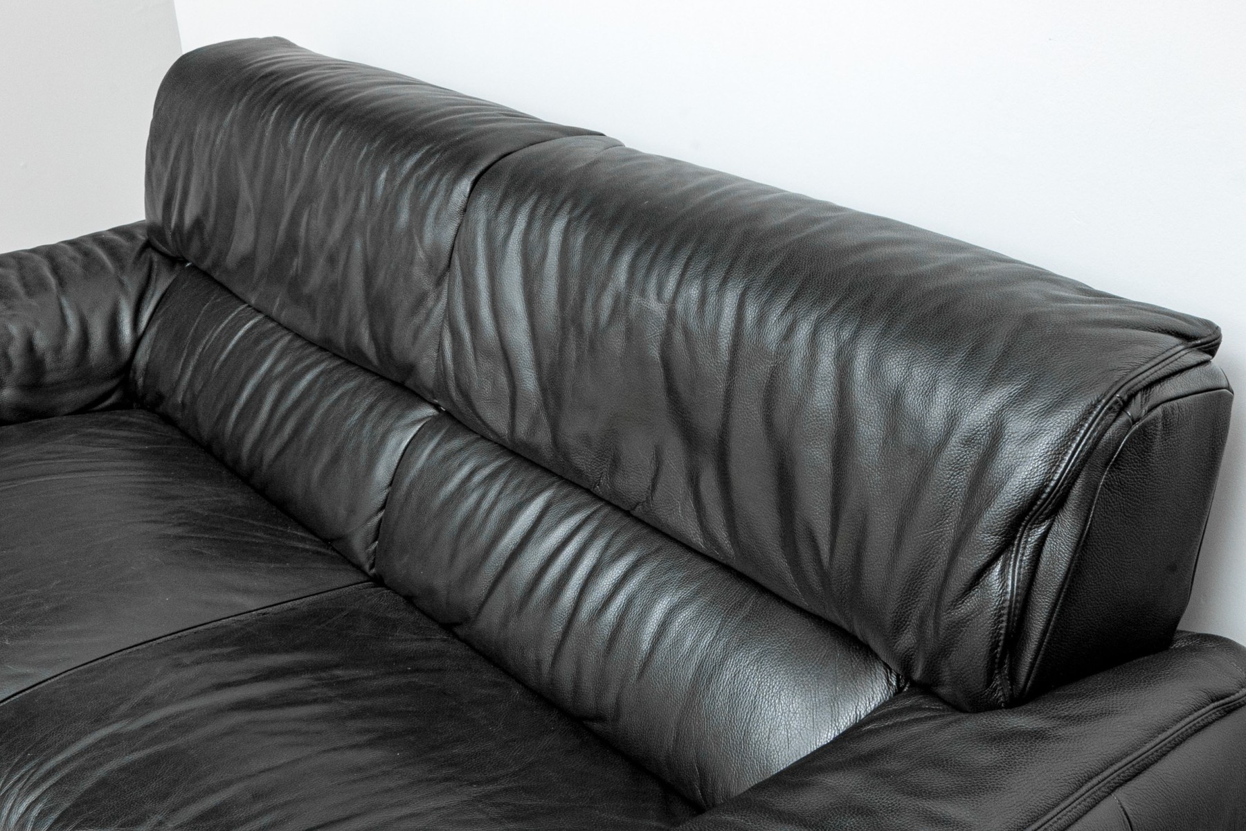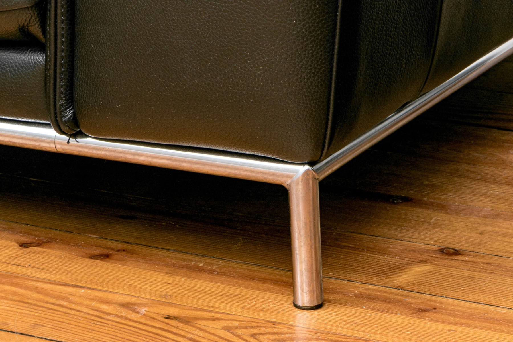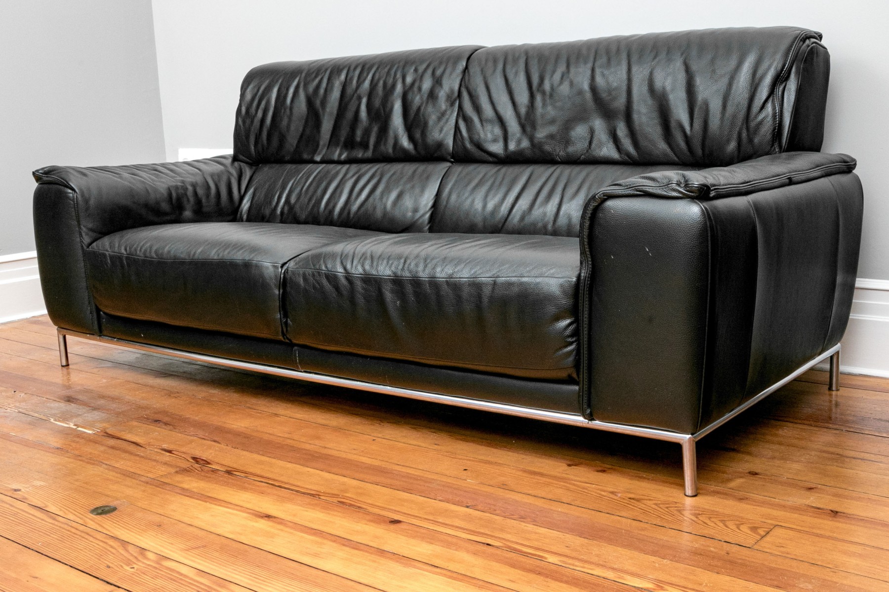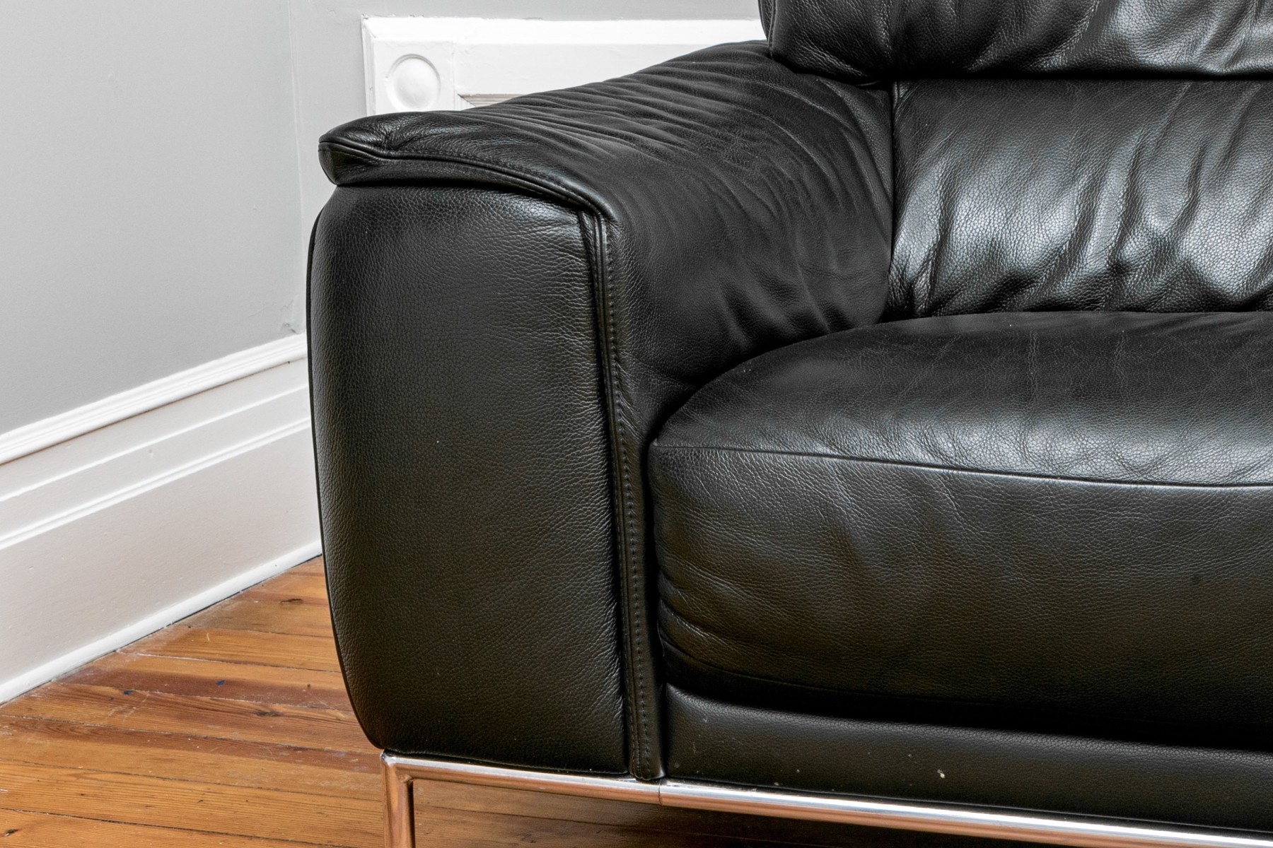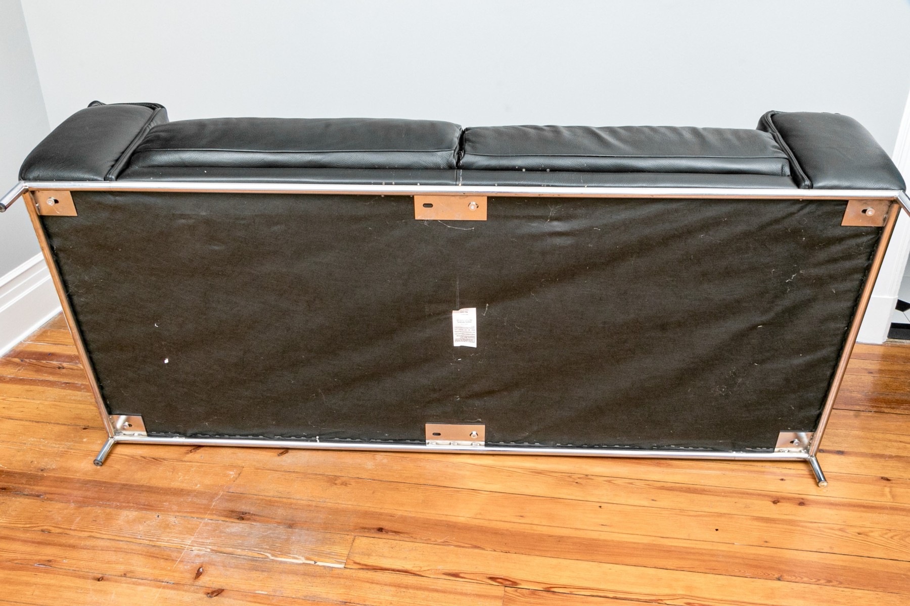A handsome and luxurious Italian Chateau d'Ax sofa in rich black leather upholstery, featuring a horizontally tufted back and two plump seat cushions flanked by sleek rectangular arms made even more comfortable with padded tops. Raised on an airy chrome base to balance the strong lines of the form.