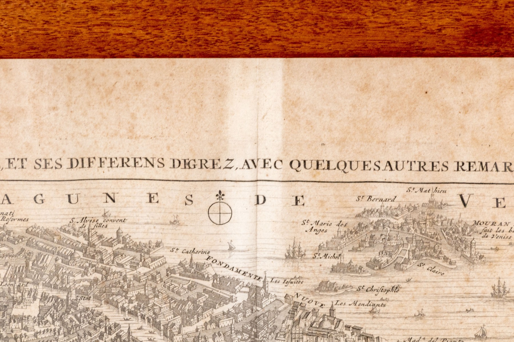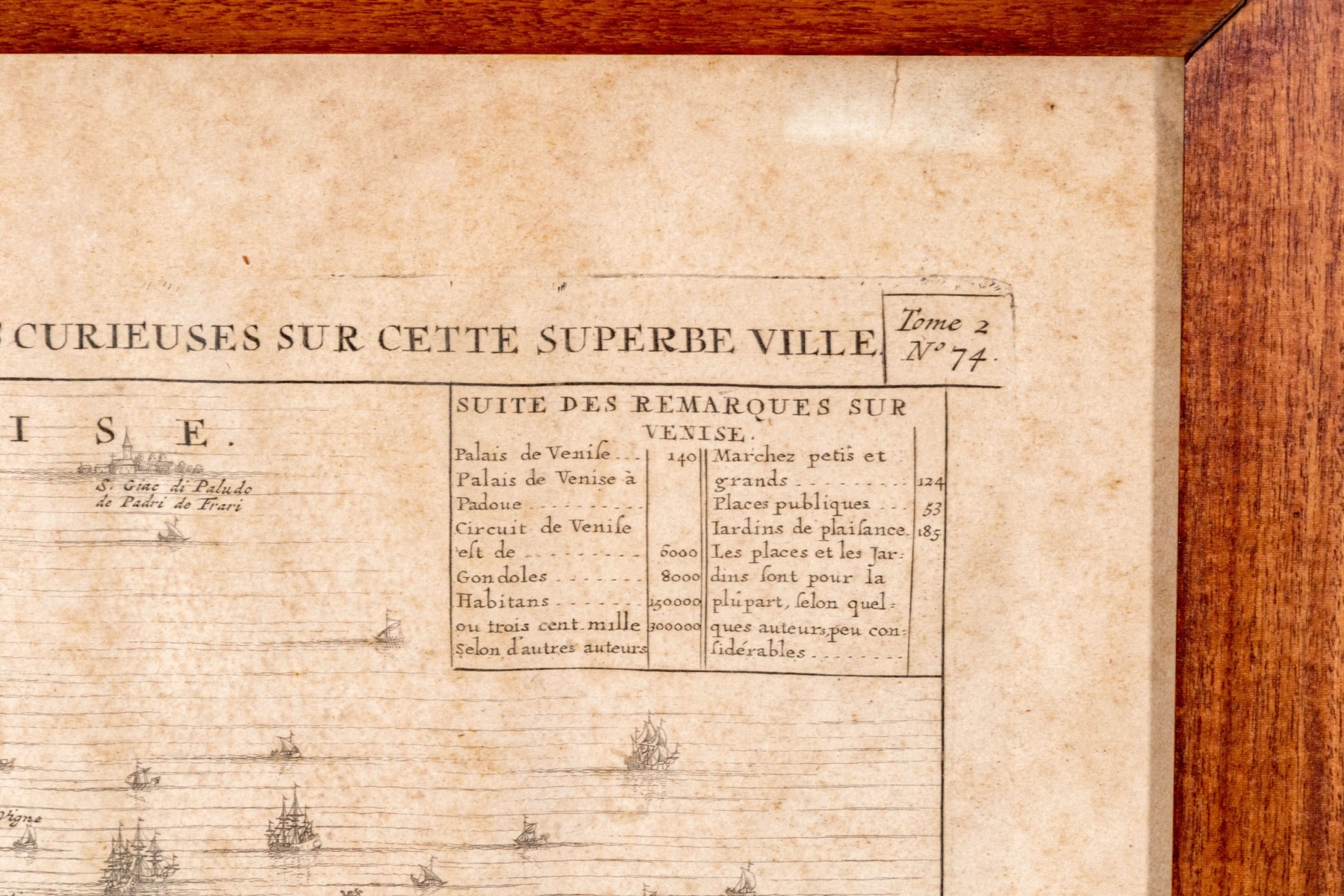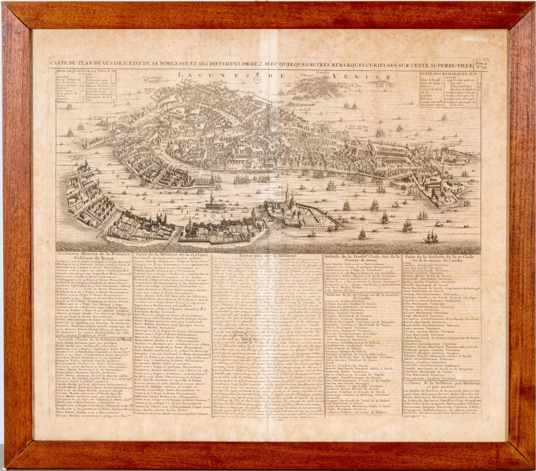 "Carte Du Plan De Venise, L'Etat De Sa Noblesse, et ses Differns Degrez, avec Quelques Autres Remarques Curieuses sur Cette Superbe Ville" antique map of Venice with a detailed legend of notable landmarks below. Displayed in a simple wood frame.
