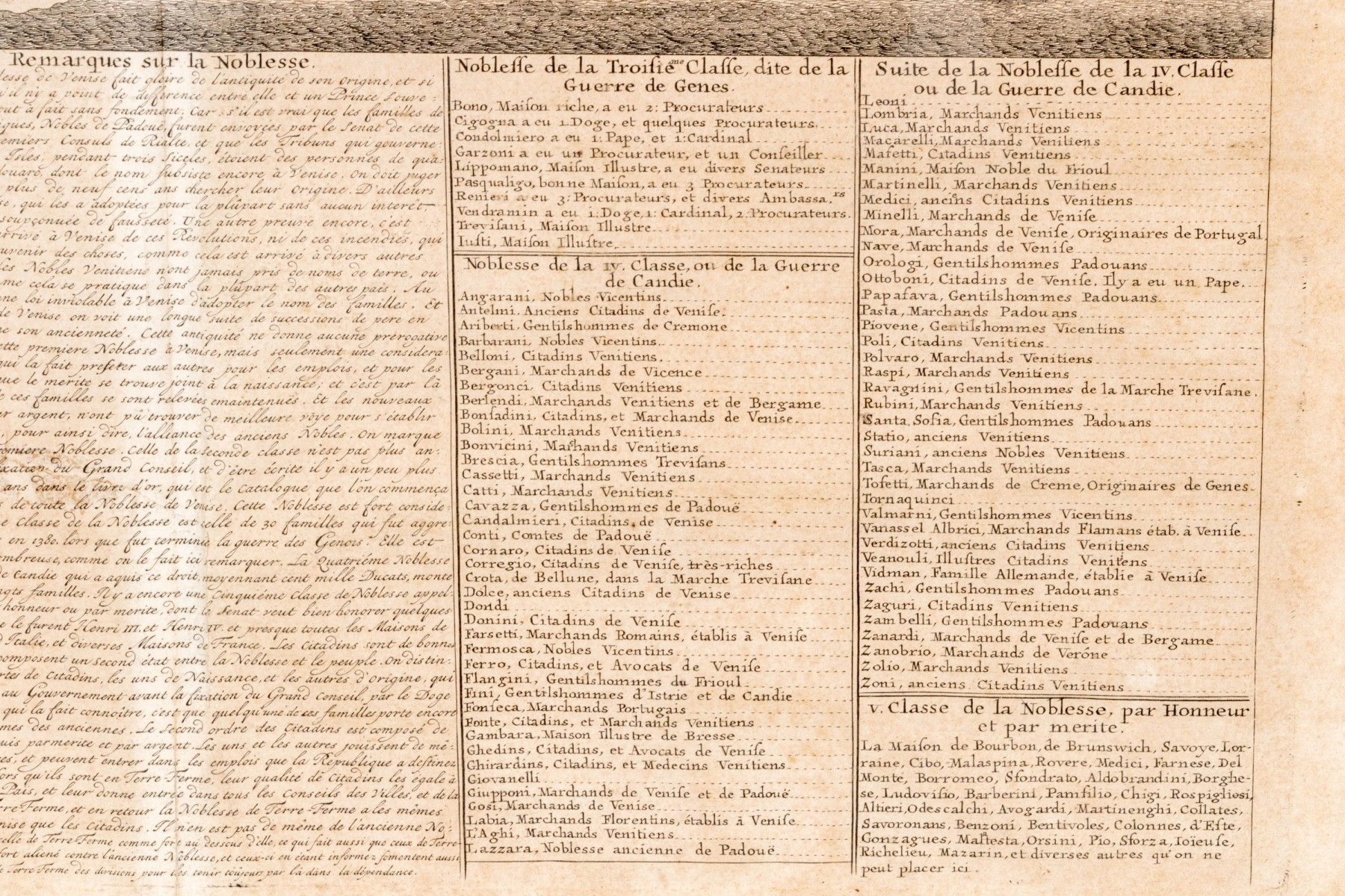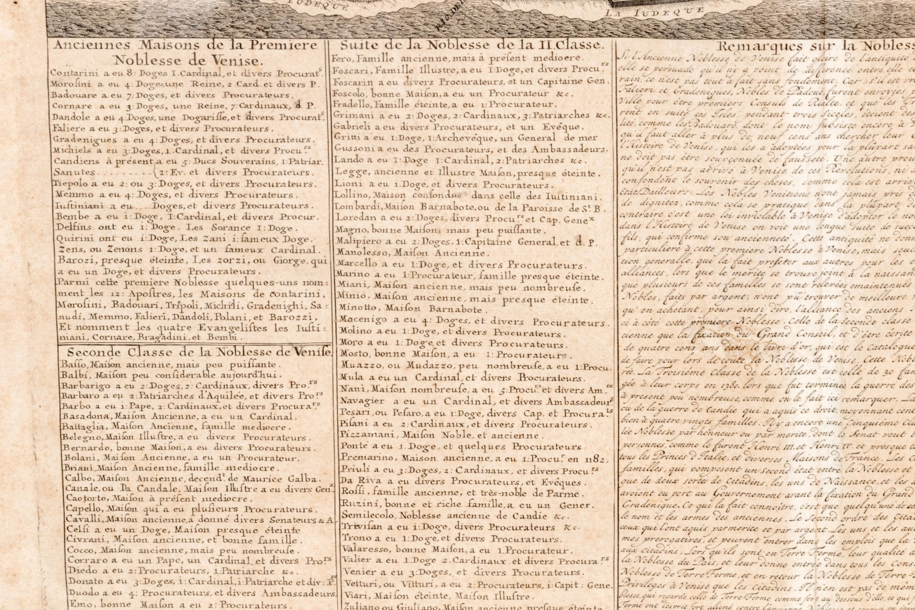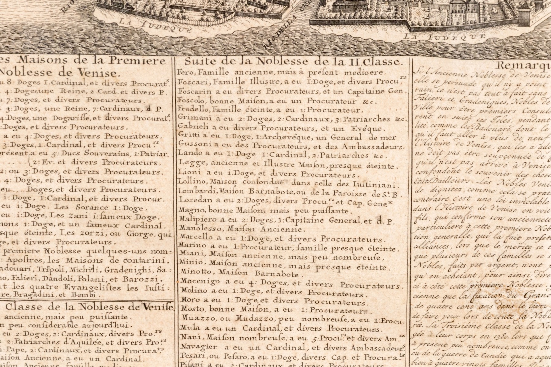 "Carte Du Plan De Venise, L'Etat De Sa Noblesse, et ses Differns Degrez, avec Quelques Autres Remarques Curieuses sur Cette Superbe Ville" antique map of Venice with a detailed legend of notable landmarks below. Displayed in a simple wood frame.
