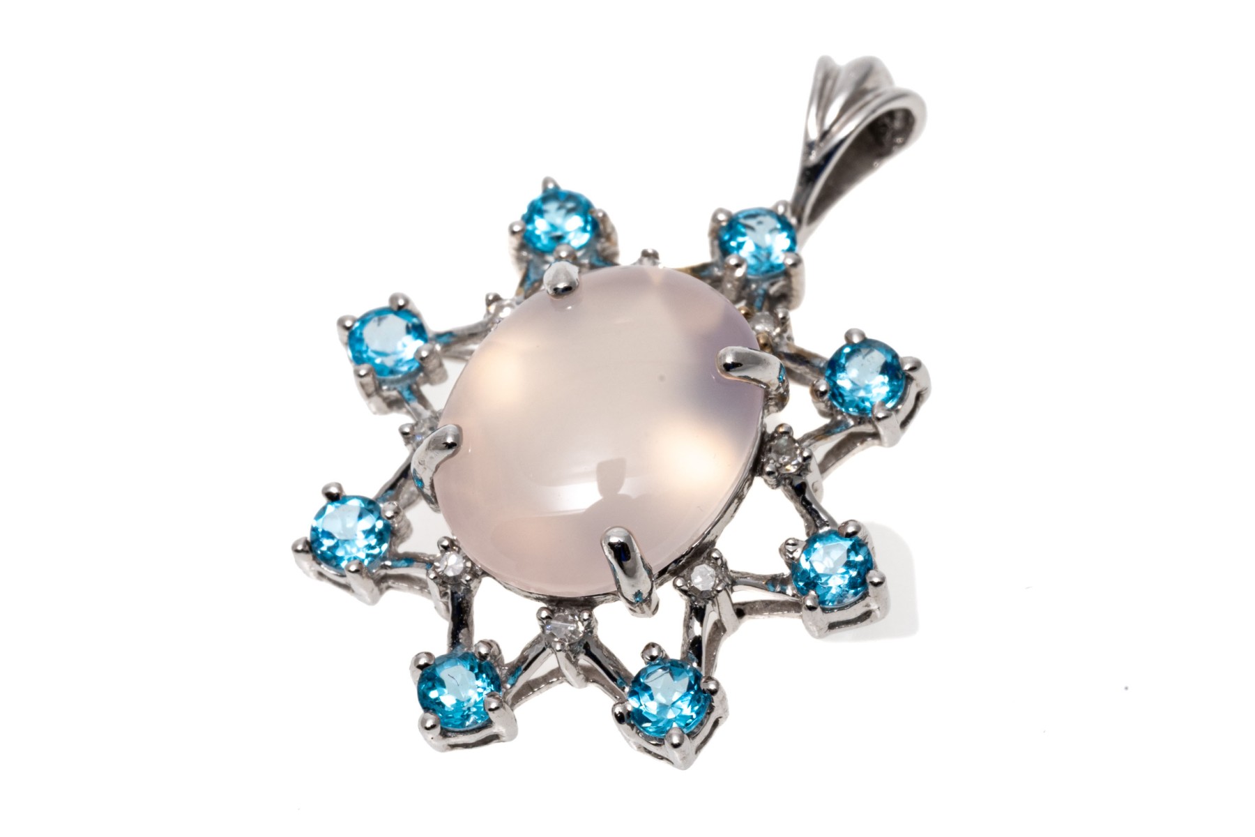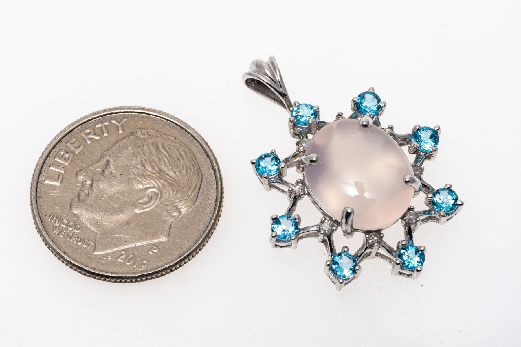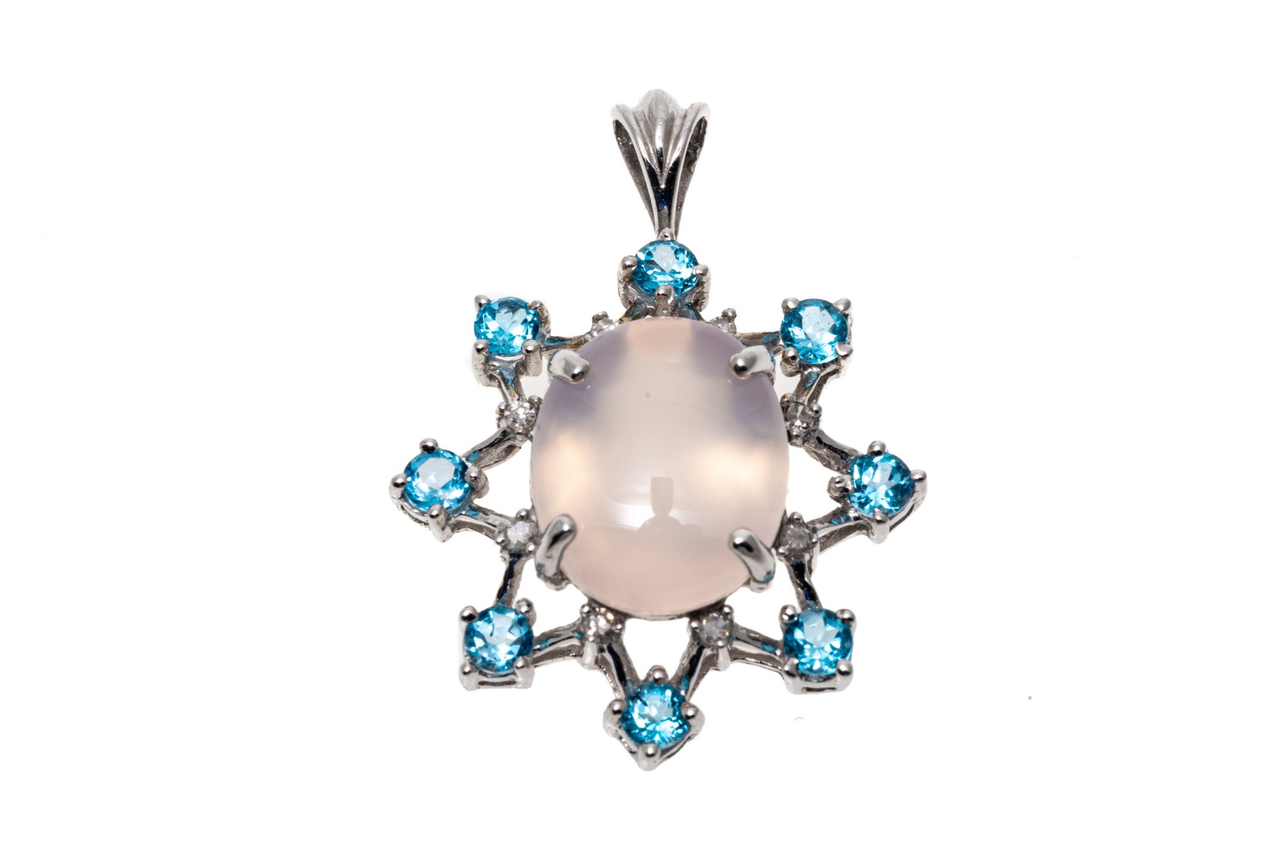 A 10K white gold pendant. The pendant has a starburst design and is set with a single oval cabochon cut light pink chalcedony stone at the center. Framing this are round cut light blue topaz stones.