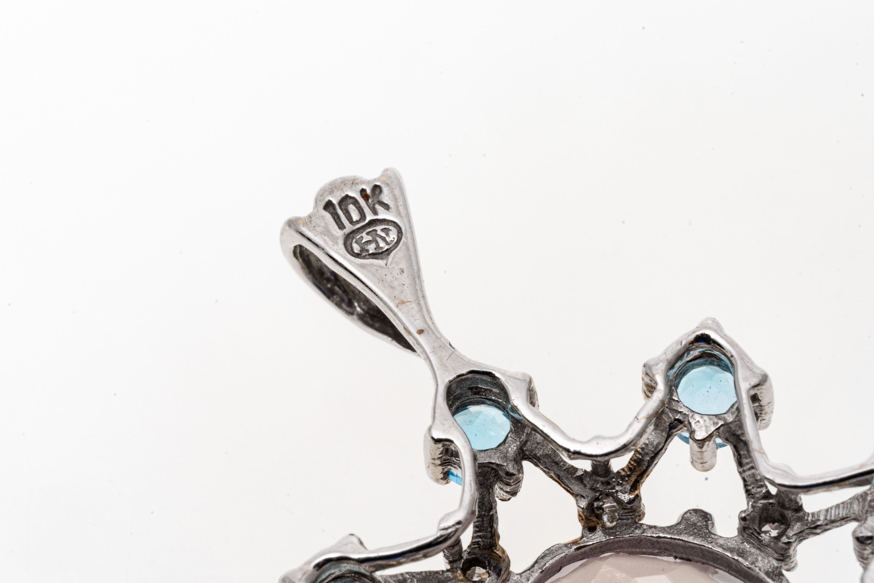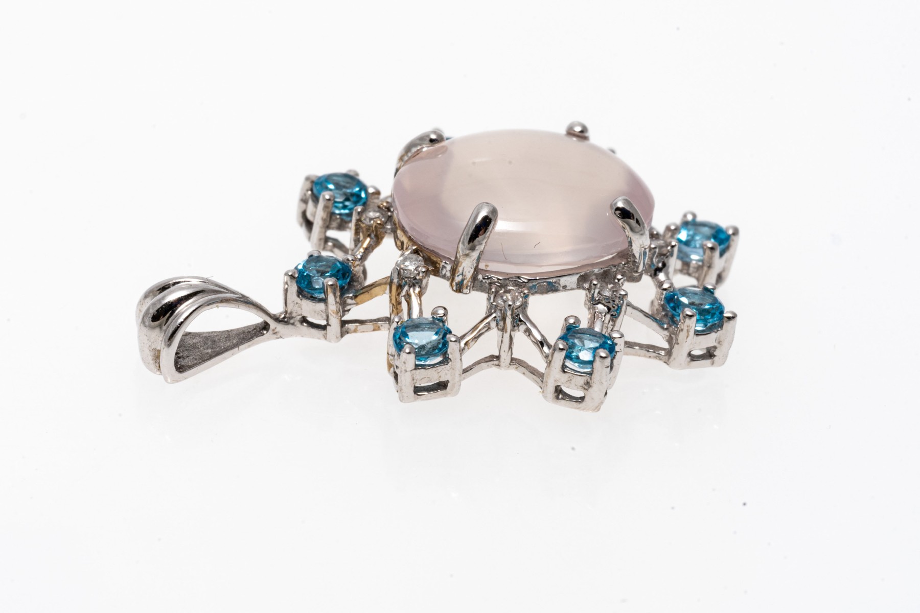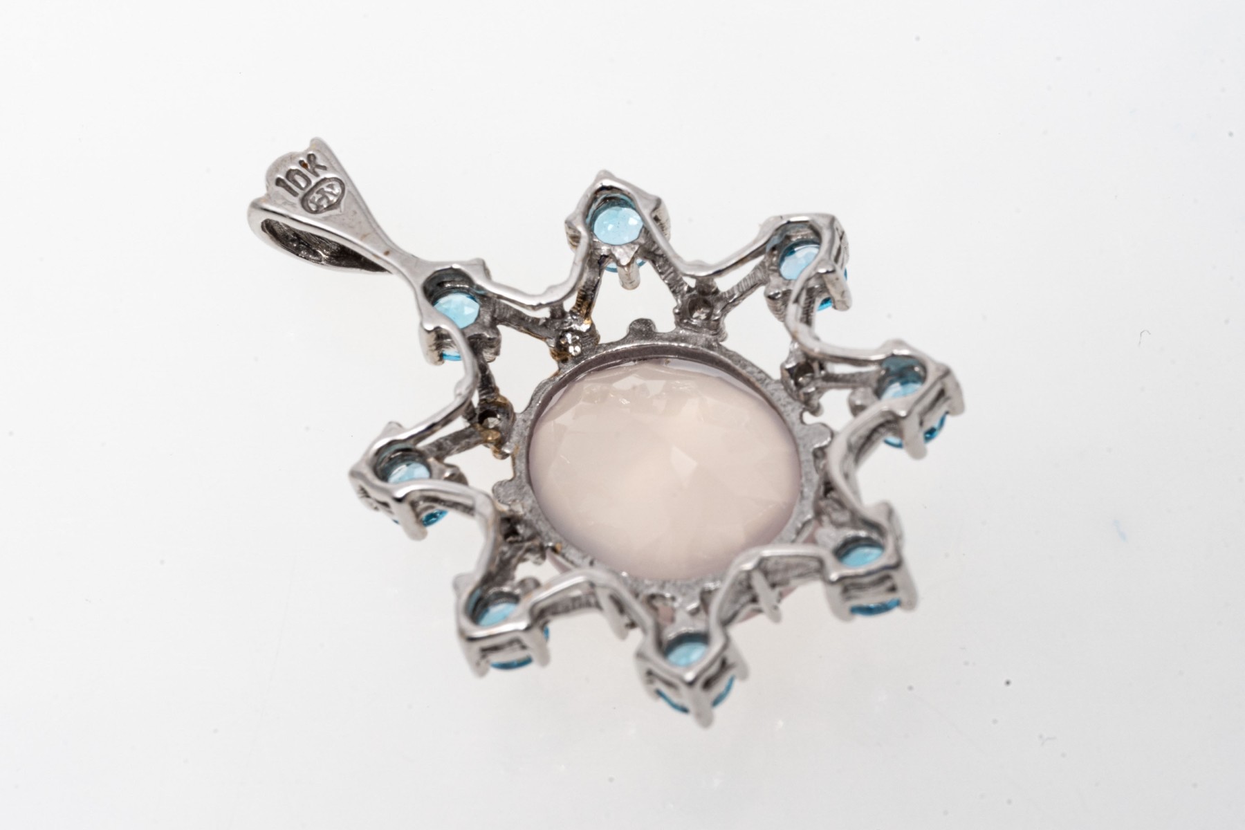 A 10K white gold pendant. The pendant has a starburst design and is set with a single oval cabochon cut light pink chalcedony stone at the center. Framing this are round cut light blue topaz stones.