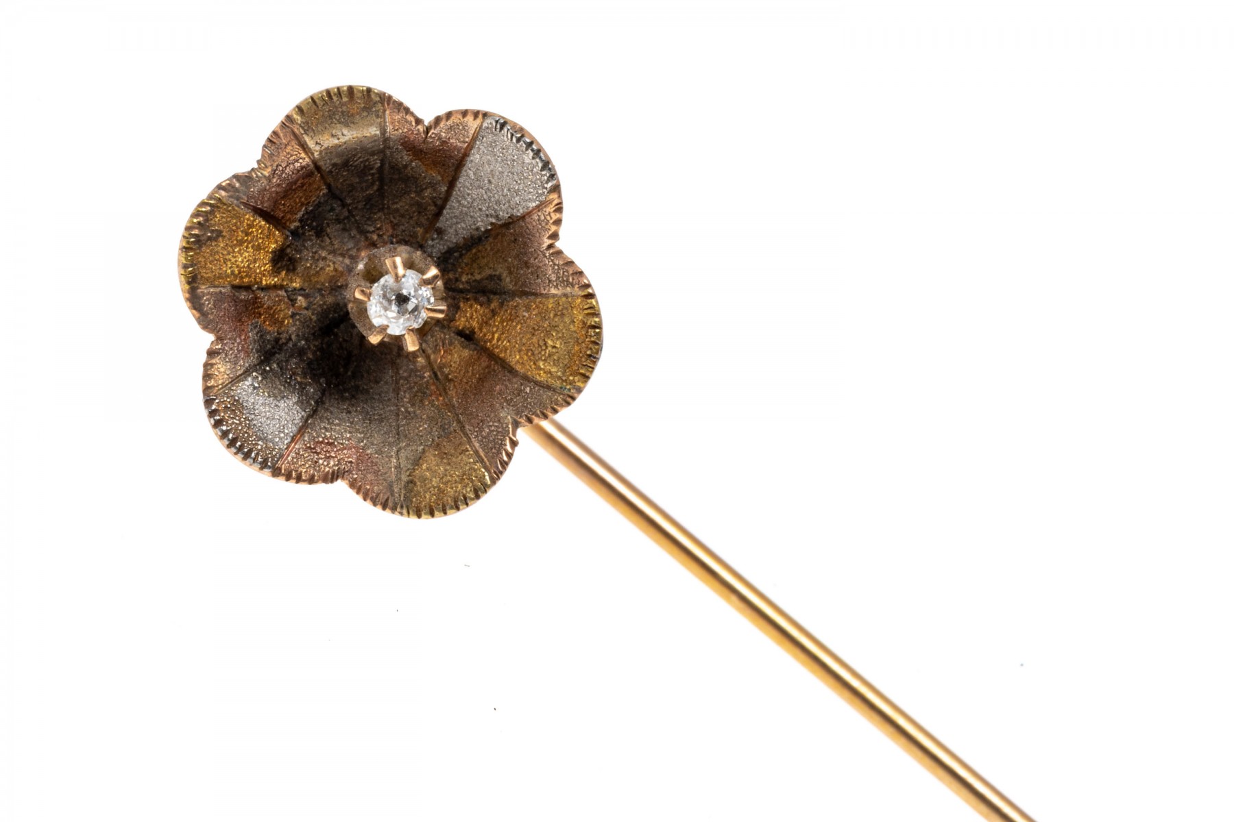 This cheerful stick pin is crafted from 14K yellow gold and display a floral top set with a single diamond at the center, approximately 0.013 cts. The flower has a matte finish and yellow, green and grey color.