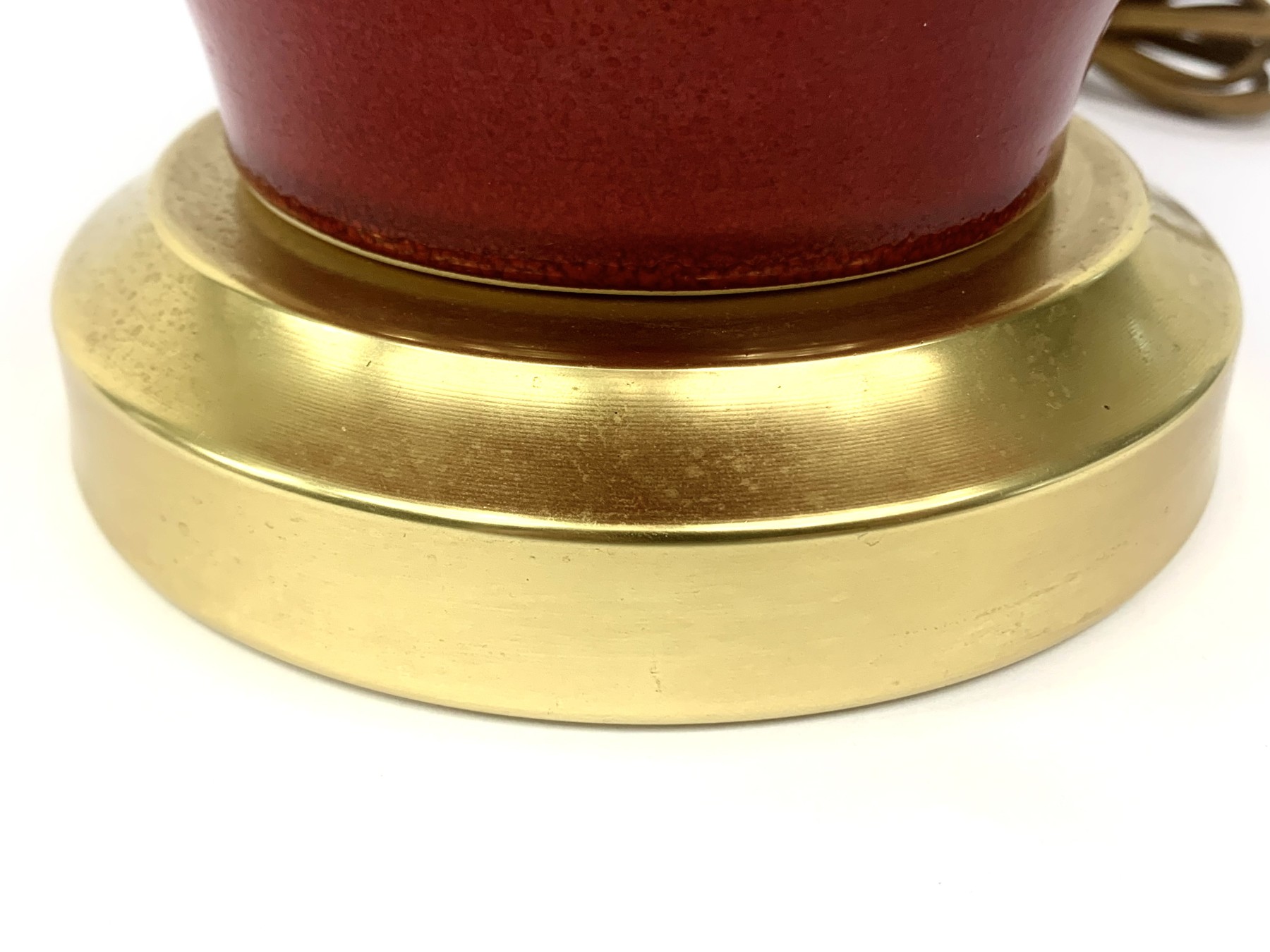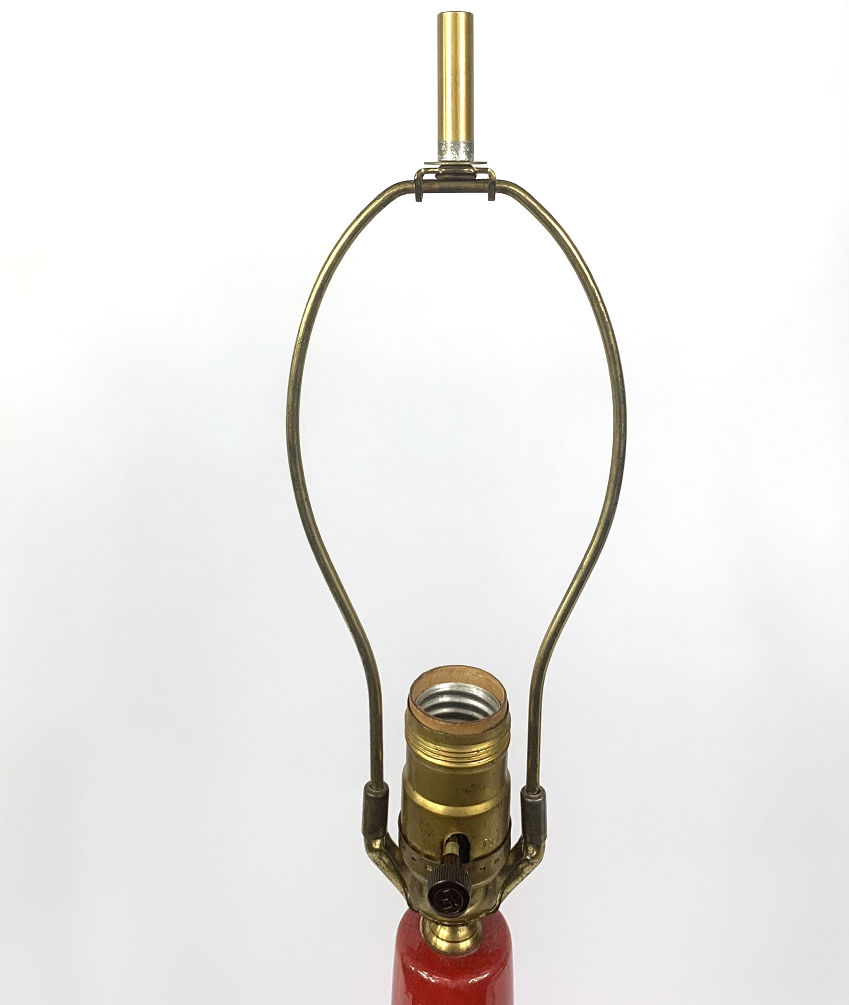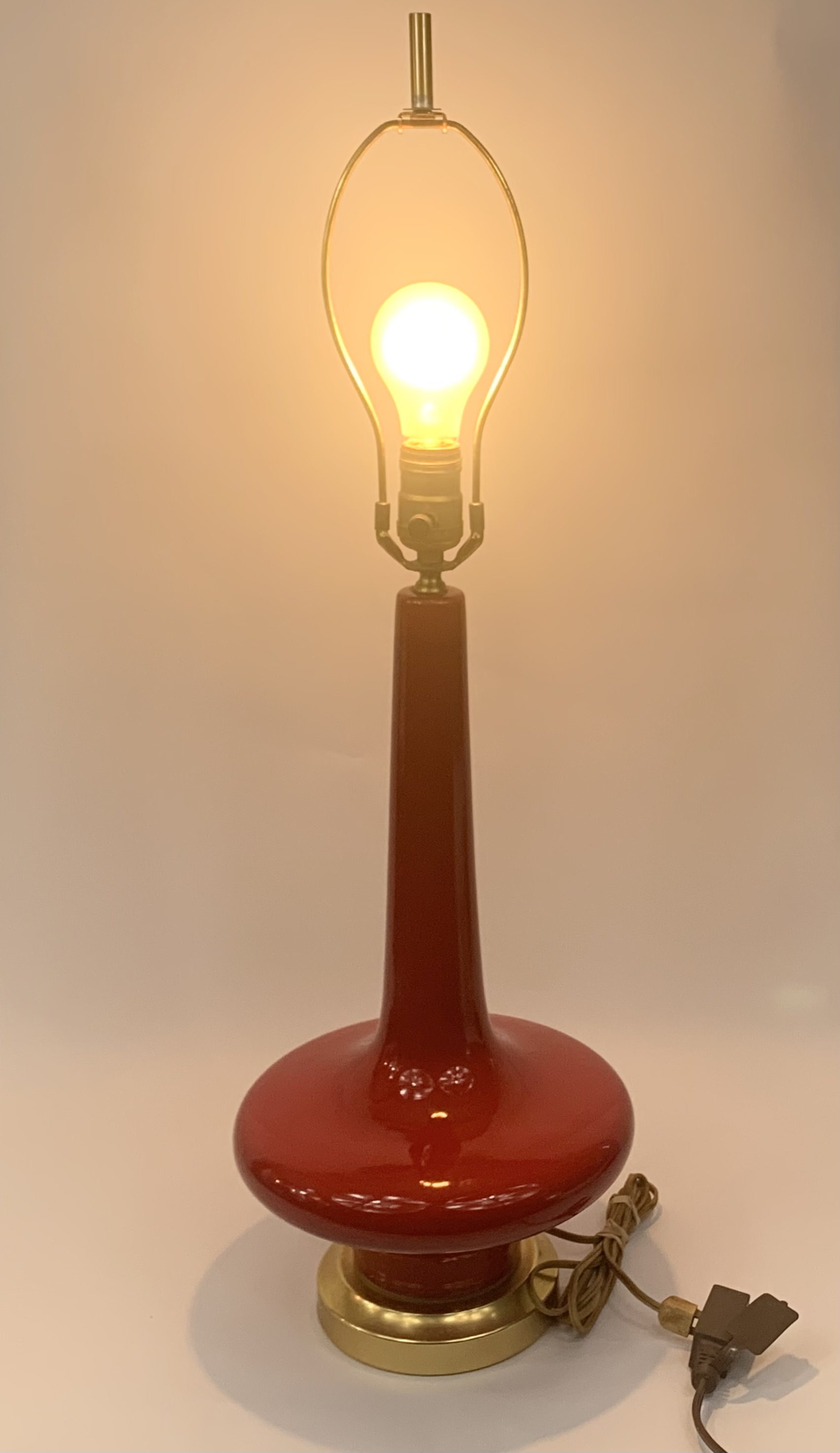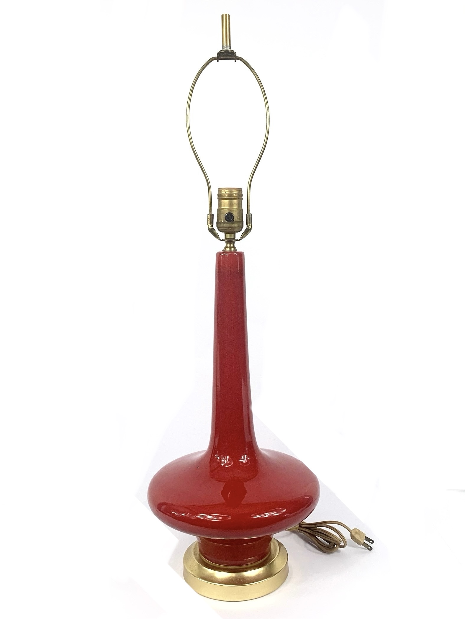 Vintage cherry red ceramic lamp with long neck bottle form, gold base, harp and a cylindrical finial.