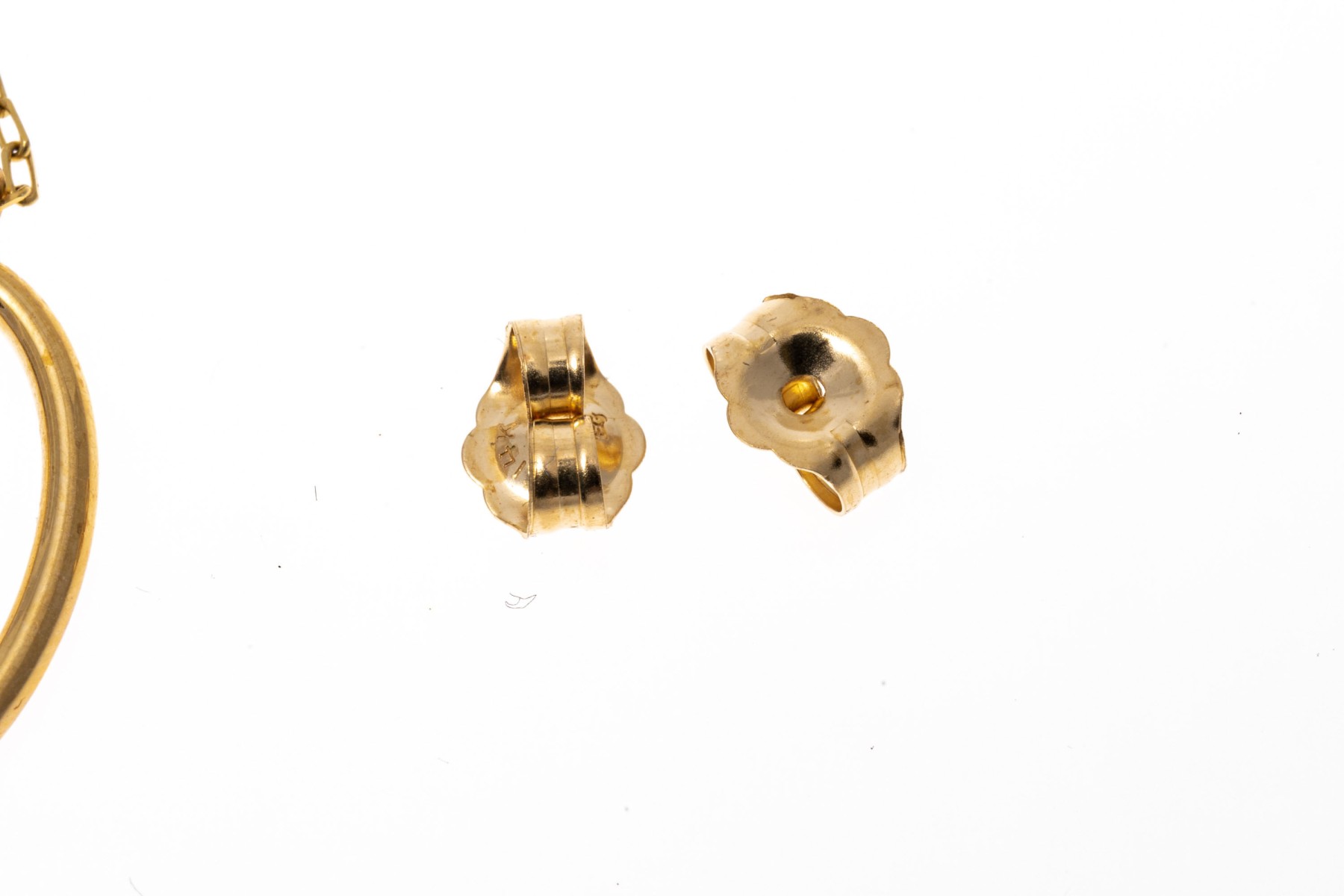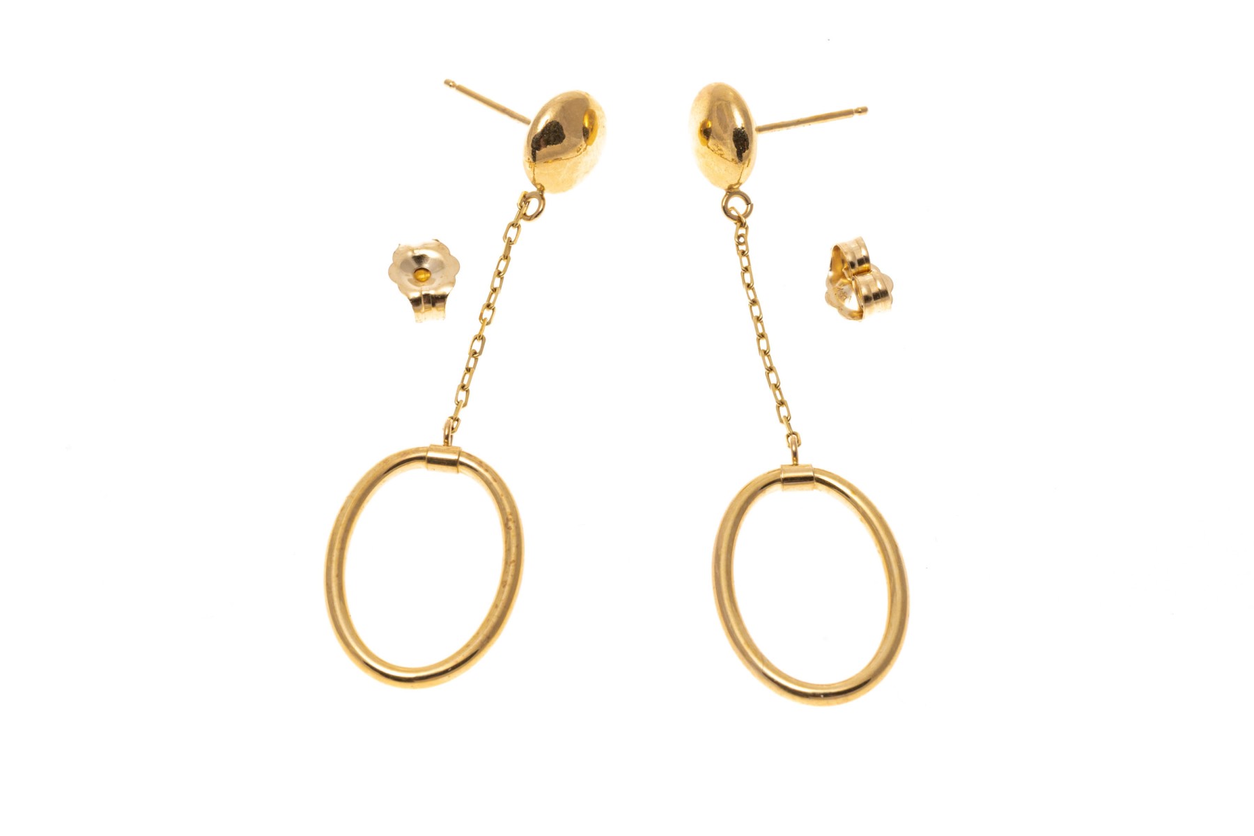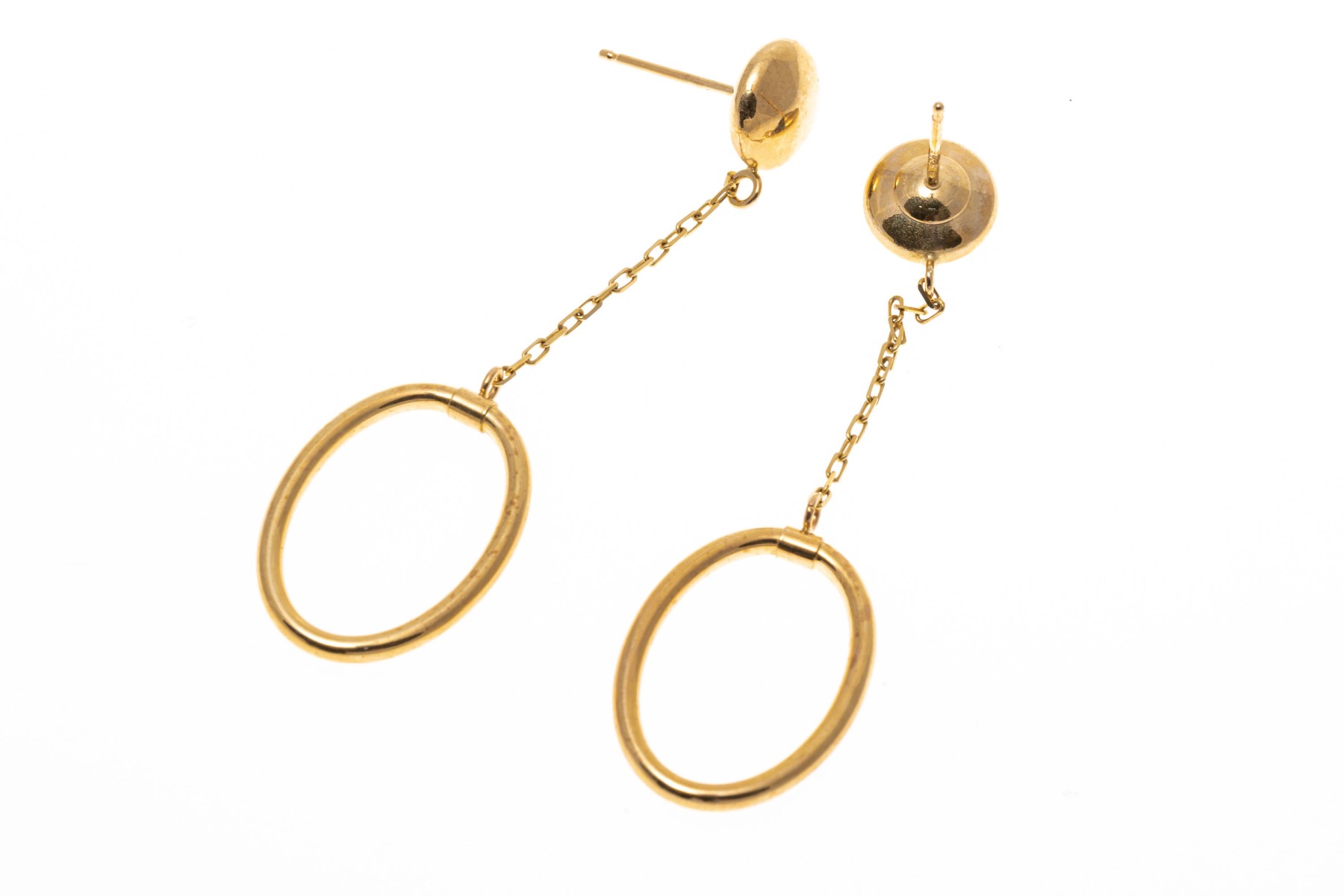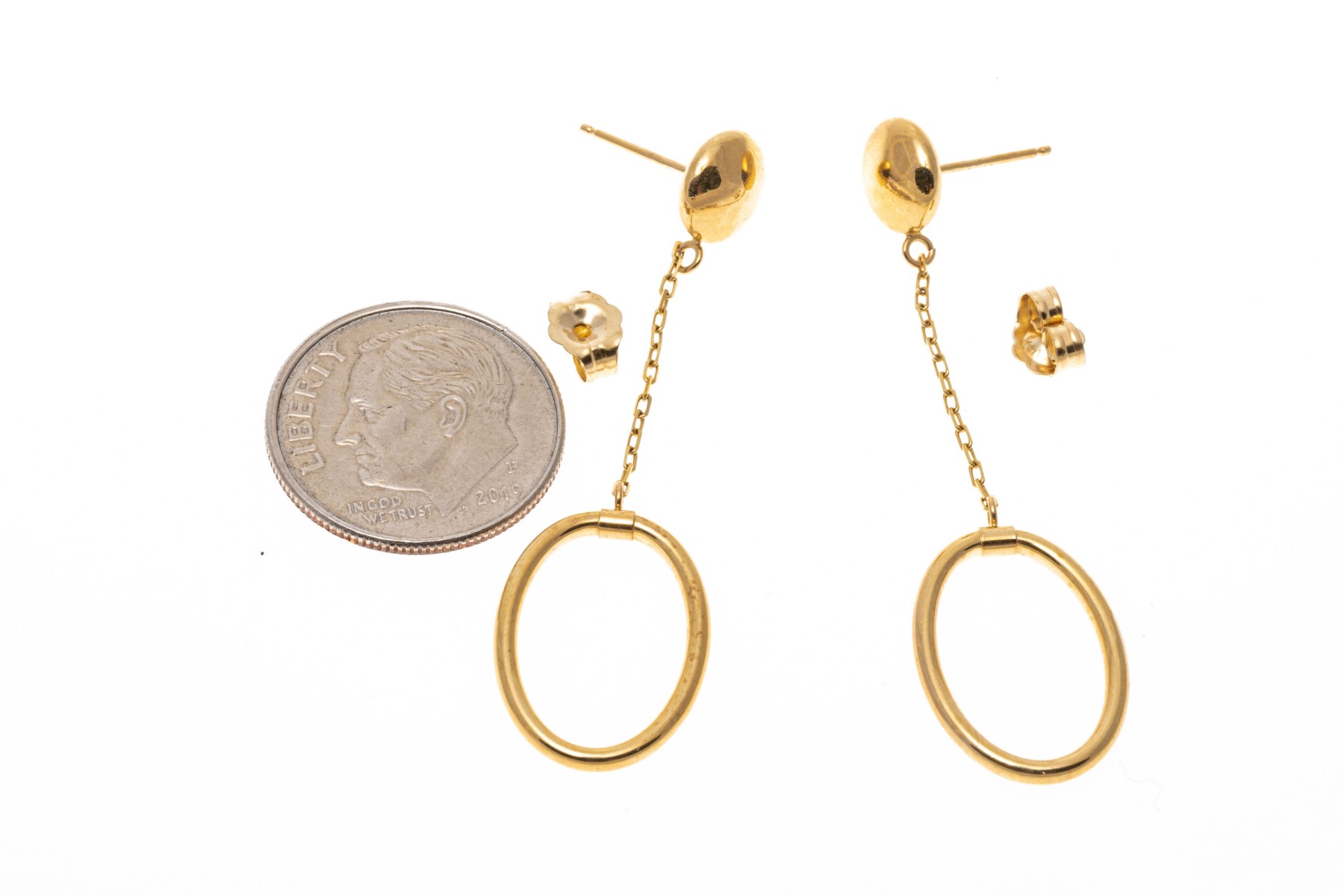 14K yellow gold drop style earrings. Suspended from the top of the earrings is a delicate chain leading to an elongate open hoop pendant. post and clutch backings