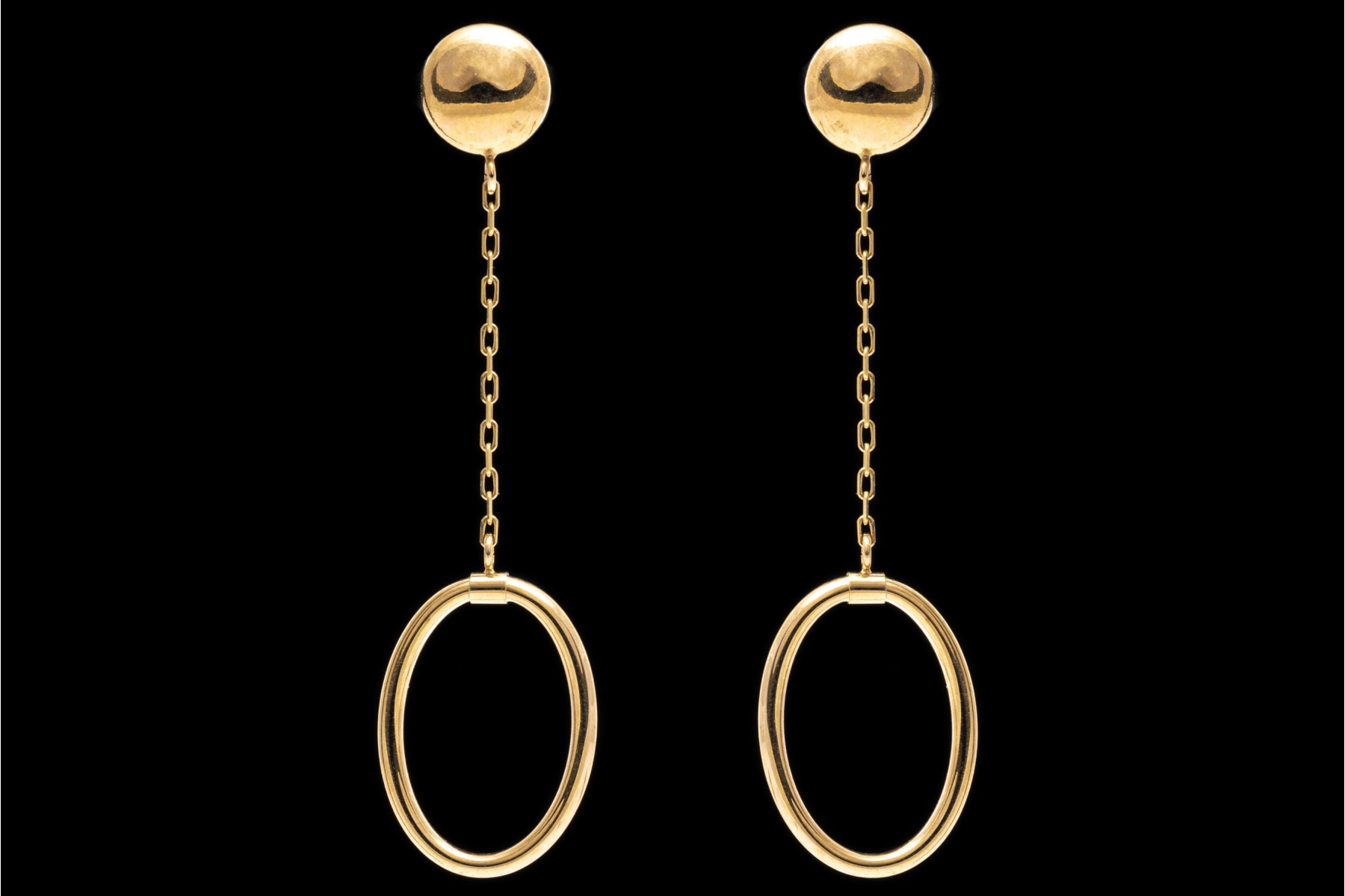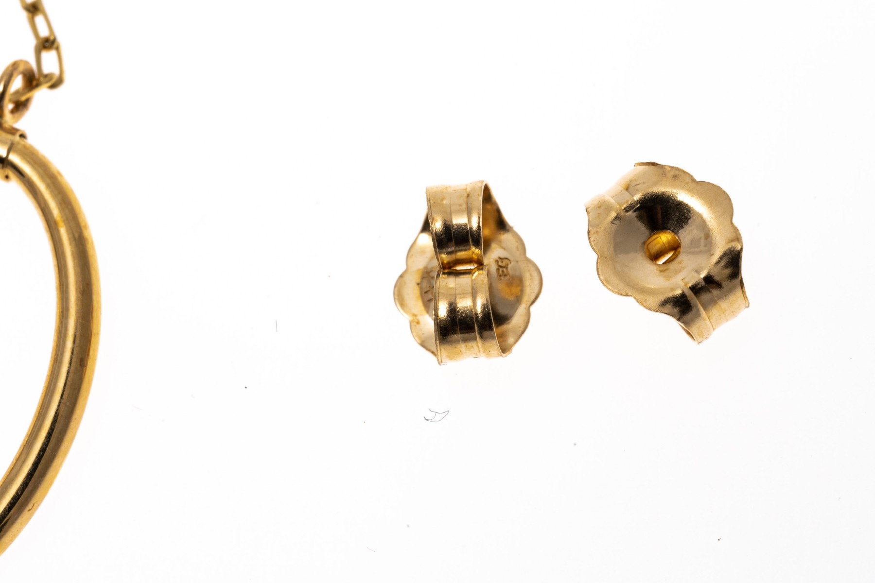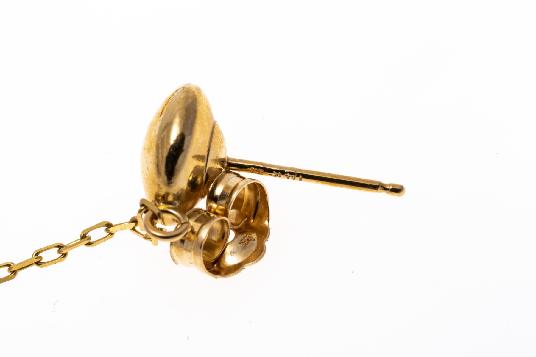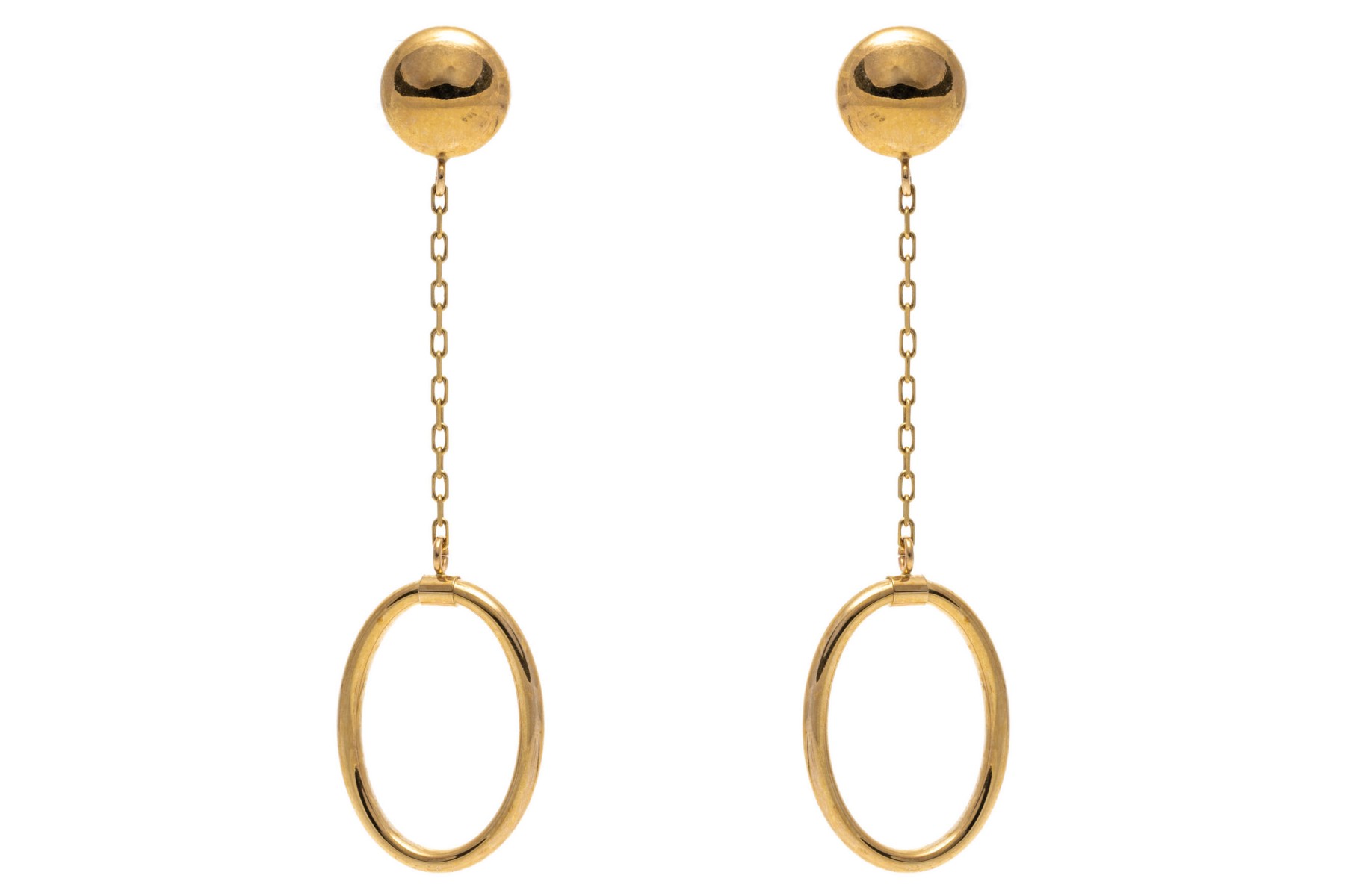 14K yellow gold drop style earrings. Suspended from the top of the earrings is a delicate chain leading to an elongate open hoop pendant. post and clutch backings
