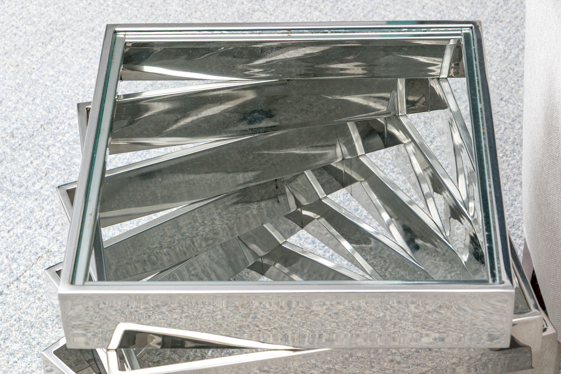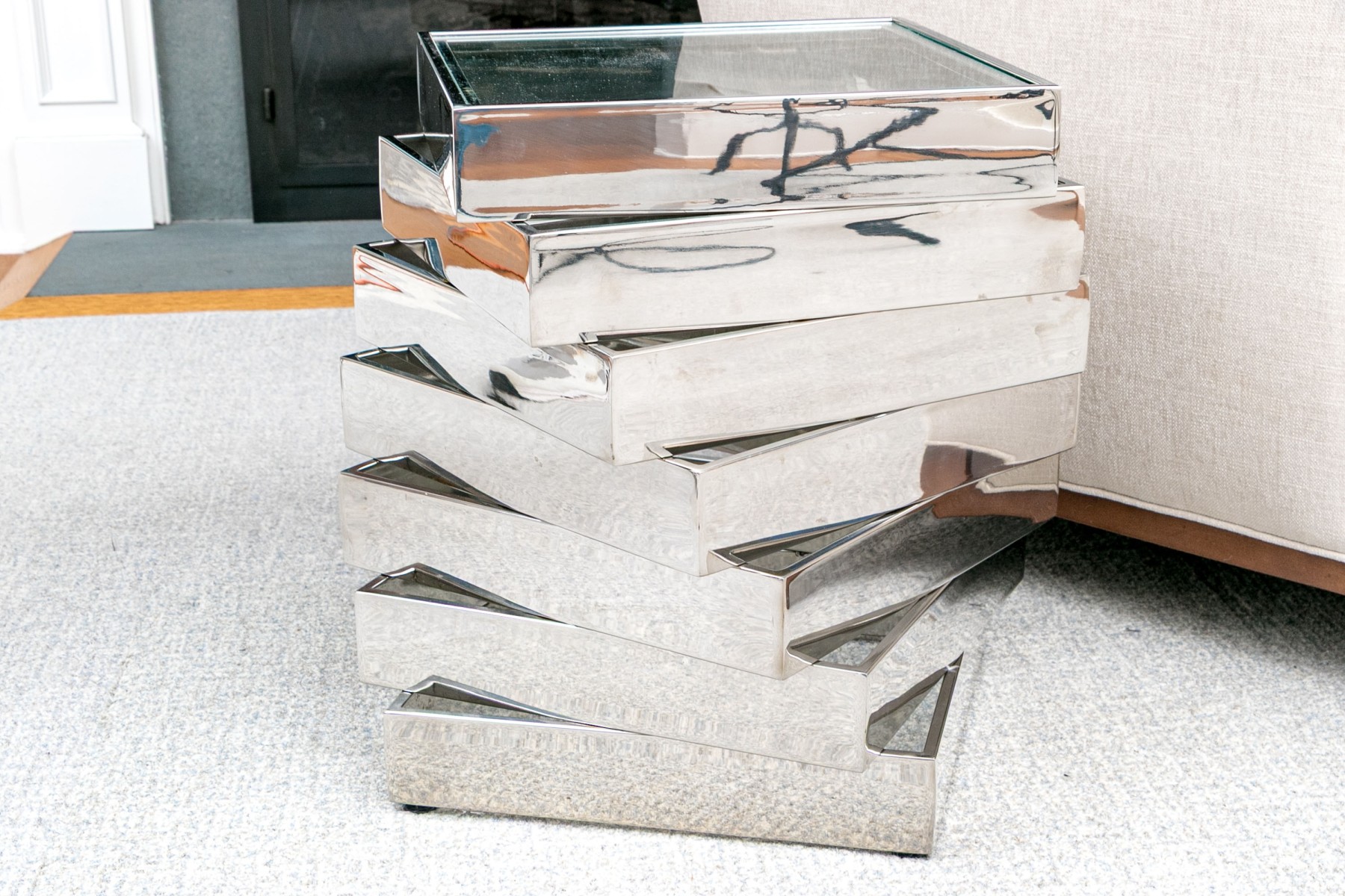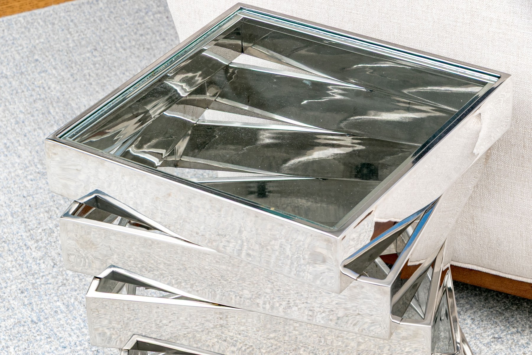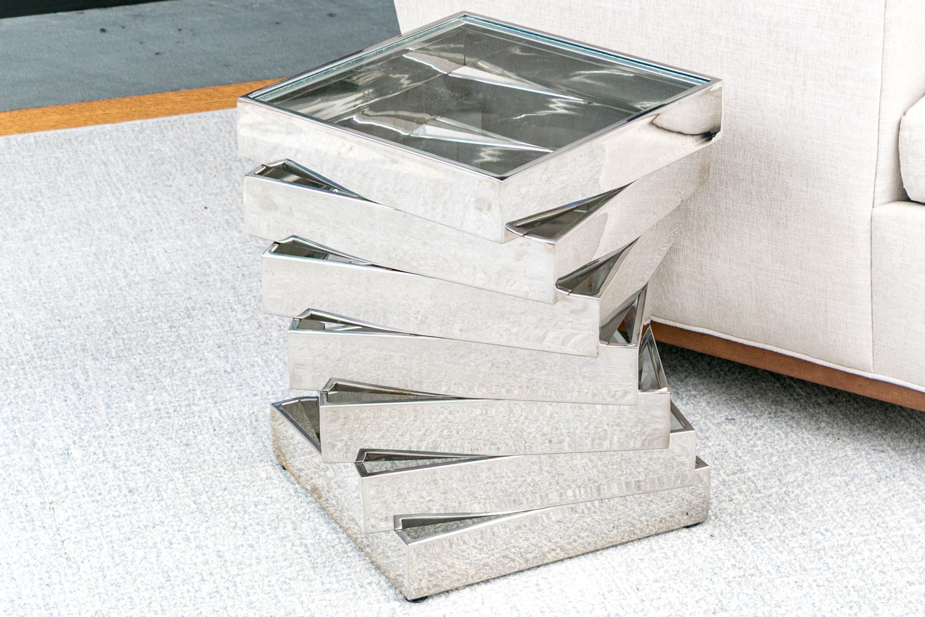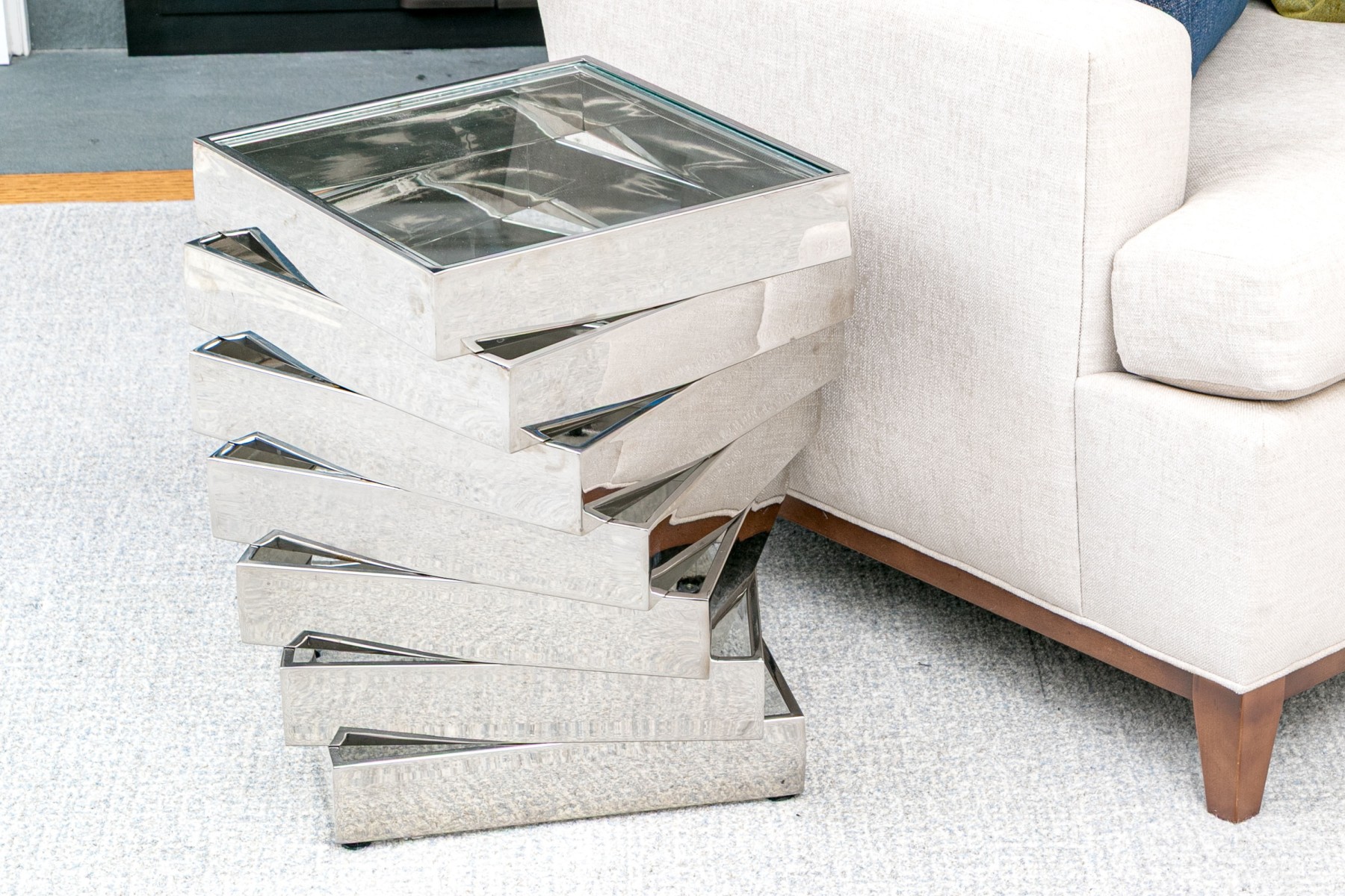 A chic end table with an eye-catching, sculptural quality evoking glamorous mid-century and Hollywood Regency elegance with a spiraling stacked design of seven square tiers leading to a glass framed top.