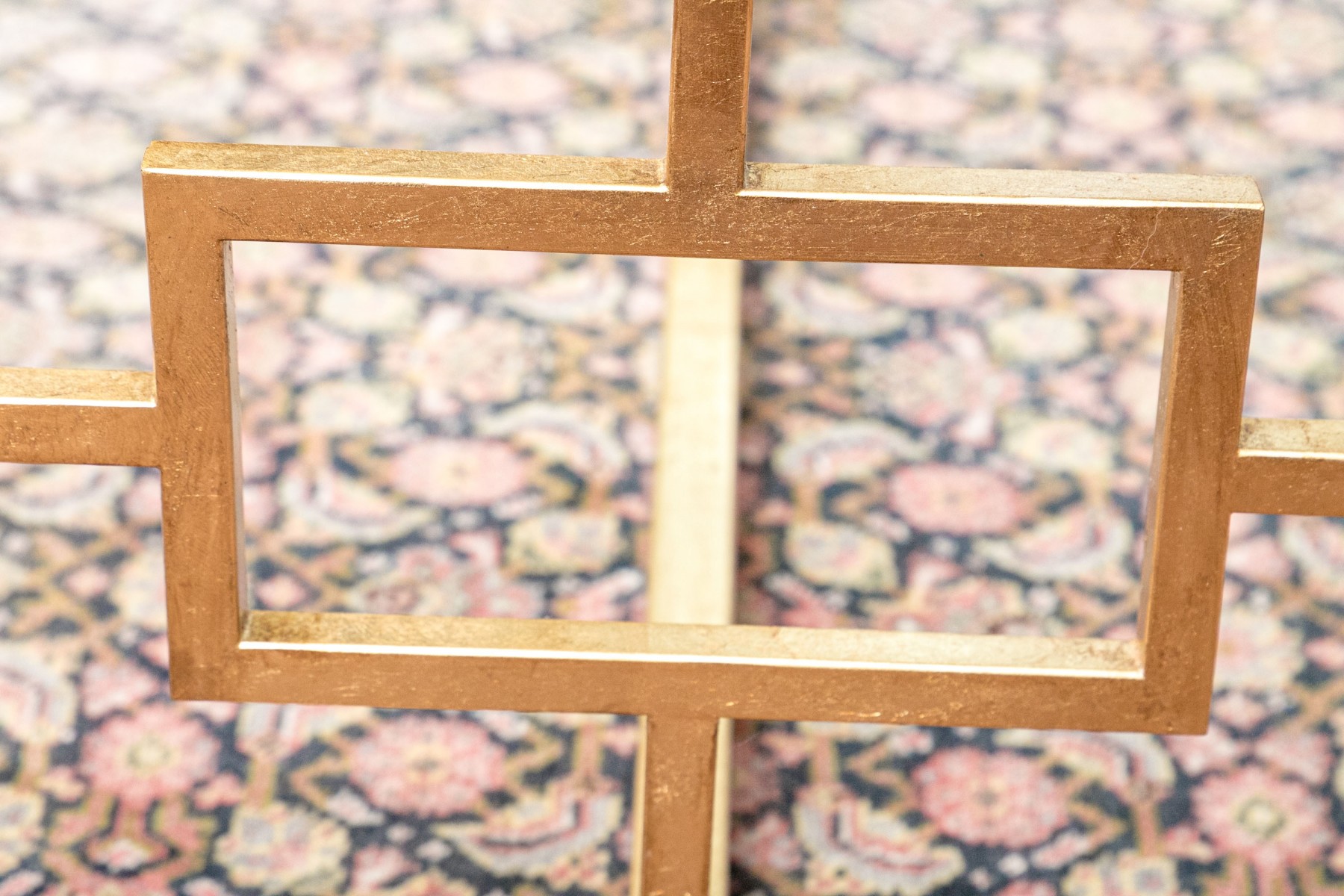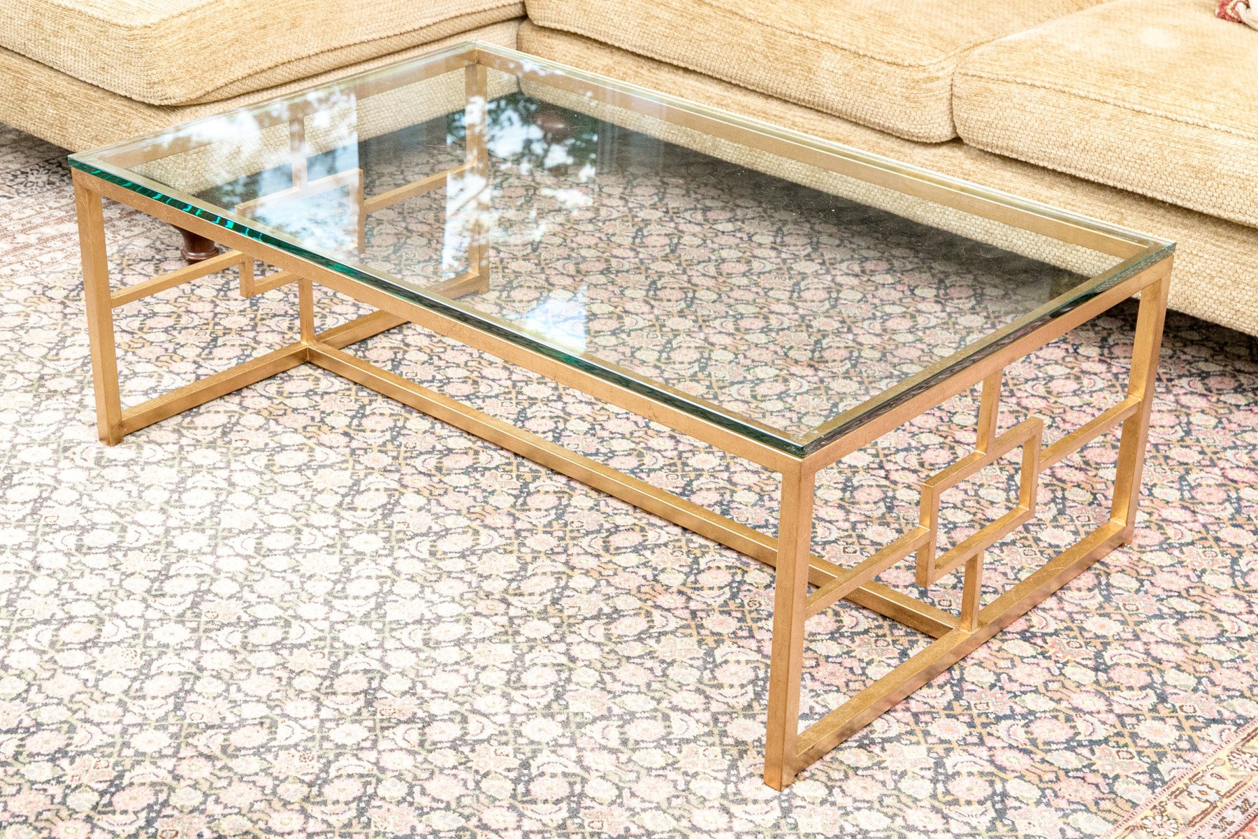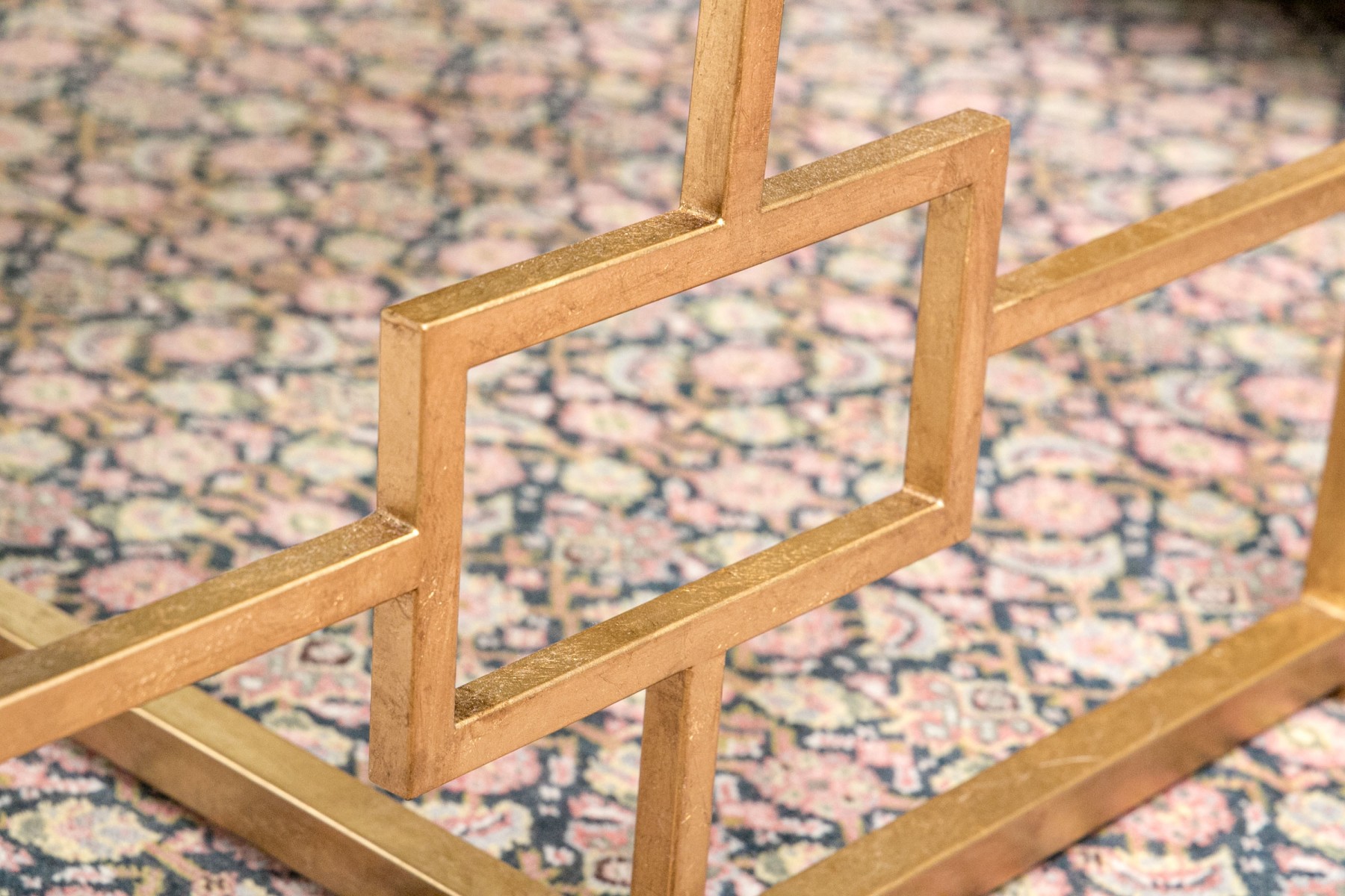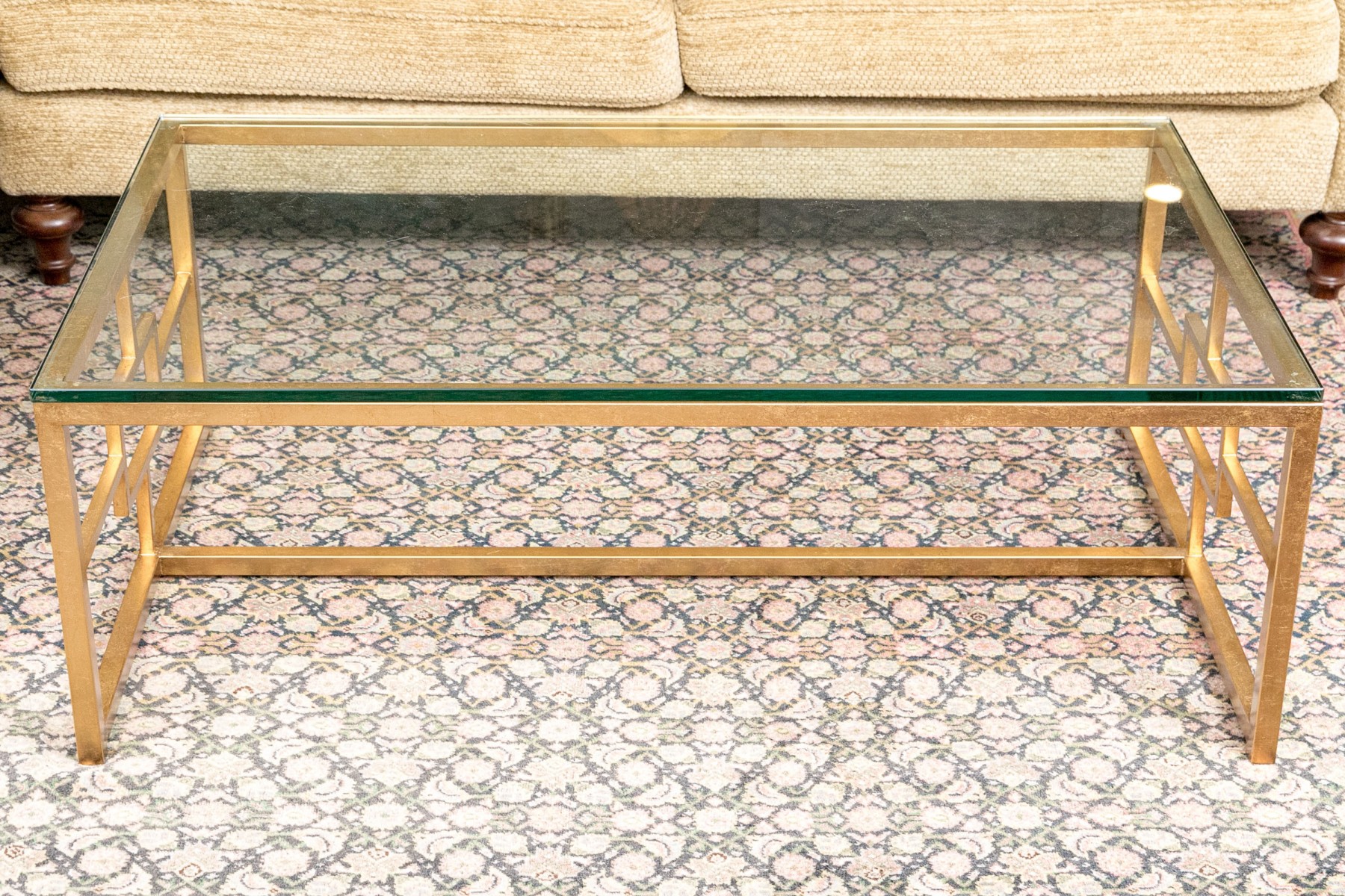 Contemporary chic gilt finished metal framed trestle form cocktail table with glass top.