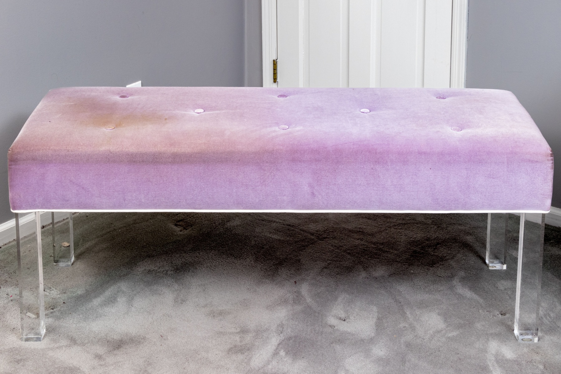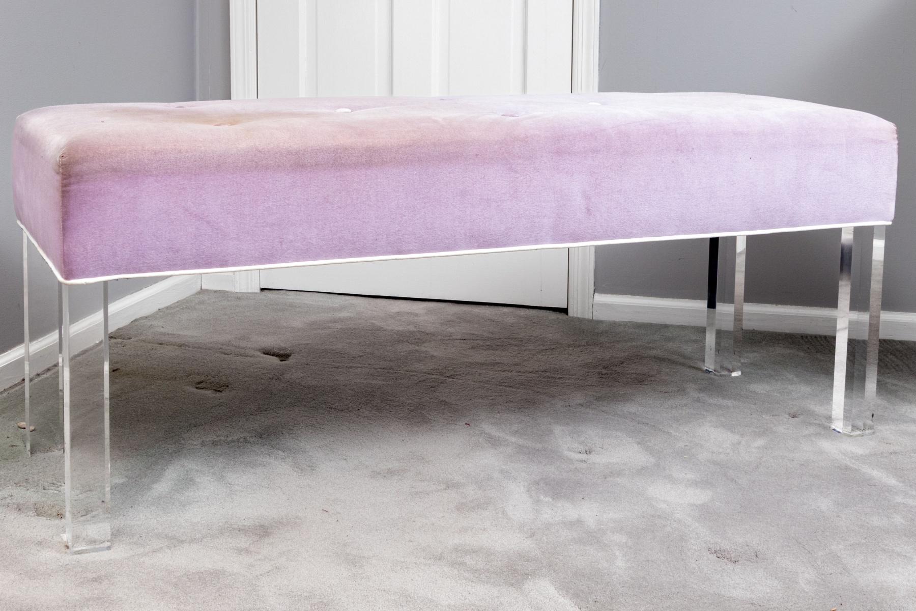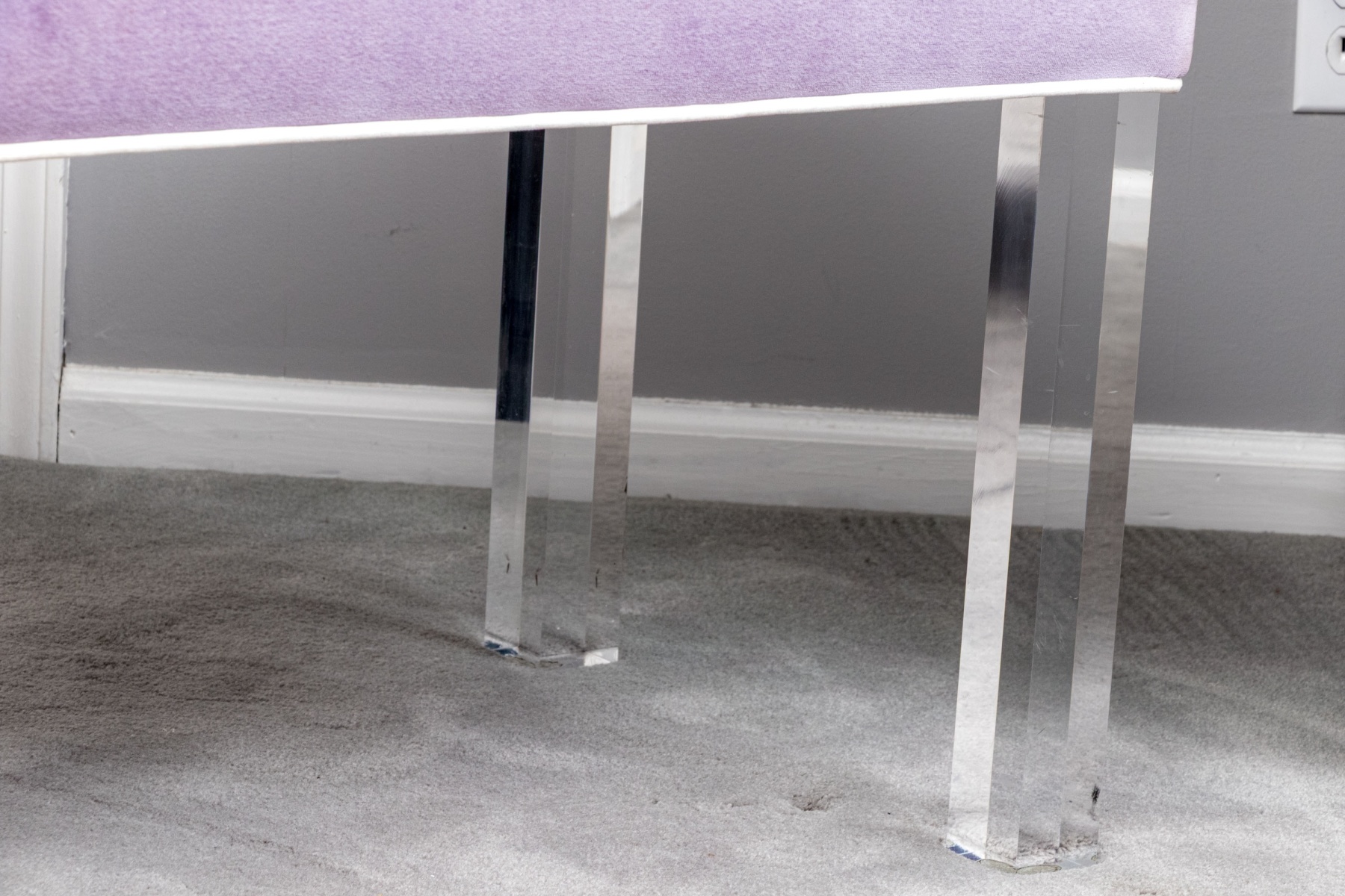 A chic window or bed end bench with a great touch of Hollywood Regency glamor, custom upholstered and button tufted in pale purple mochair and finished with a white piped trim over rectangular clear acrylic legs.