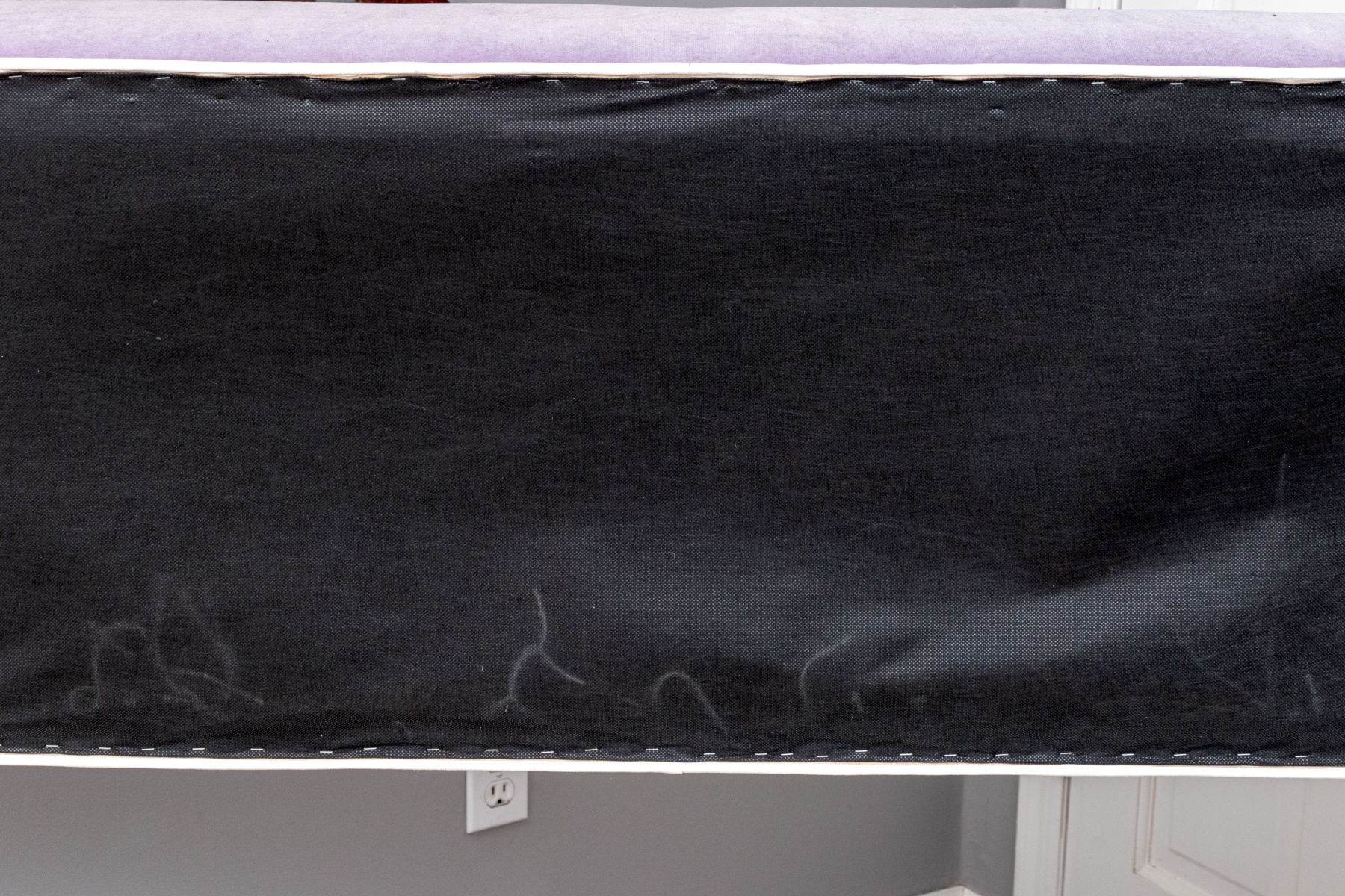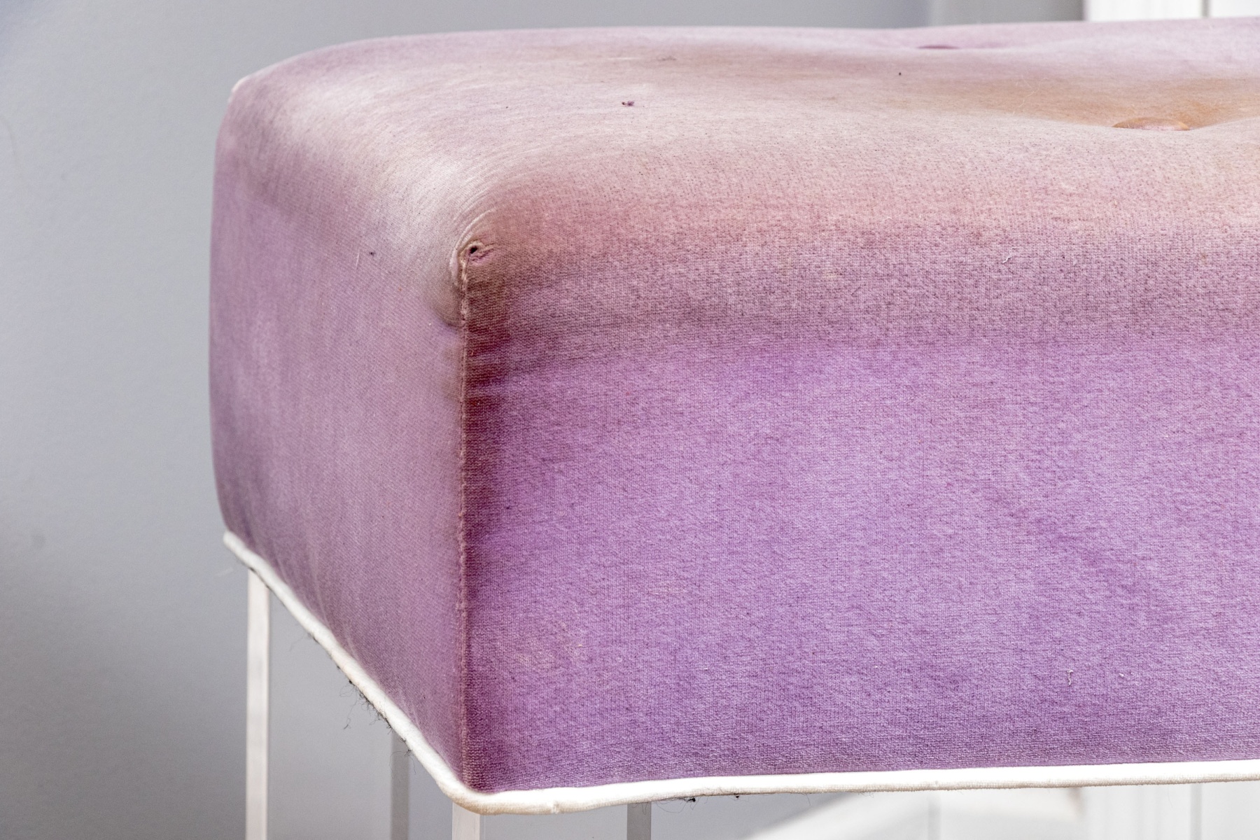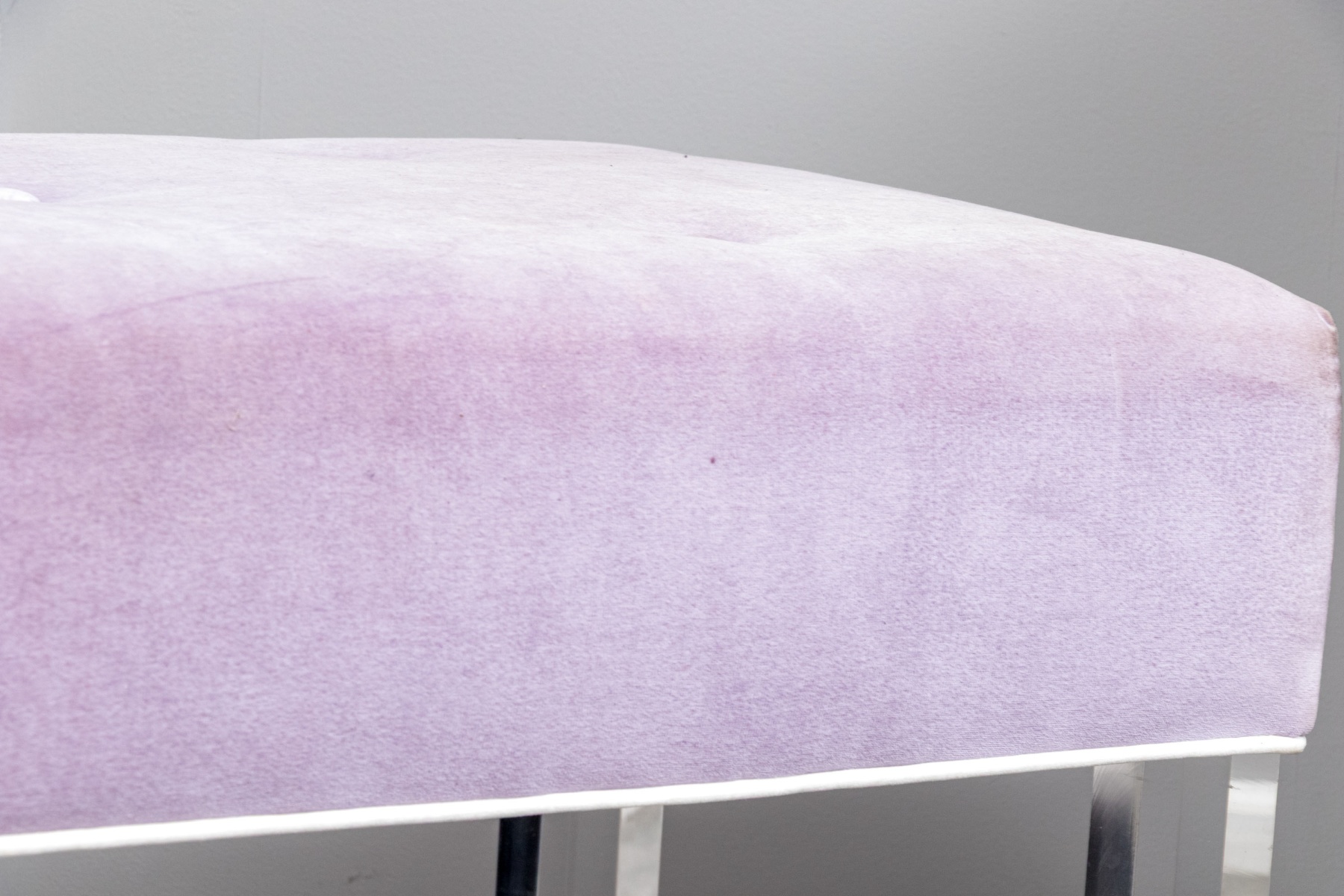 A chic window or bed end bench with a great touch of Hollywood Regency glamor, custom upholstered and button tufted in pale purple mochair and finished with a white piped trim over rectangular clear acrylic legs.