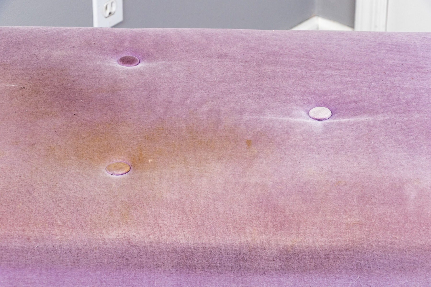 Some stains and discolored portions of the fabric commensurate with use. The frame is sturdy and stylish.