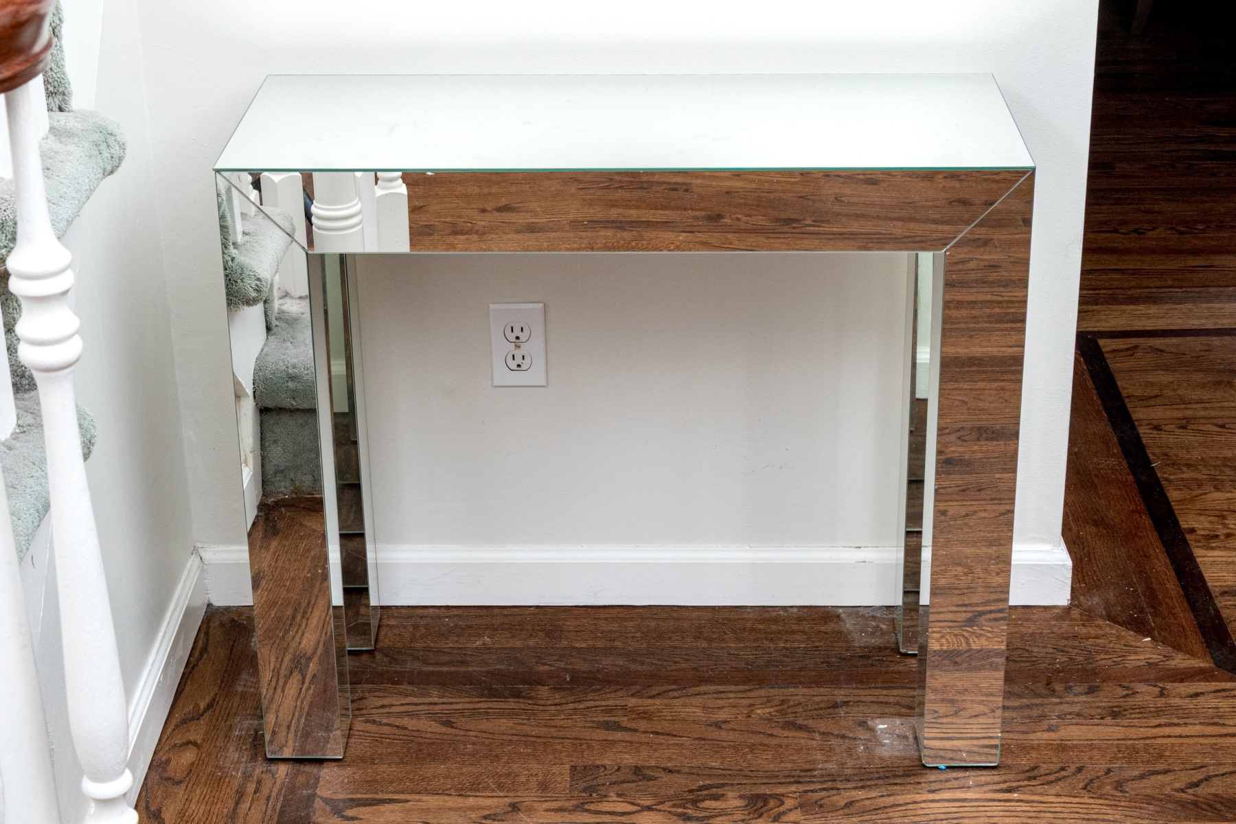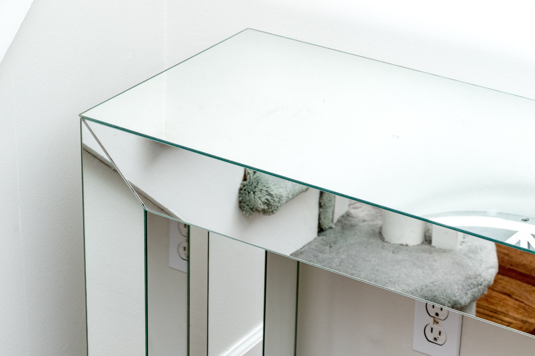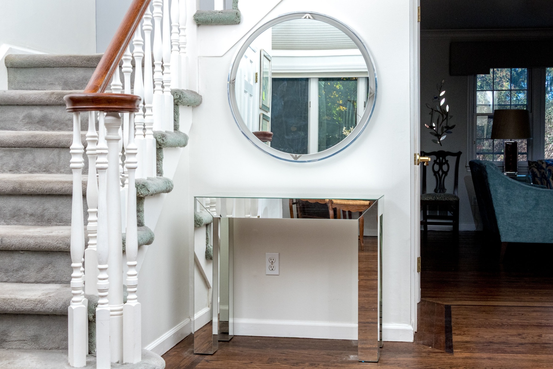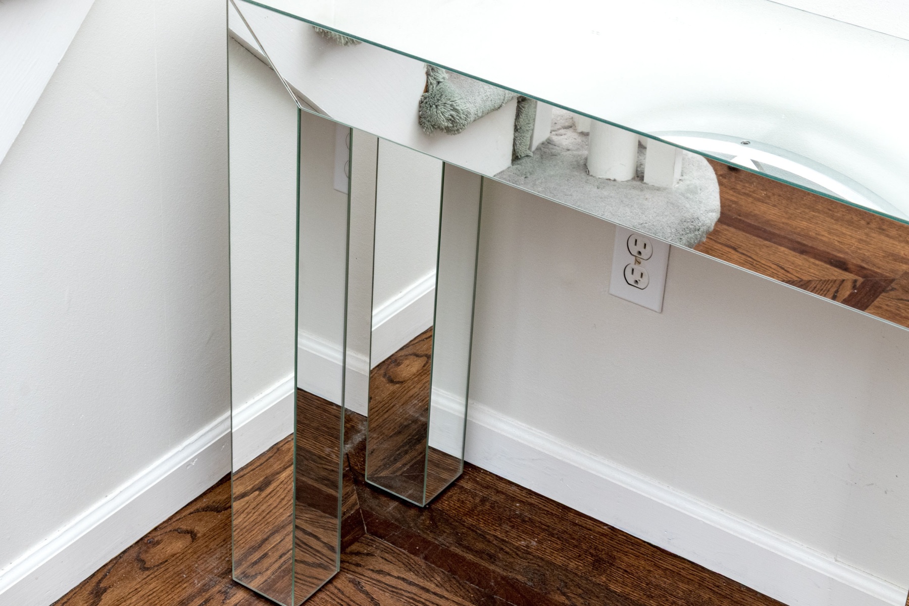 A delightful duo of hallway furniture including a large circular mirror floating in a chrome frame with stylish triangular motifs, accompanied by a chic console with a minimalist rectangular profile mirrored on all surfaces.