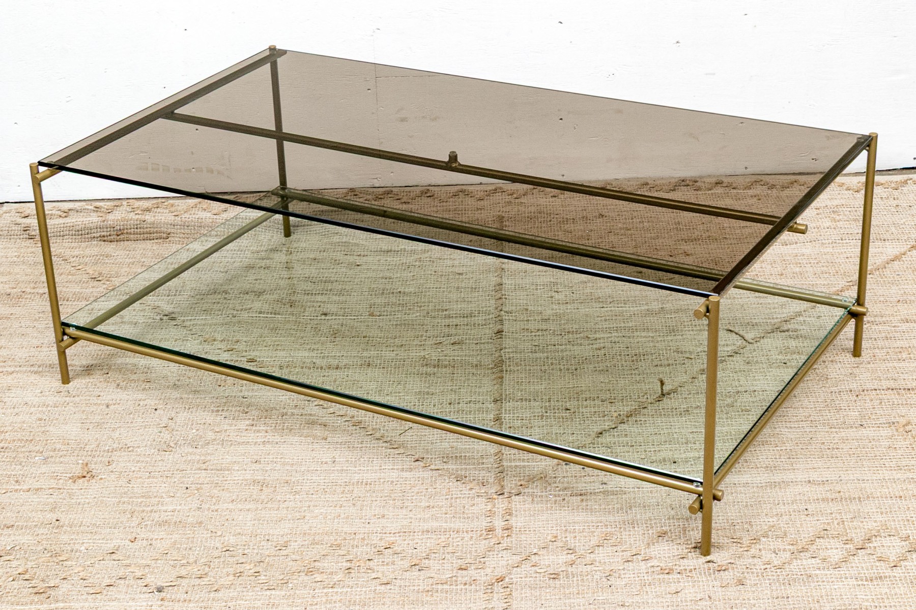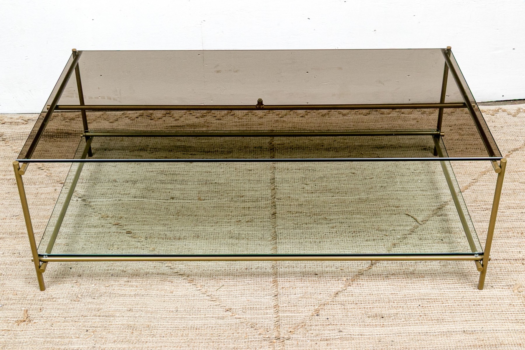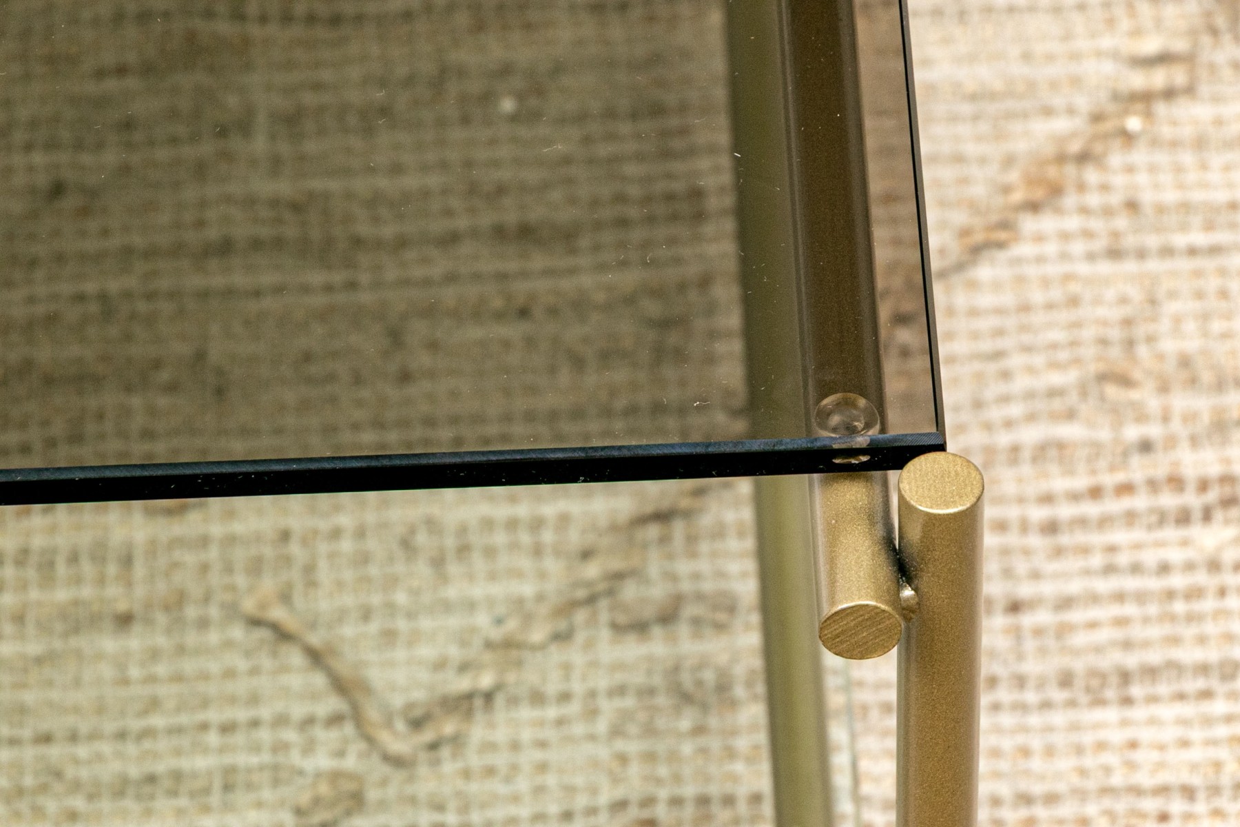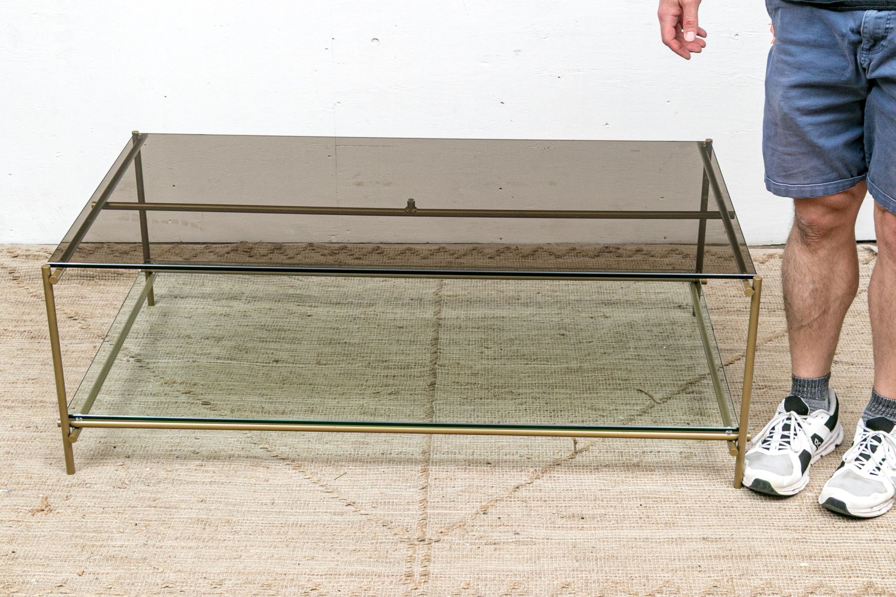On four feet with stretcher supports and a trestle stretcher under the table top. The table with a translucent glass lower tiered shelf and a smoky glass table top.