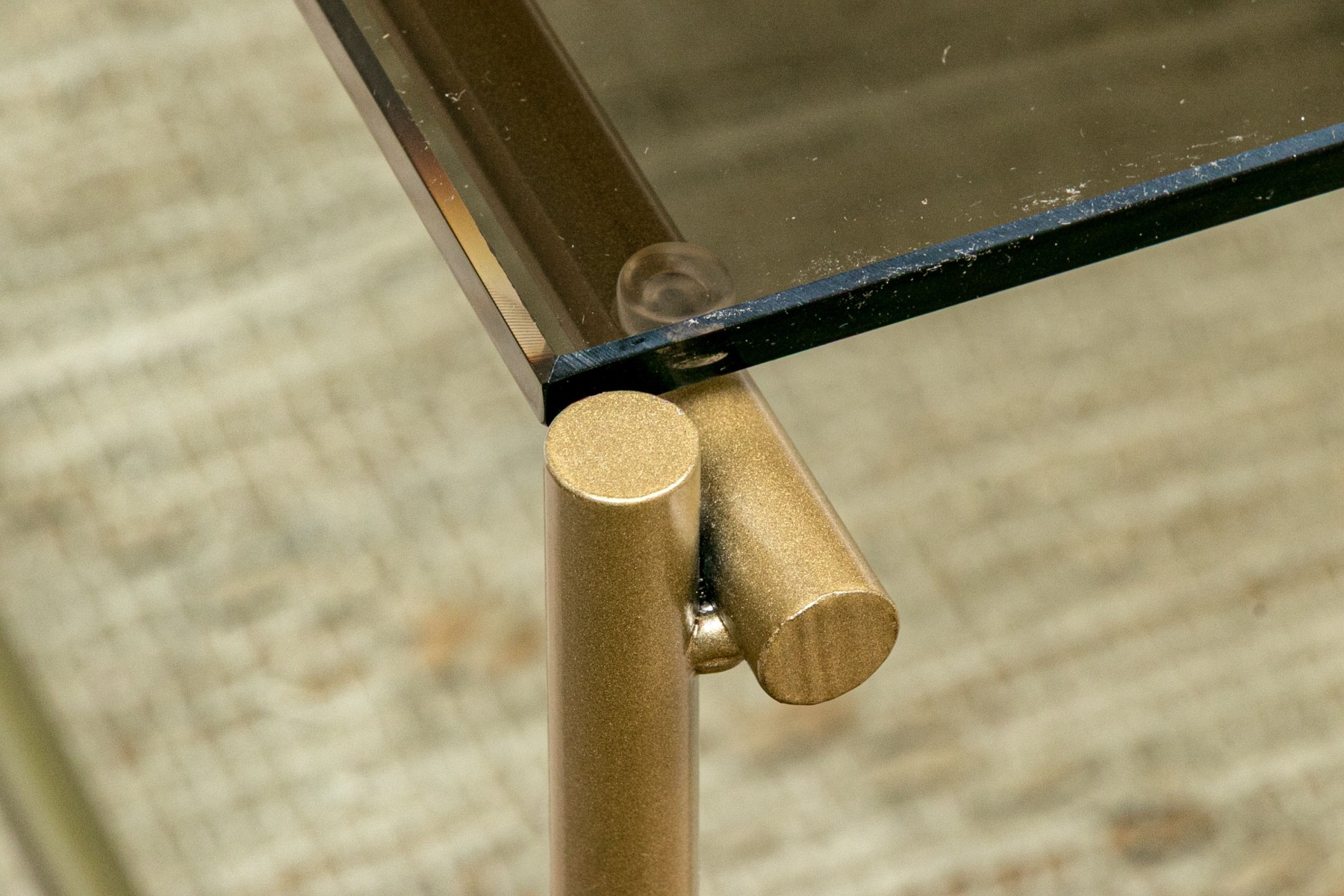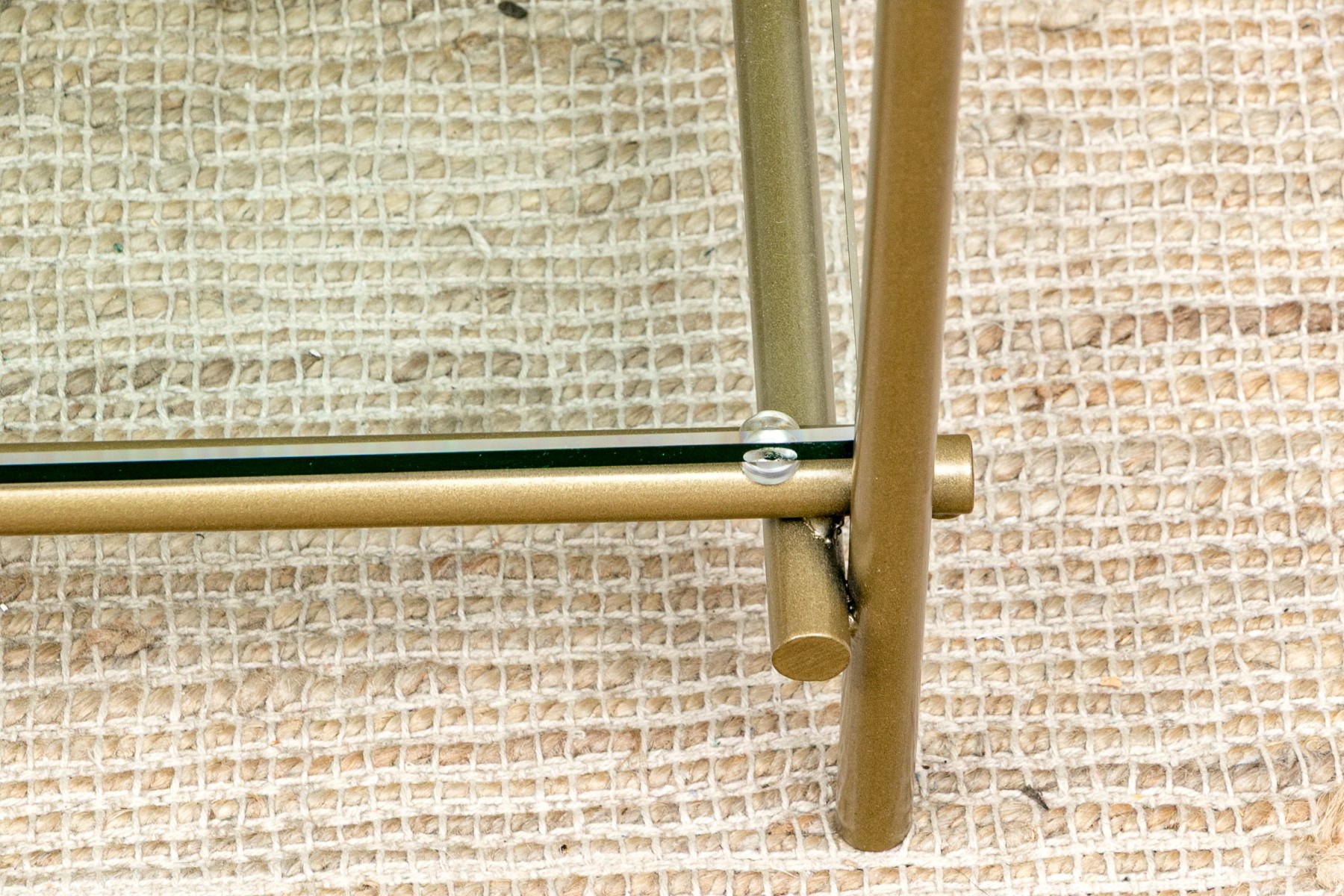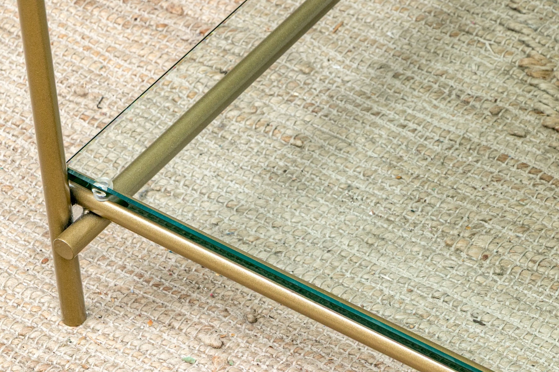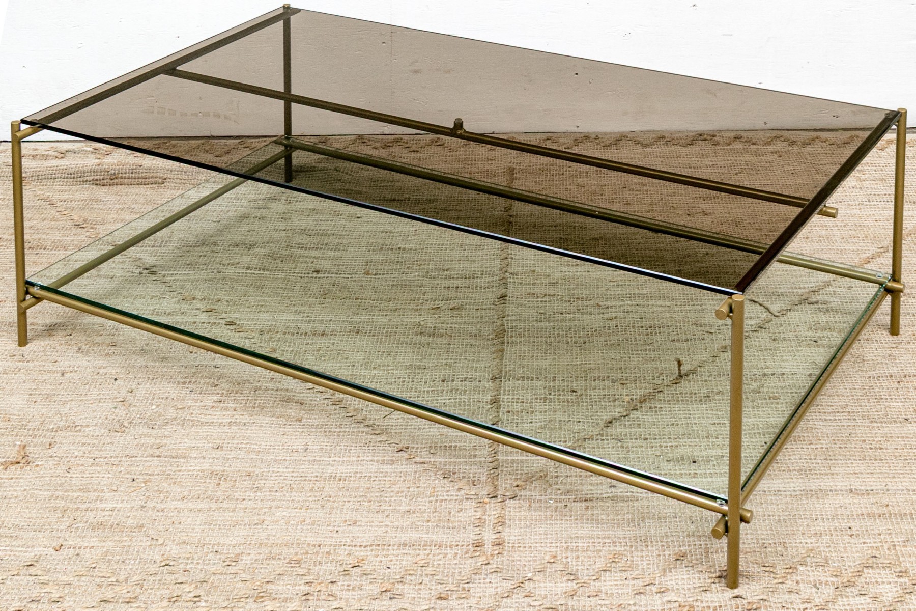 On four feet with stretcher supports and a trestle stretcher under the table top. The table with a translucent glass lower tiered shelf and a smoky glass table top.