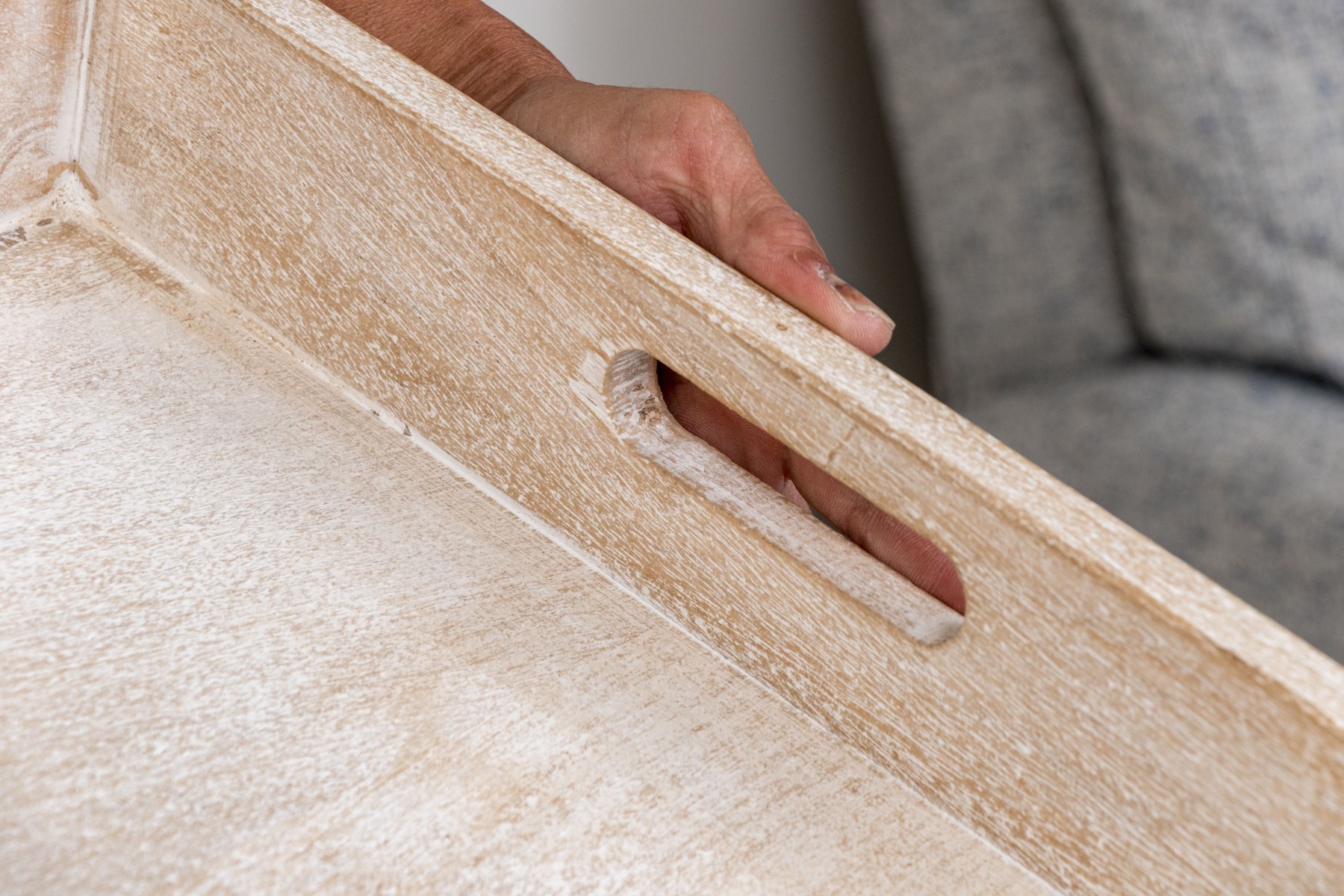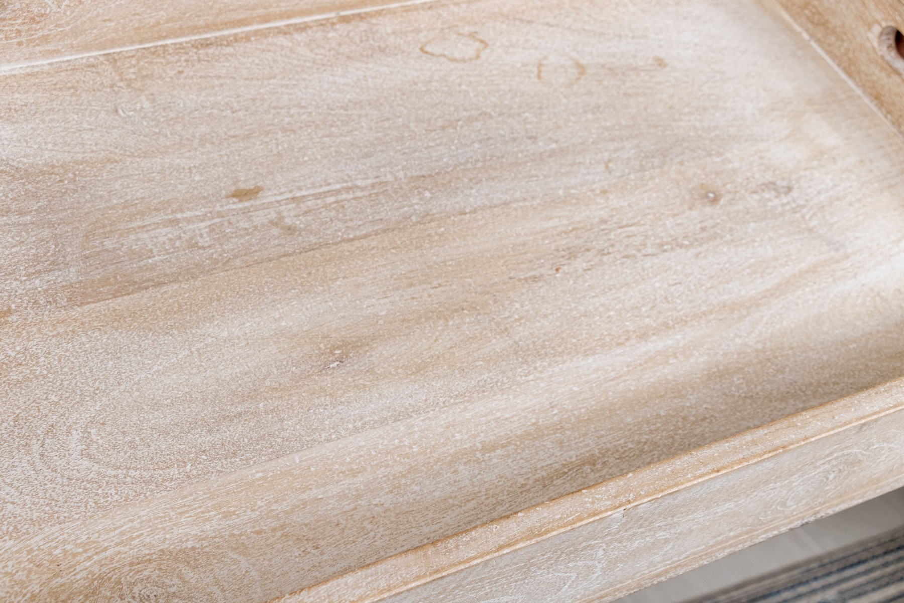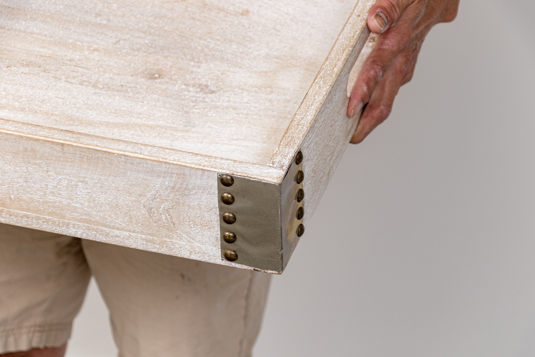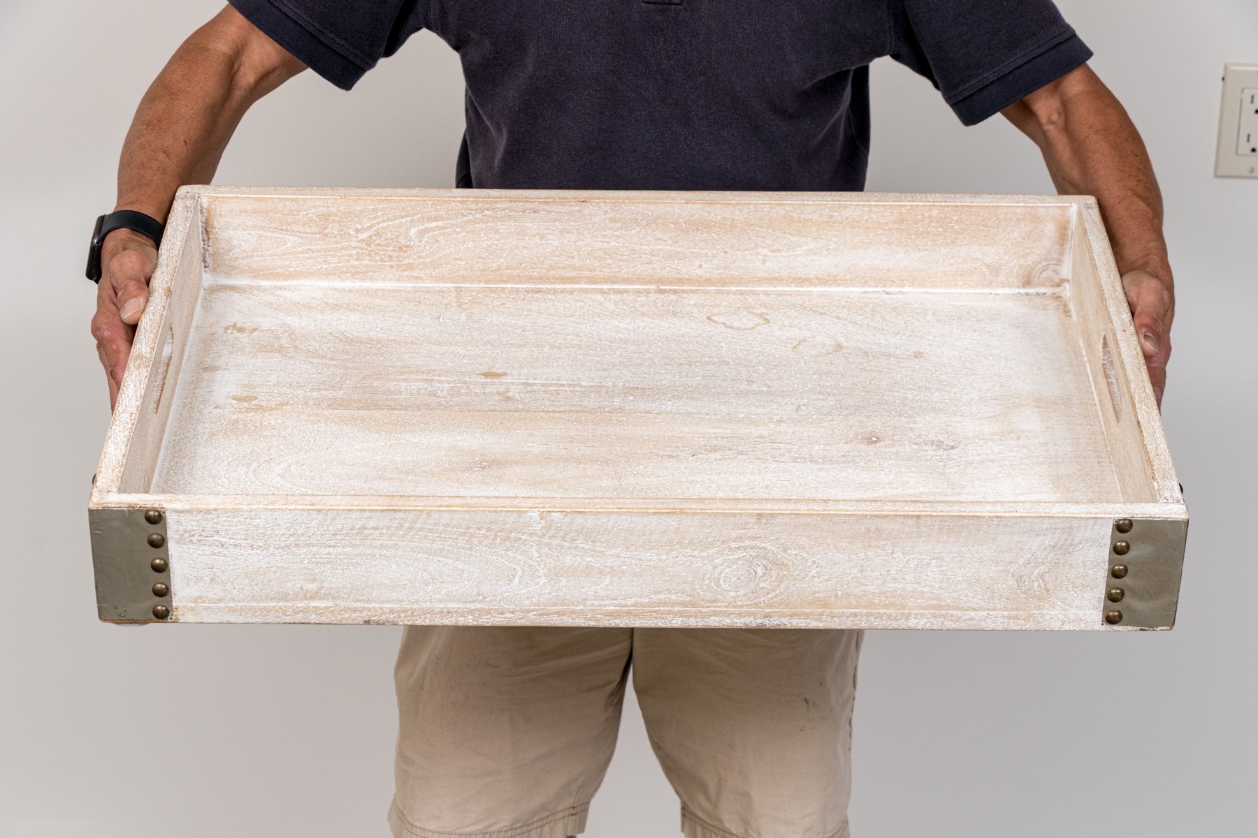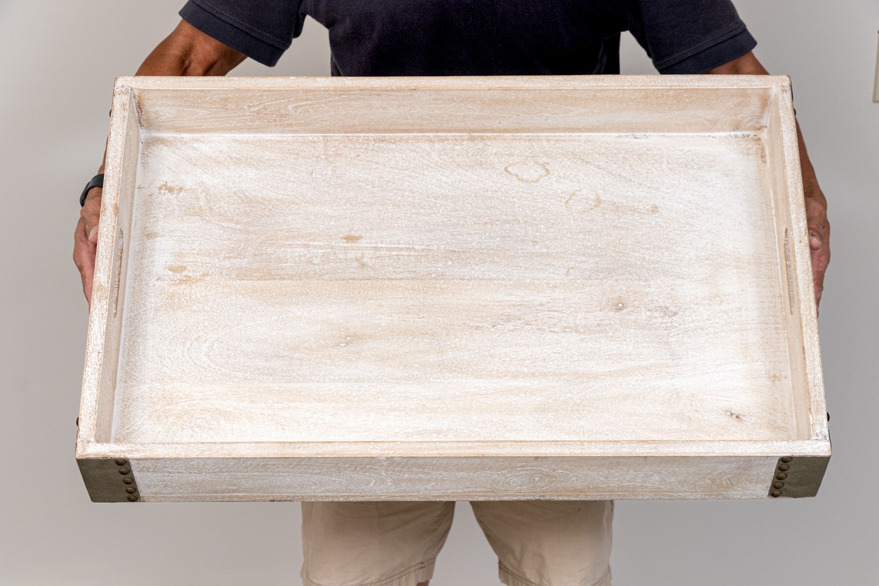 With light stained wood frame with large rectangular tray bottom with four gallery walls, the end two walls with carved intrinsic handles. Metallic binding to all four corners lend a structural and visually appealing aesthetic.