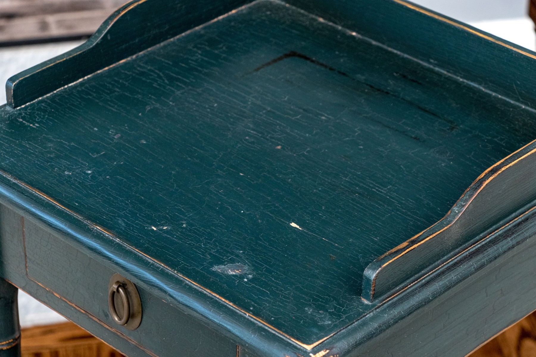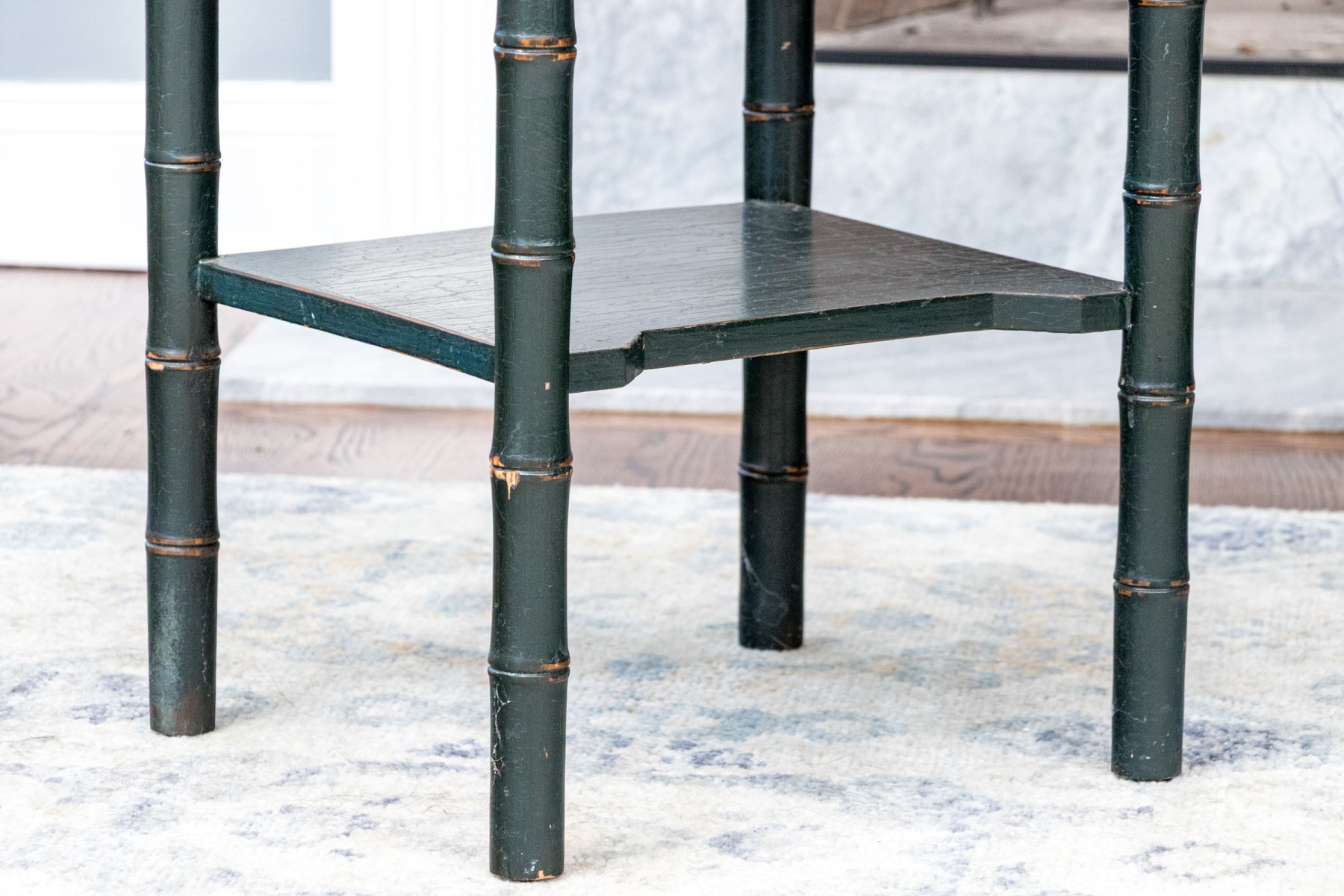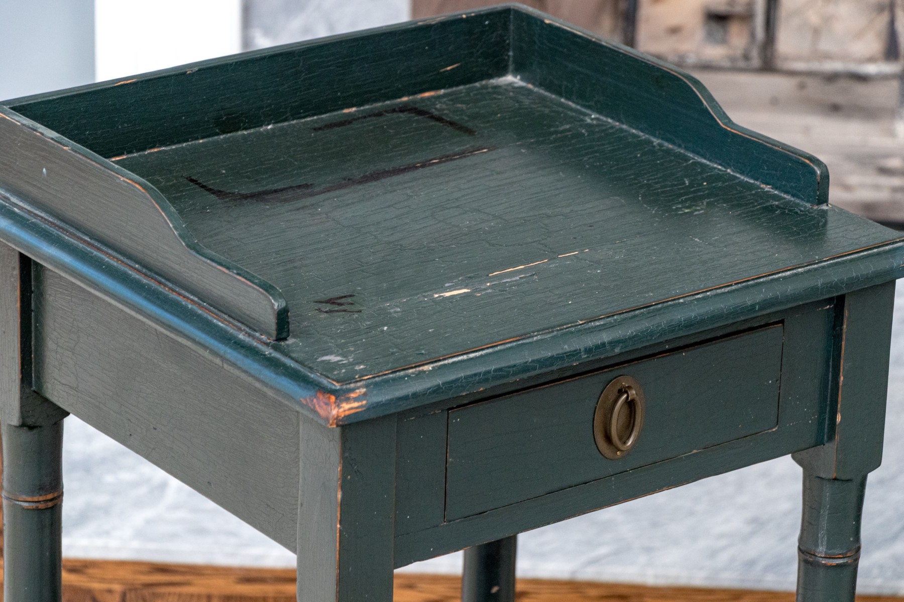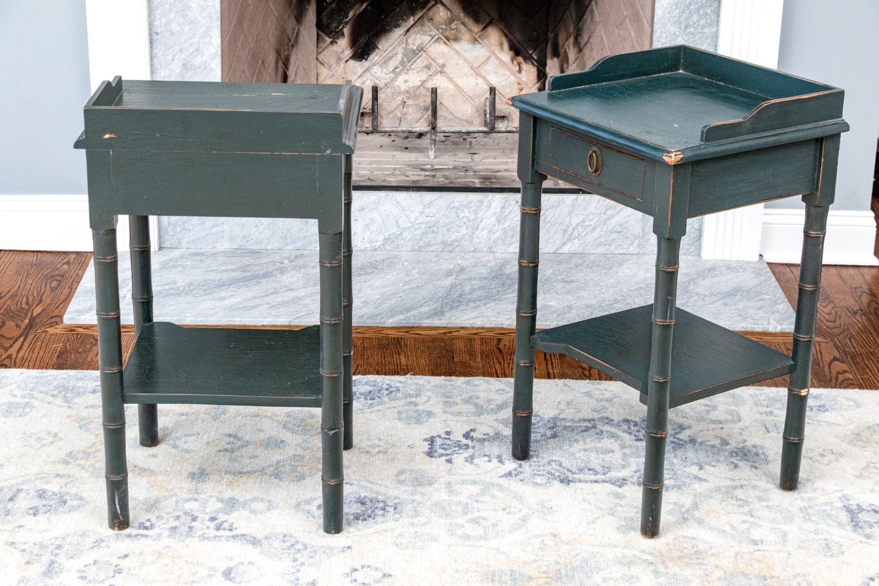 Distress to the painted finish with some chips and nics to the legs and paint finish. Despite gentle wear the two end tables presents well.
