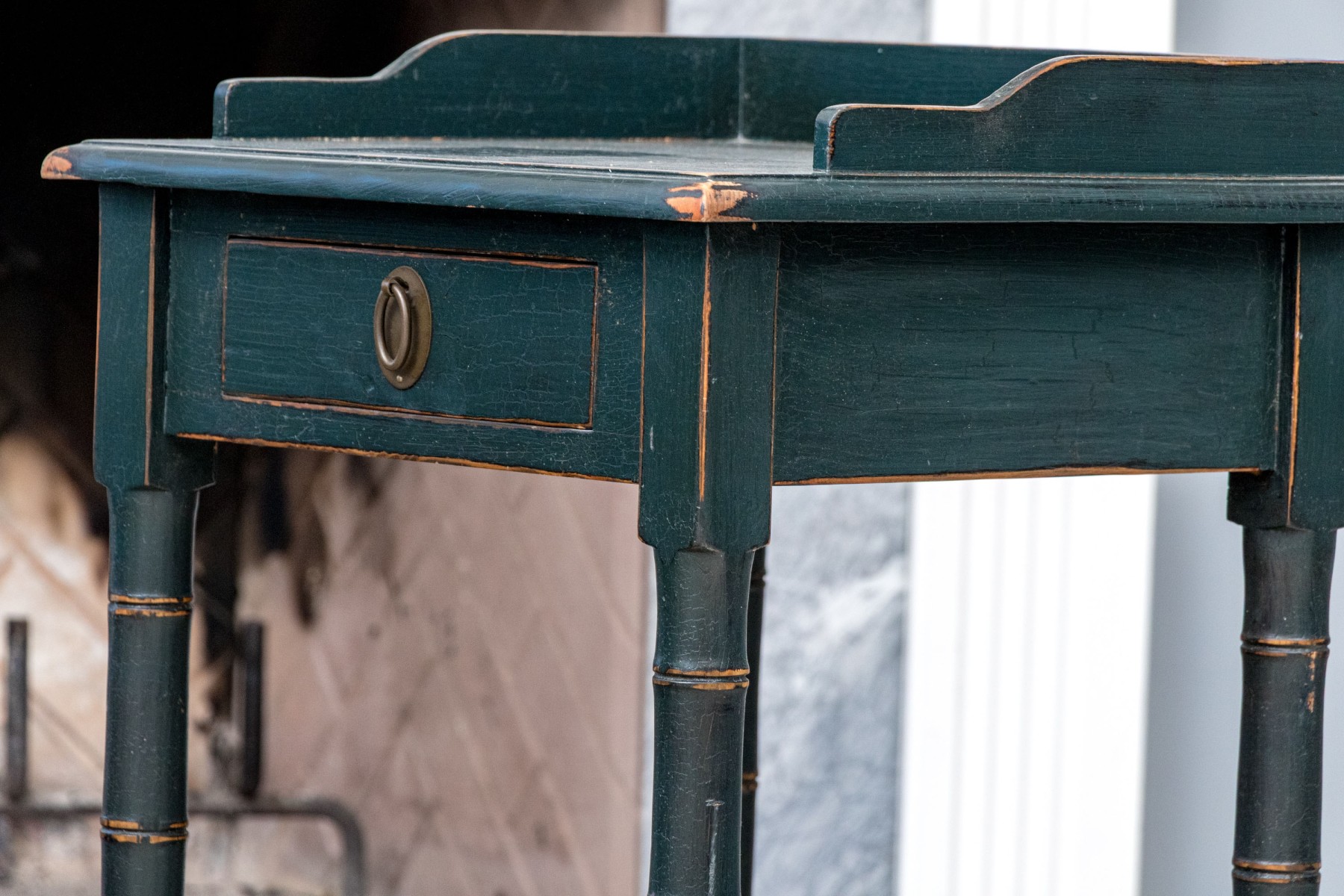 Each standing upon four carved and paint finished faux bamboo form legs, with lower tiered shelf doubling as stretcher support. Above the case with single drawer with ring pull below the table top featuring a three quarter gallery to table top.