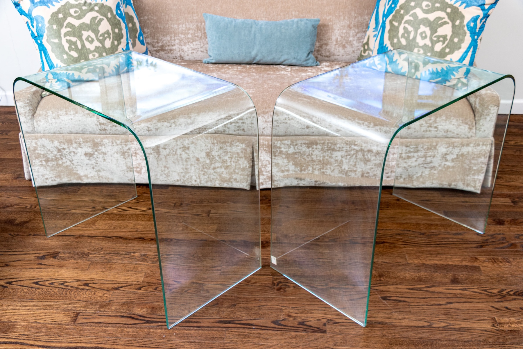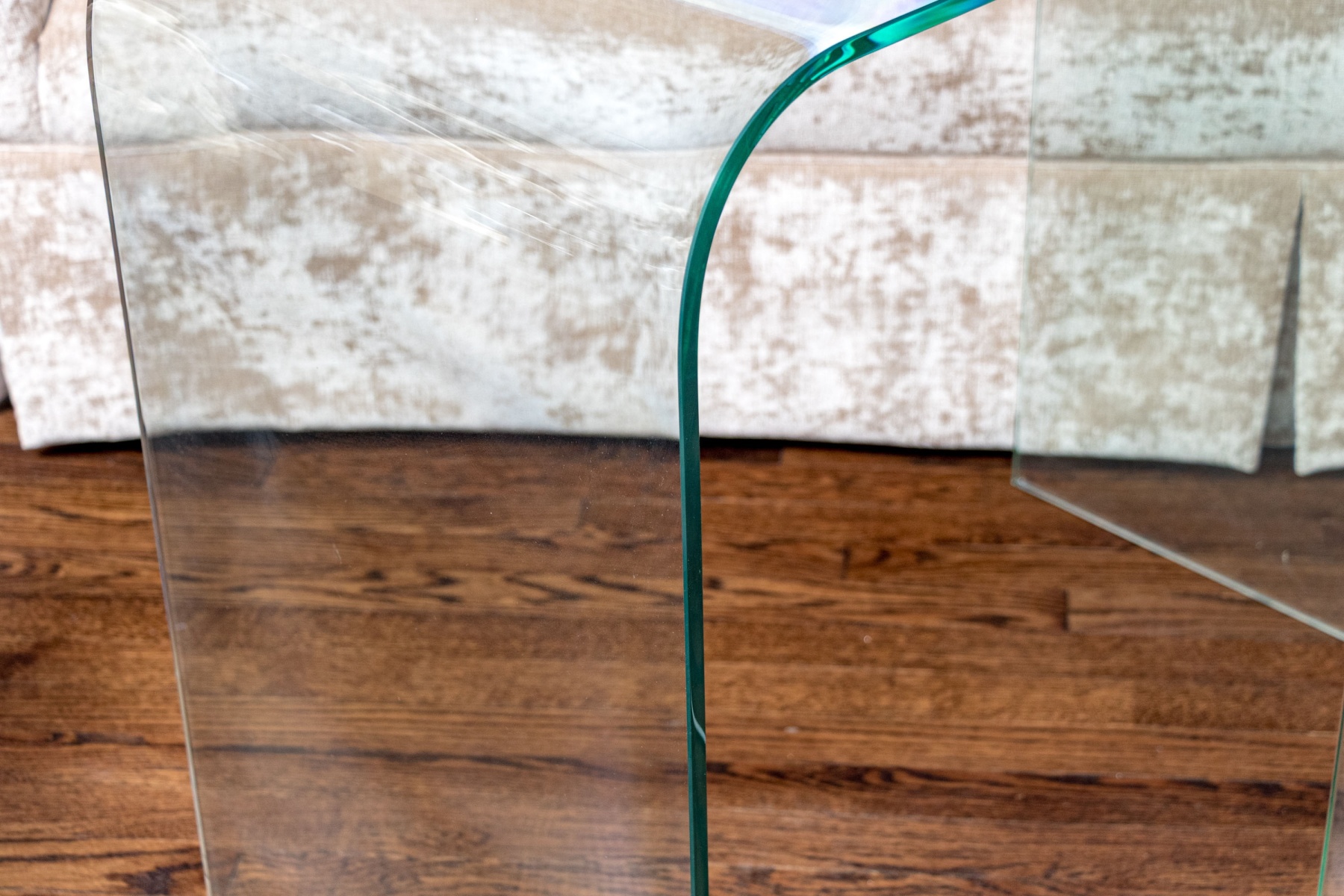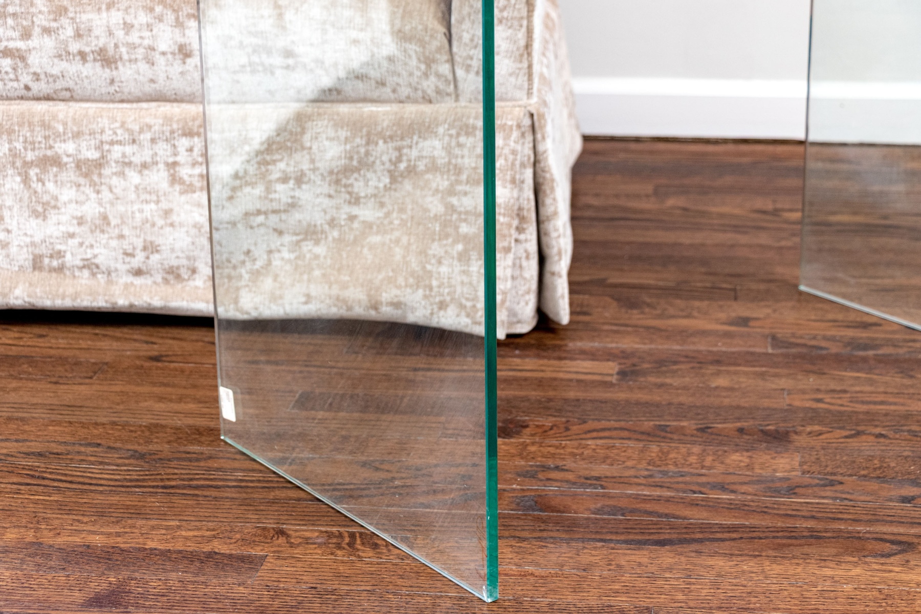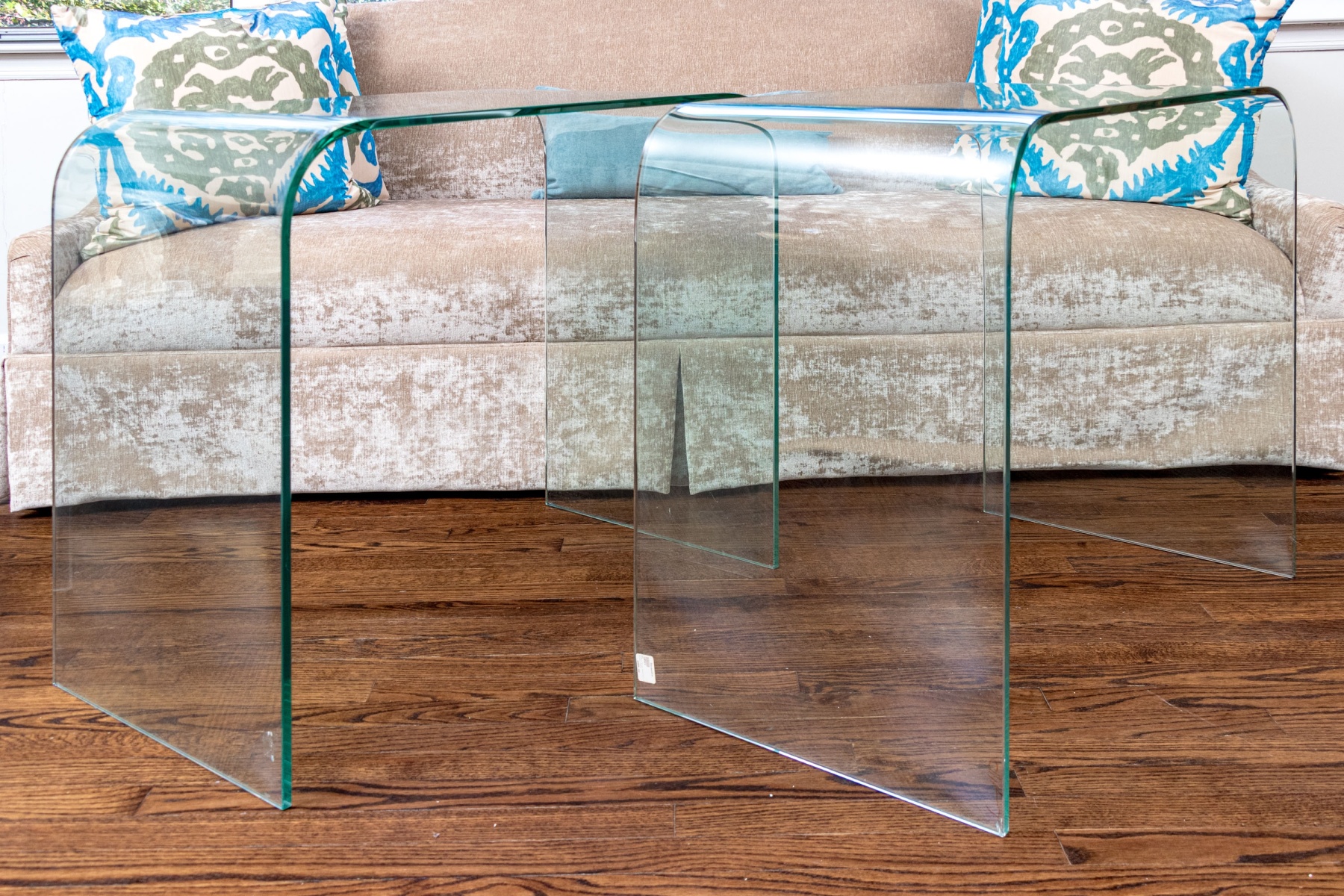 A delightful pair of accent tables with classic Hollywood Regency appeal, crafted from single sheets of glass with sleek waterfall forms showcasing rectangular forms dramatically curving down to the legs.