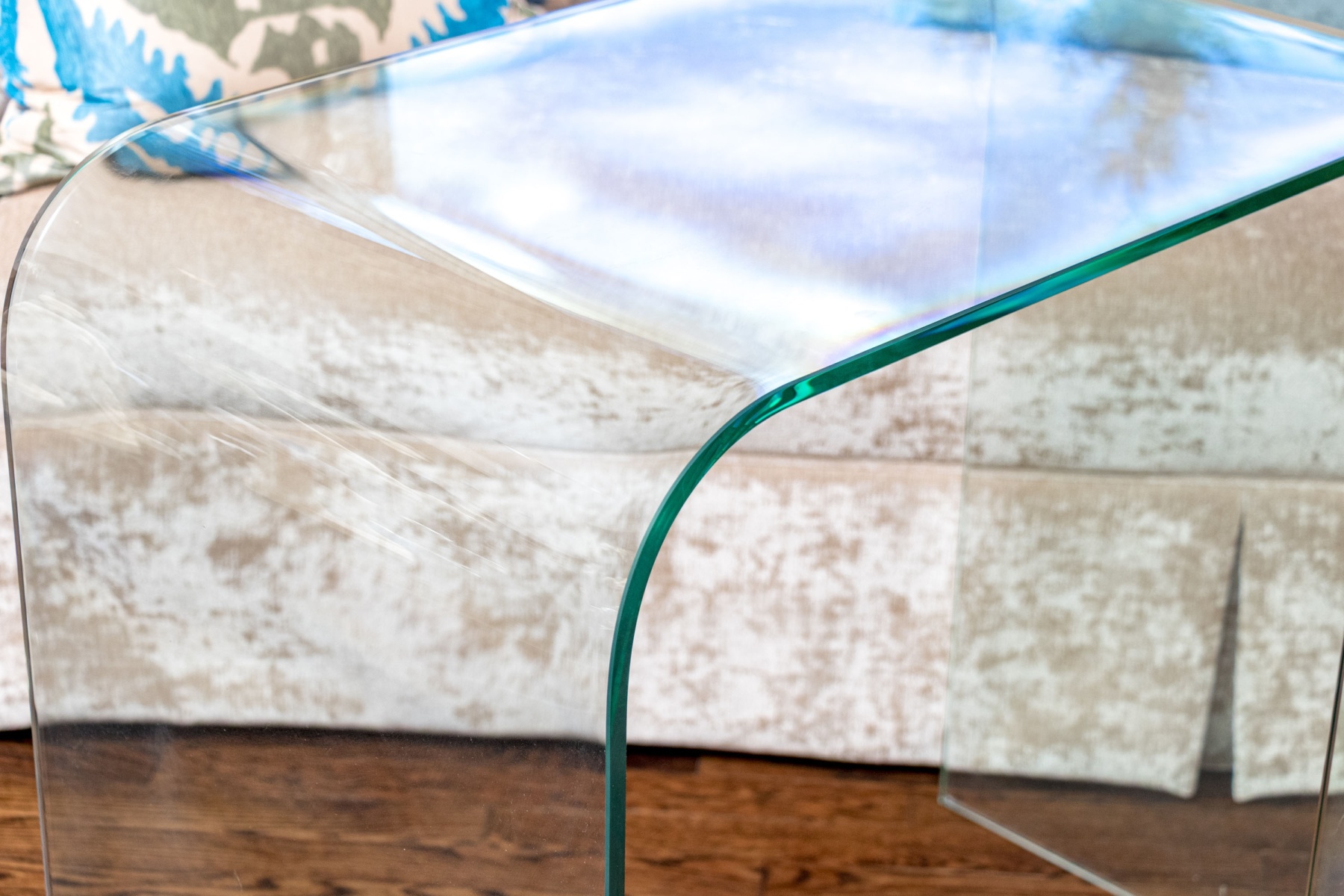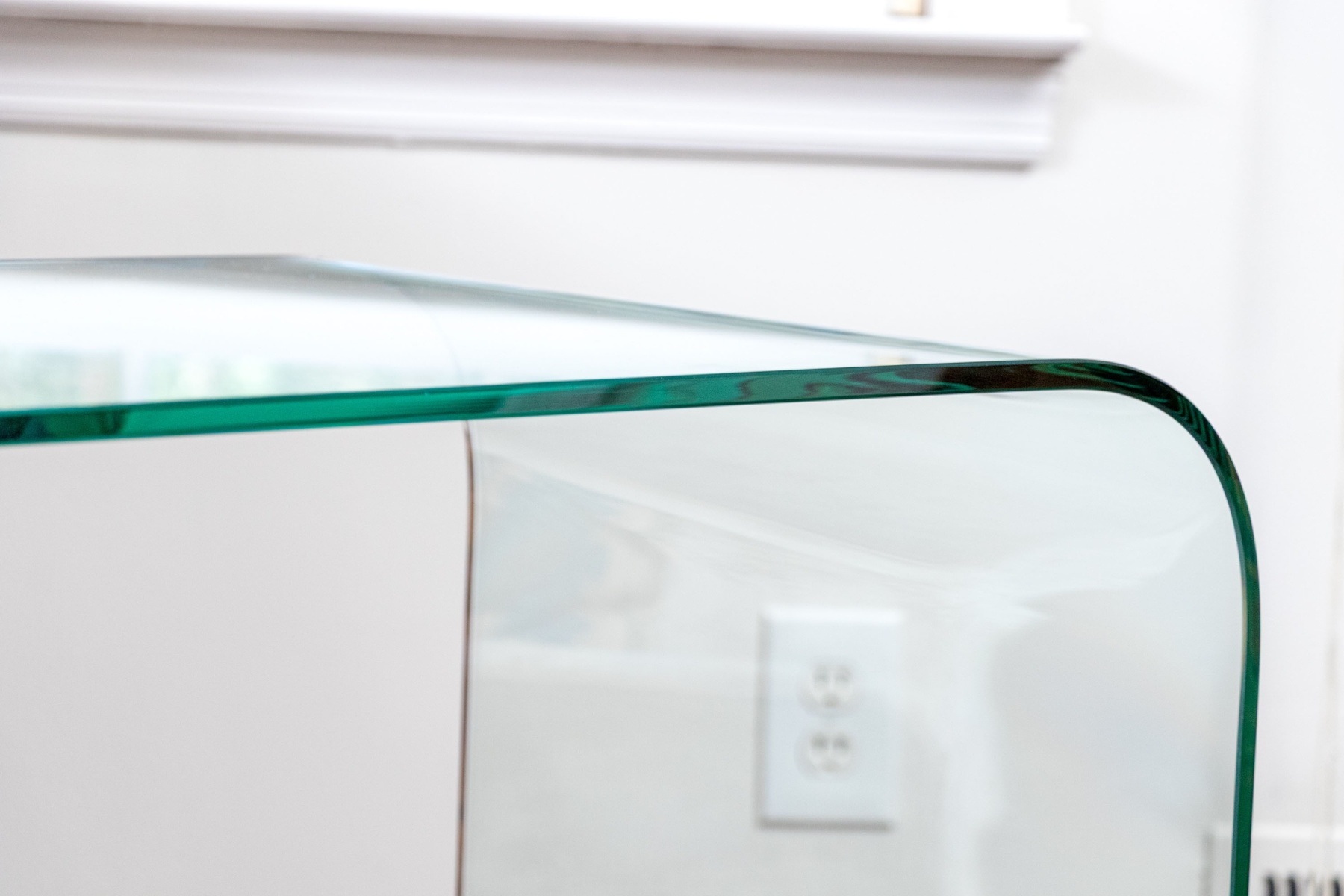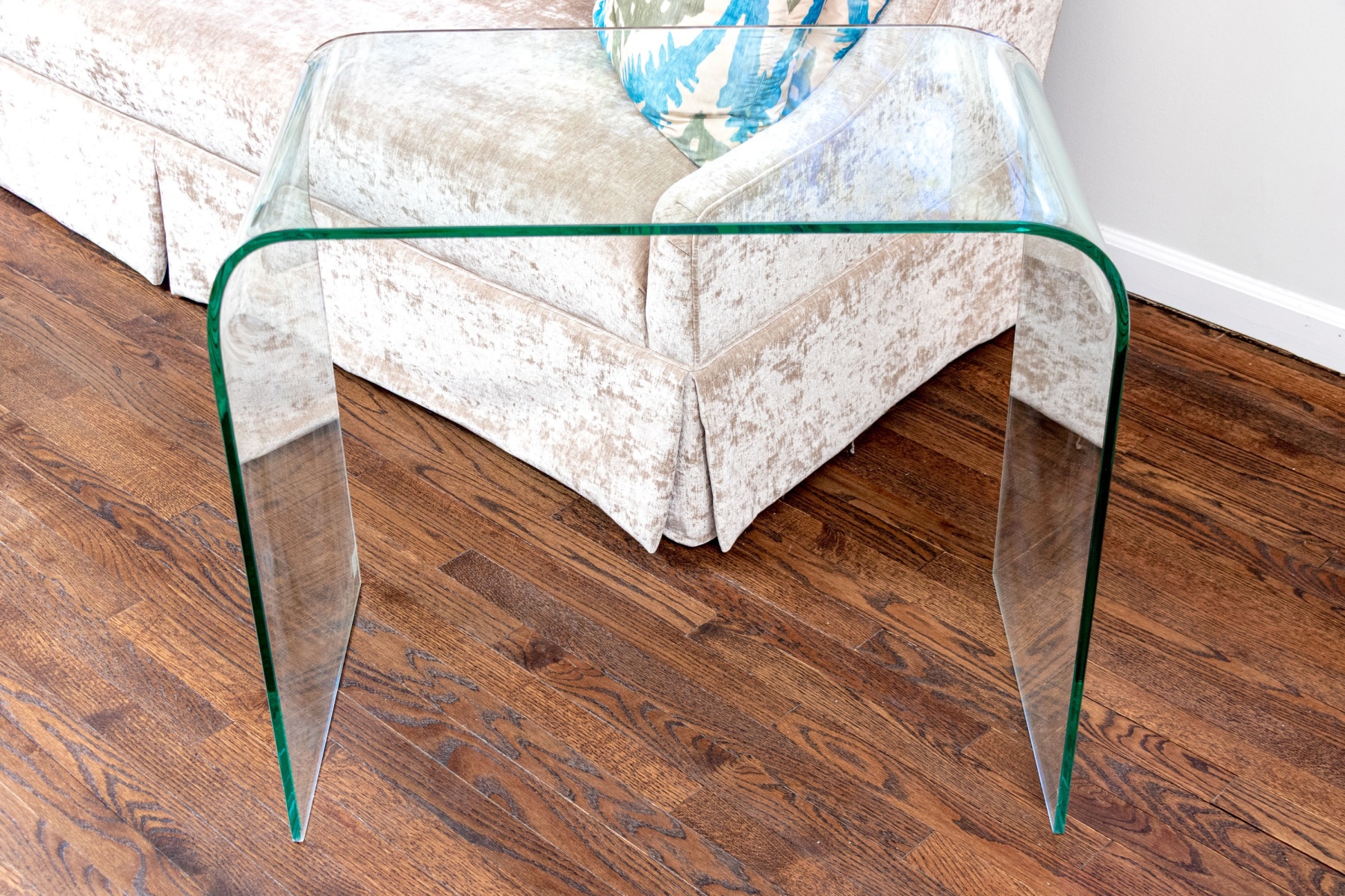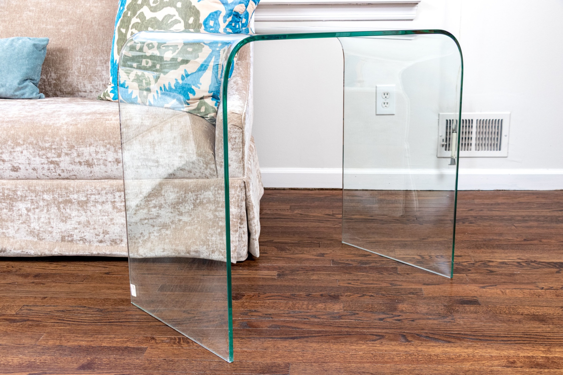 A delightful pair of accent tables with classic Hollywood Regency appeal, crafted from single sheets of glass with sleek waterfall forms showcasing rectangular forms dramatically curving down to the legs.
