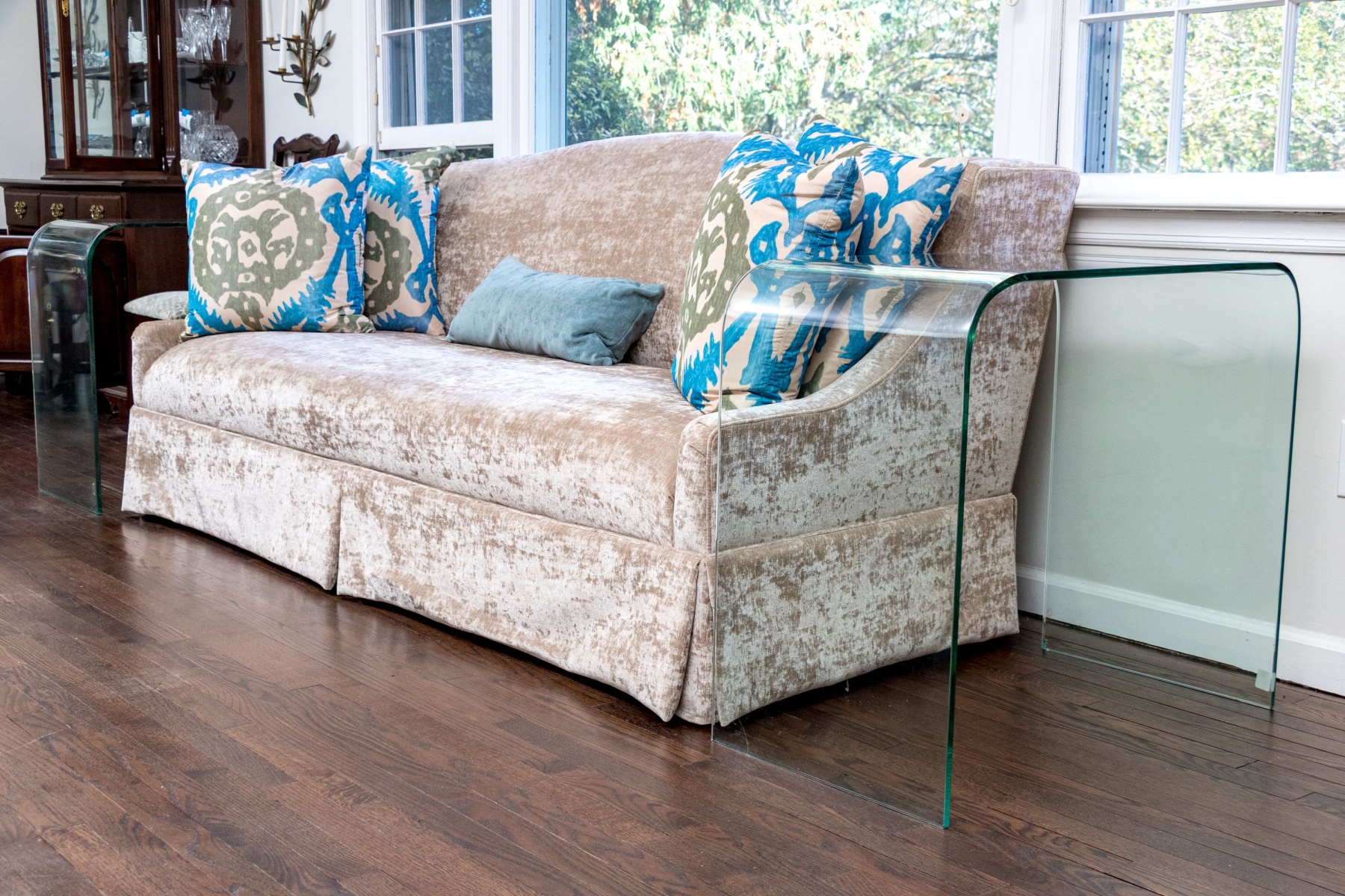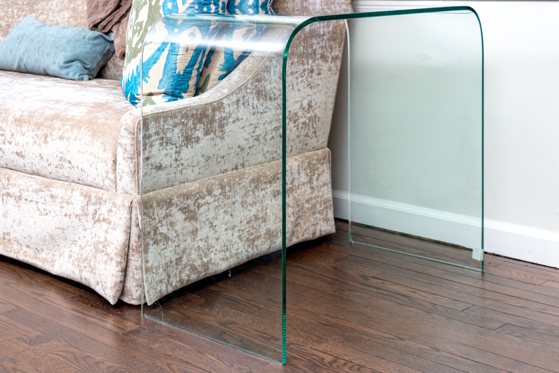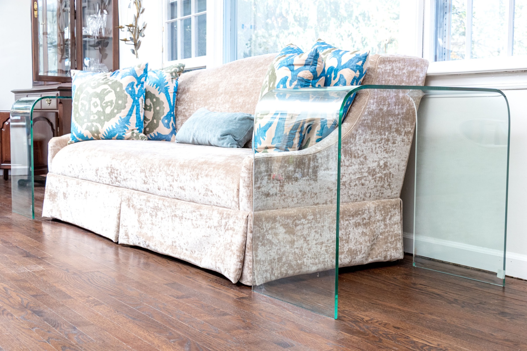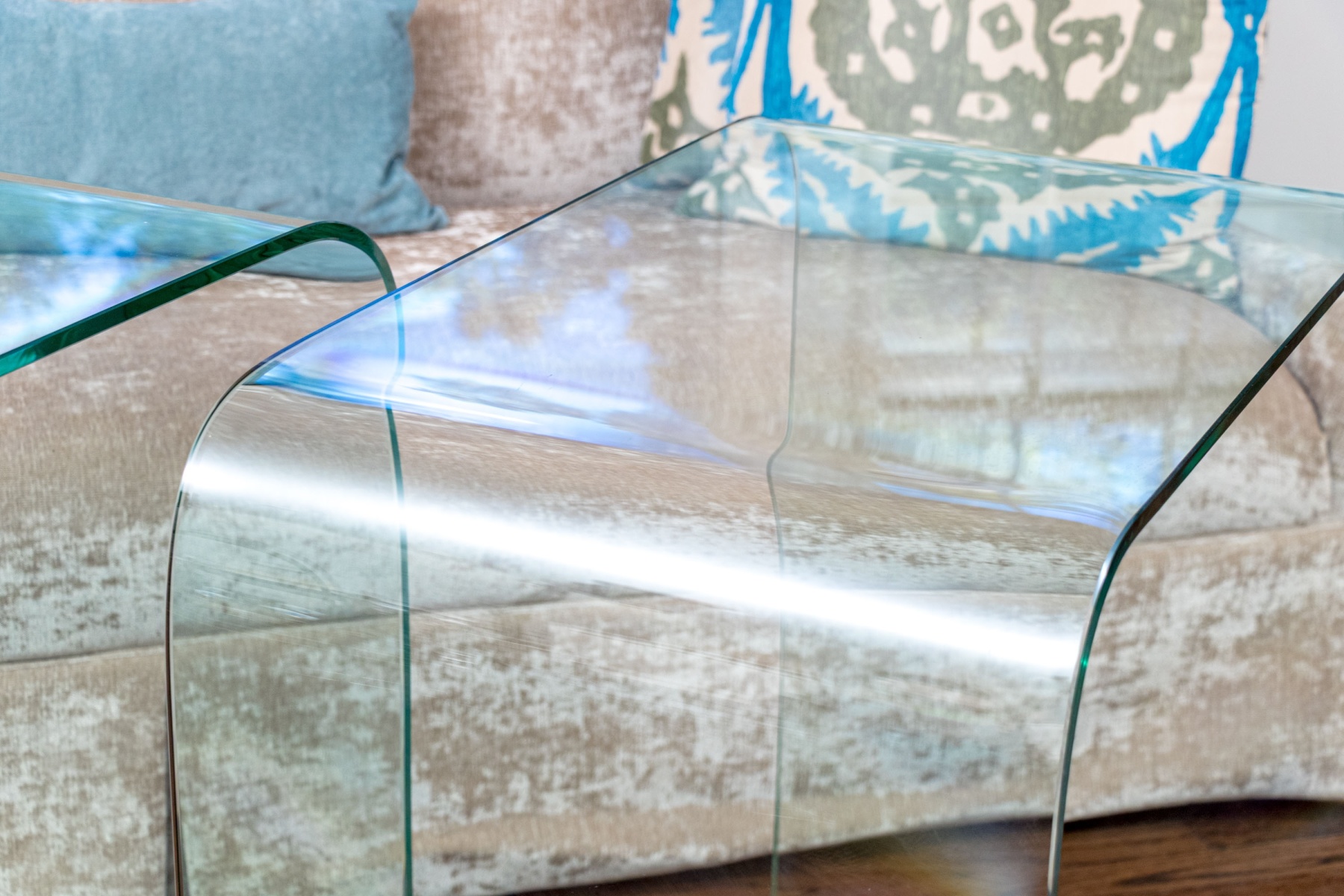 A delightful pair of accent tables with classic Hollywood Regency appeal, crafted from single sheets of glass with sleek waterfall forms showcasing rectangular forms dramatically curving down to the legs.
