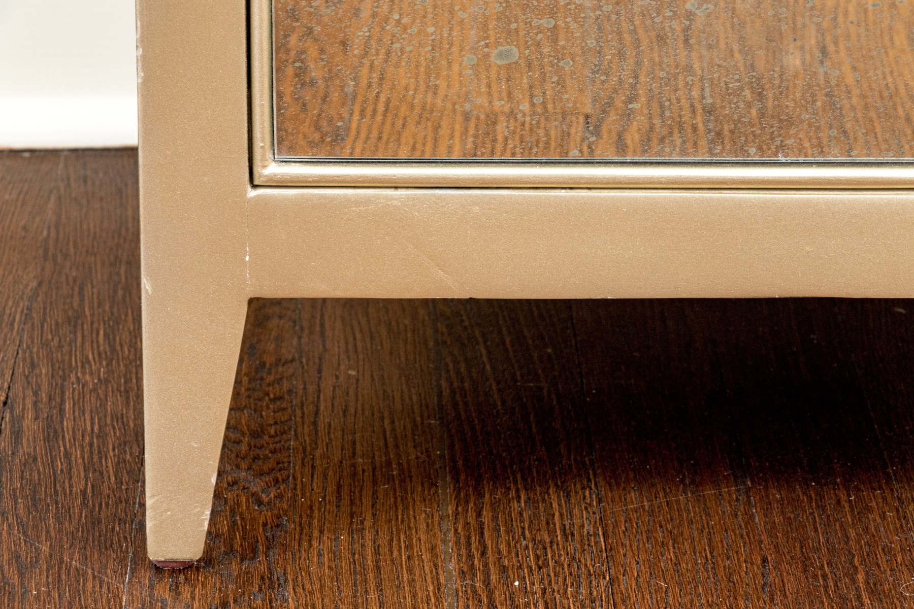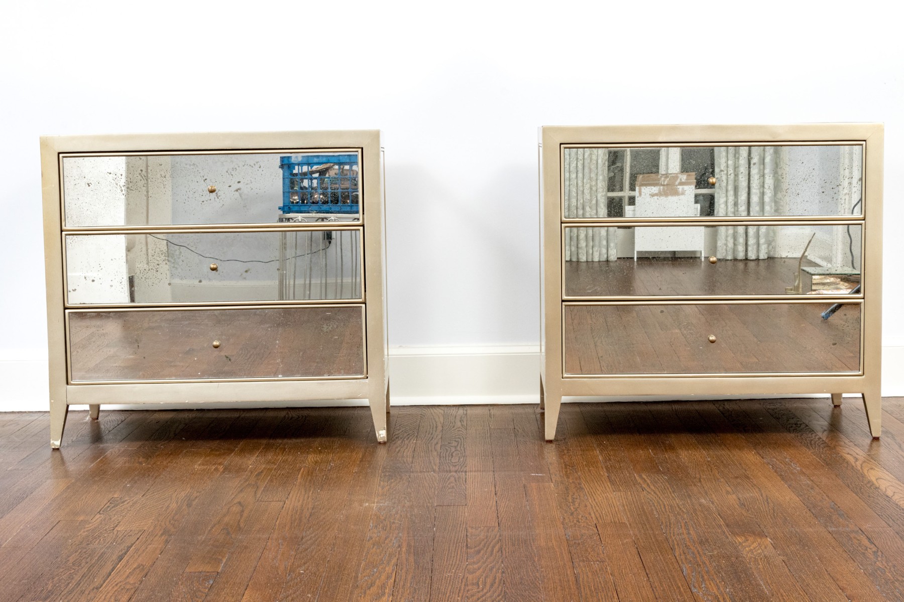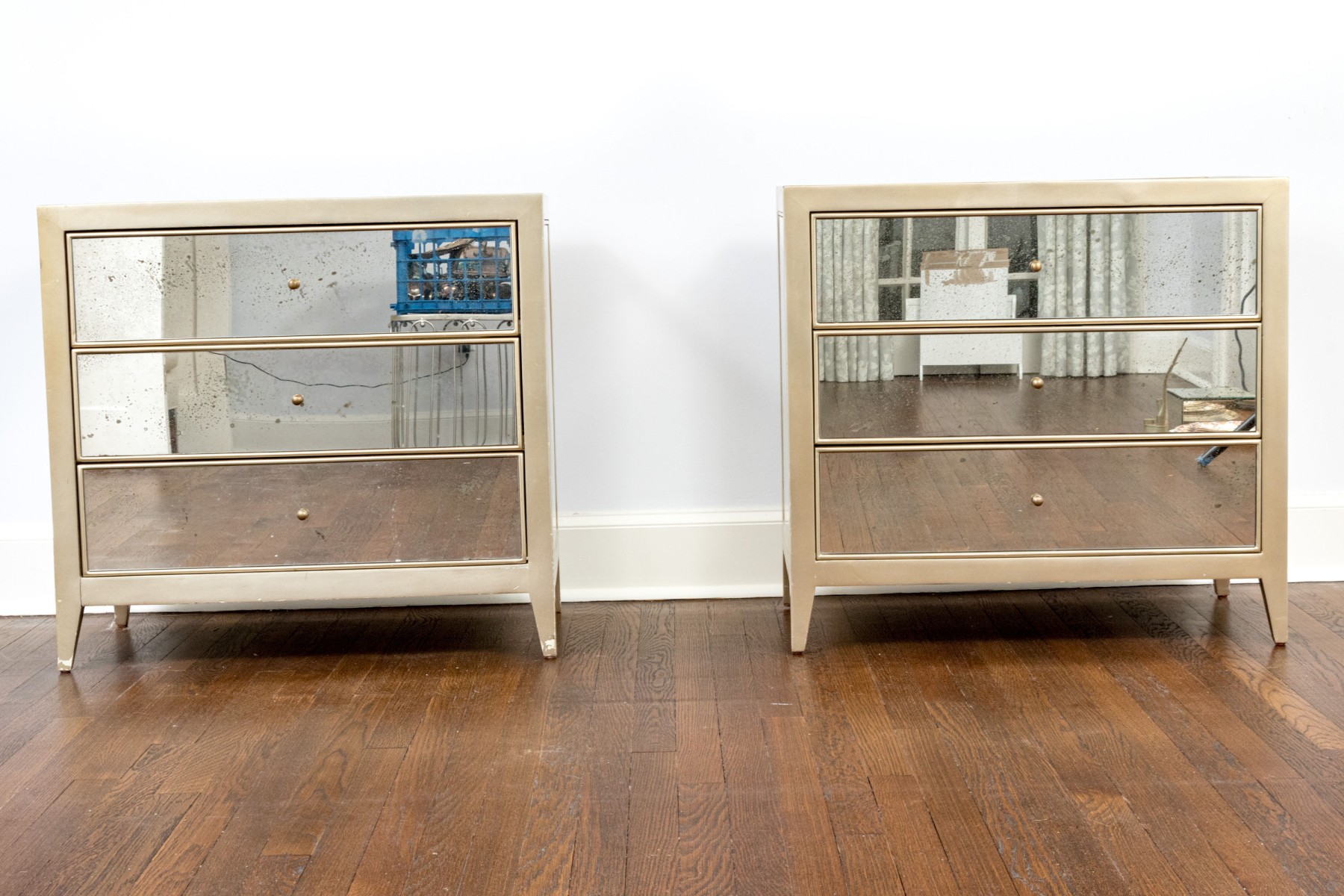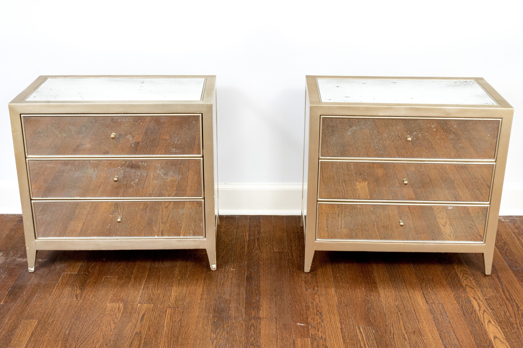 A chic pair of end tables or nightstands with sleek, gray-gilt frames inset with antiqued mirror panels that continue along the faces of three drawers each adorned with dainty knob handles. Each raised on four gently angled legs lending an additional elegant touch to the designs.