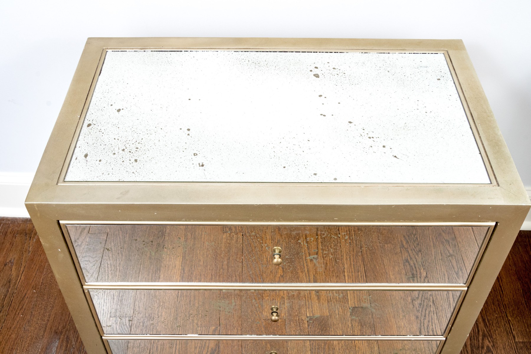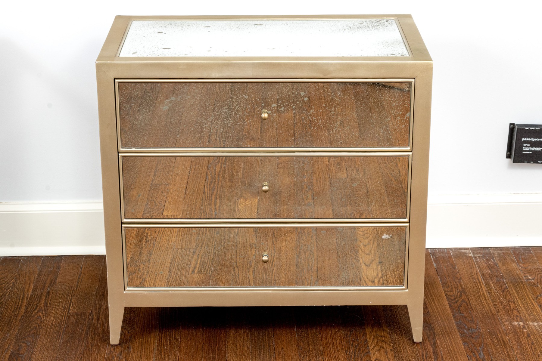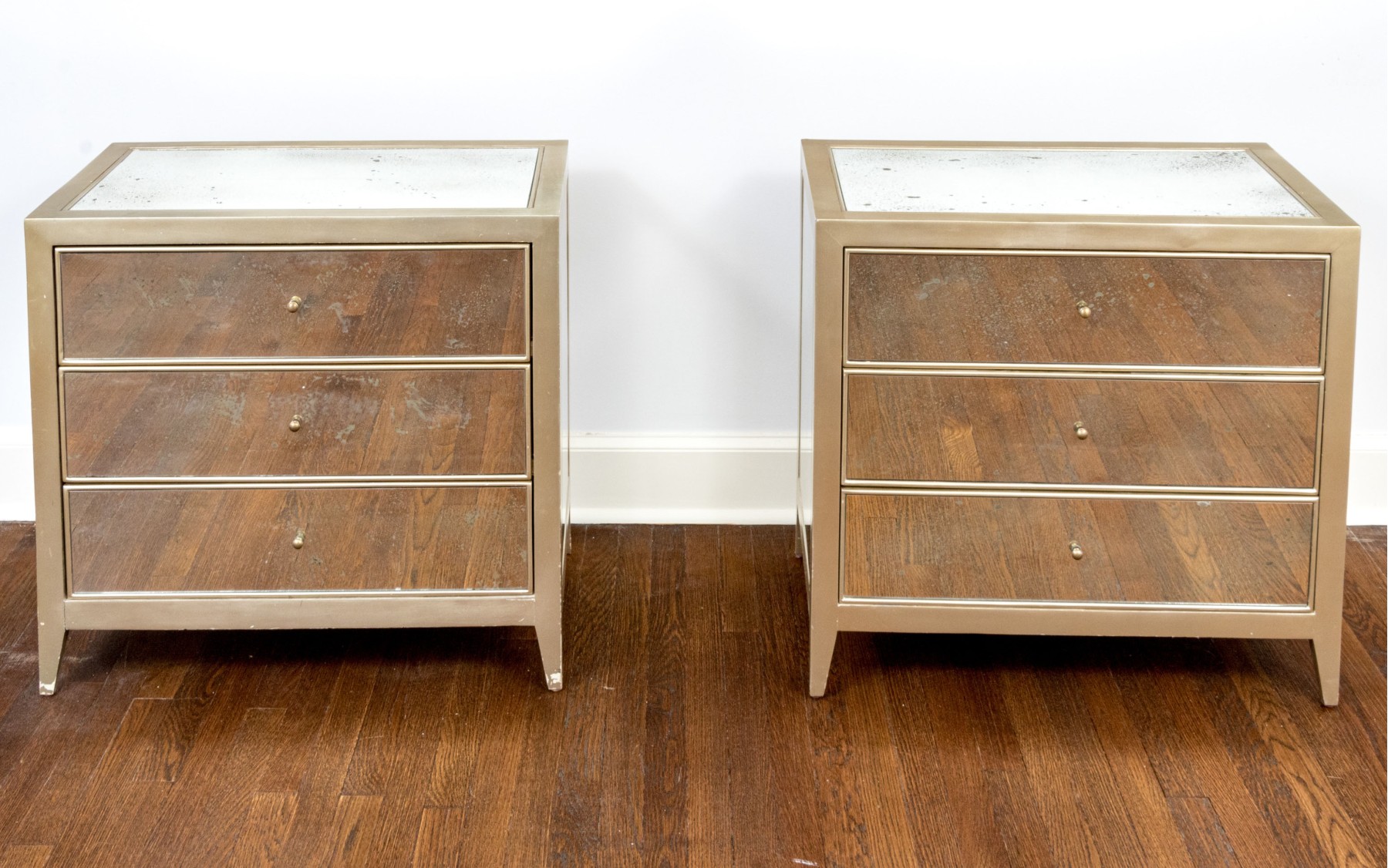 A chic pair of end tables or nightstands with sleek, gray-gilt frames inset with antiqued mirror panels that continue along the faces of three drawers each adorned with dainty knob handles. Each raised on four gently angled legs lending an additional elegant touch to the designs.