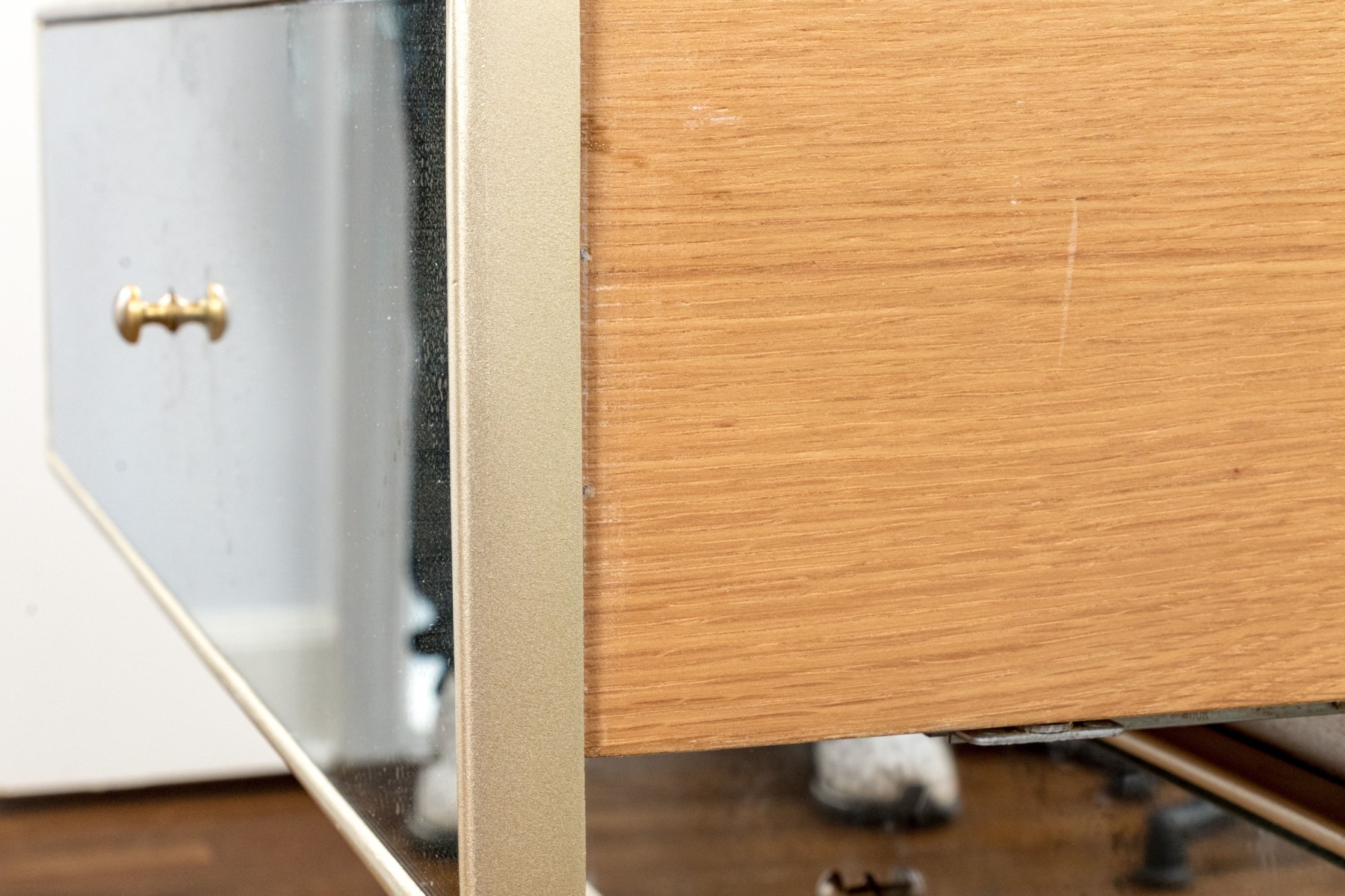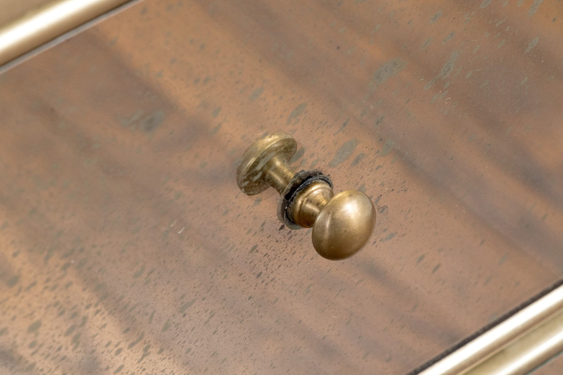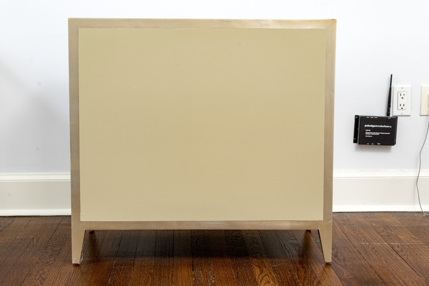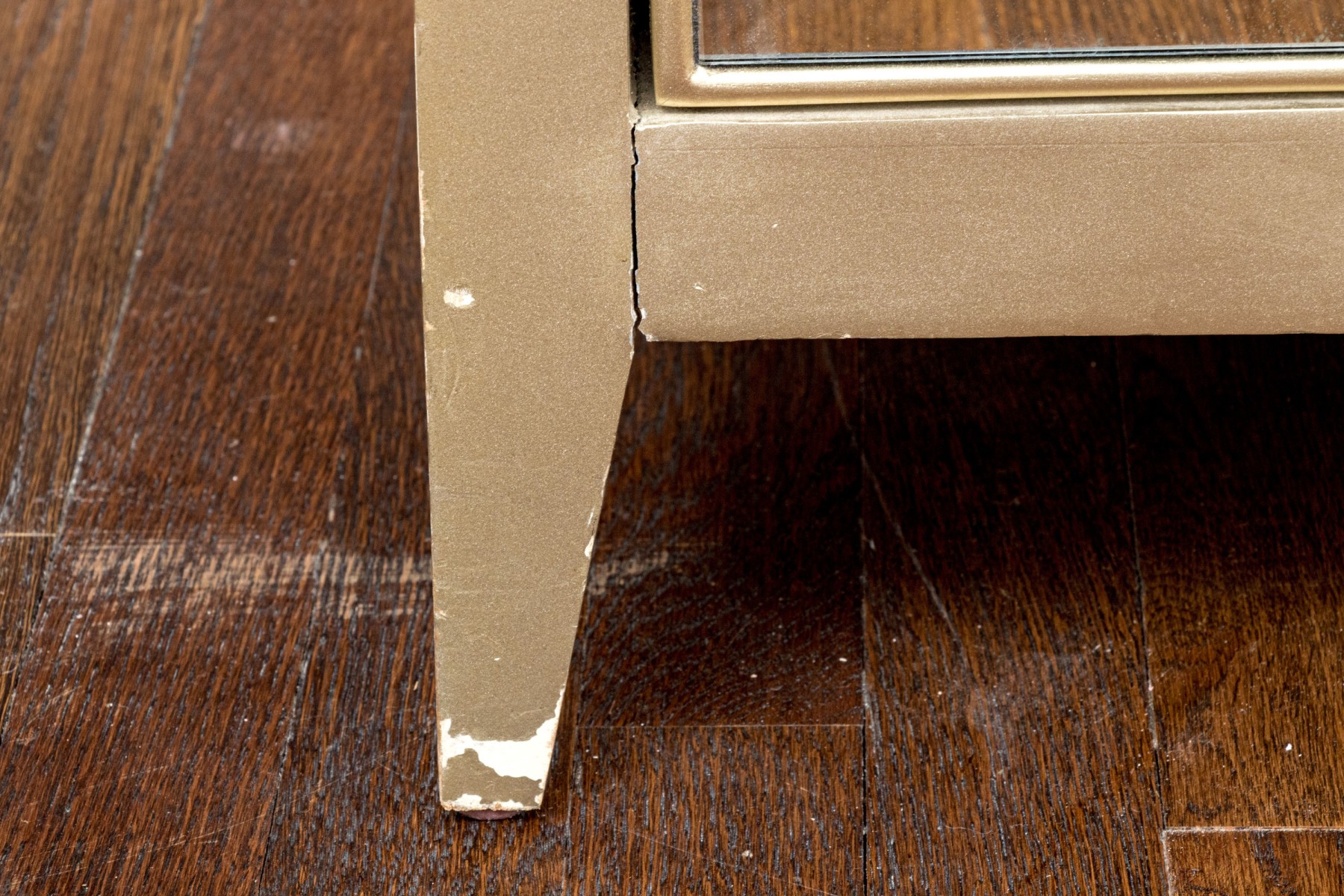 A chic pair of end tables or nightstands with sleek, gray-gilt frames inset with antiqued mirror panels that continue along the faces of three drawers each adorned with dainty knob handles. Each raised on four gently angled legs lending an additional elegant touch to the designs.