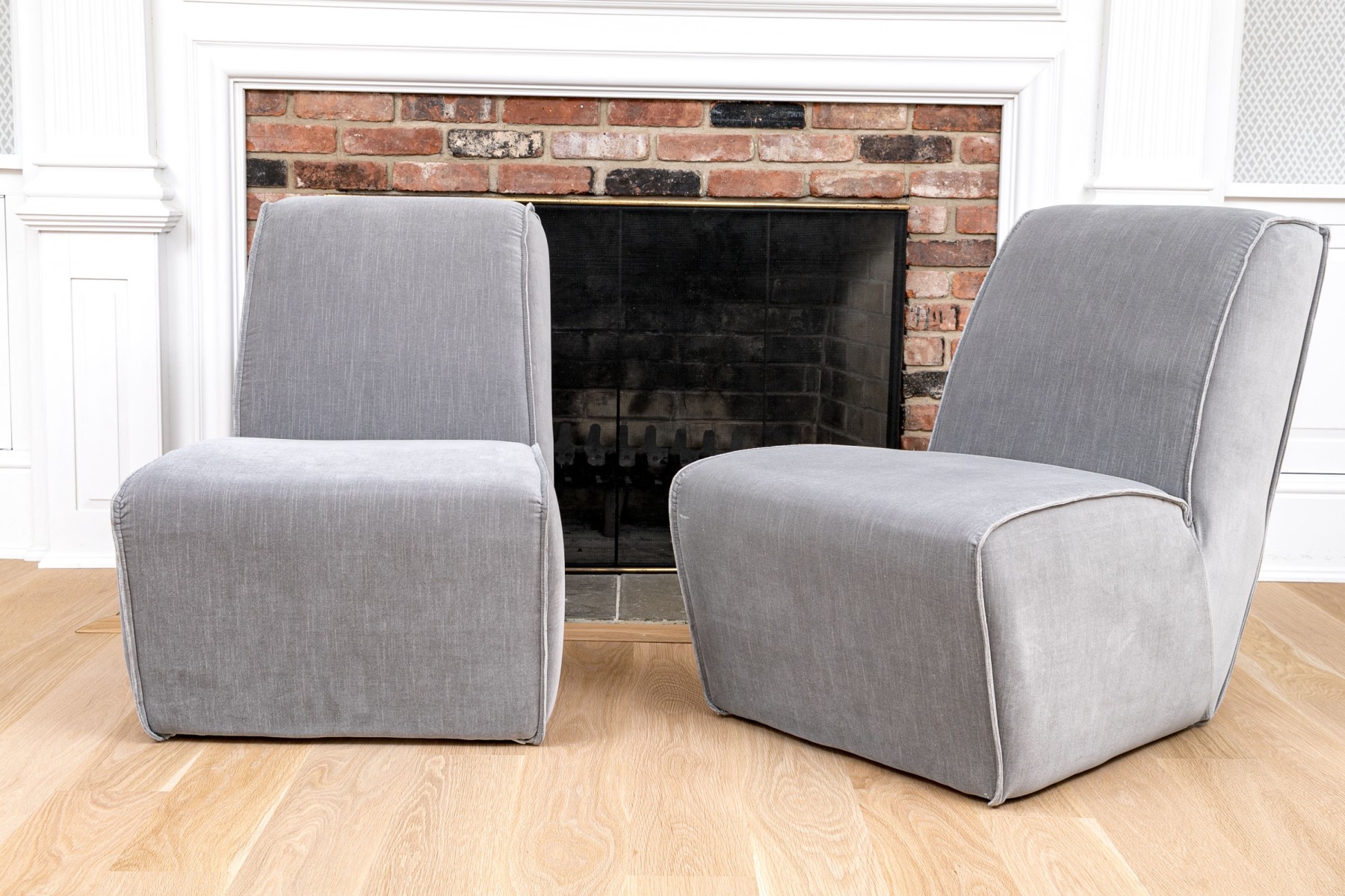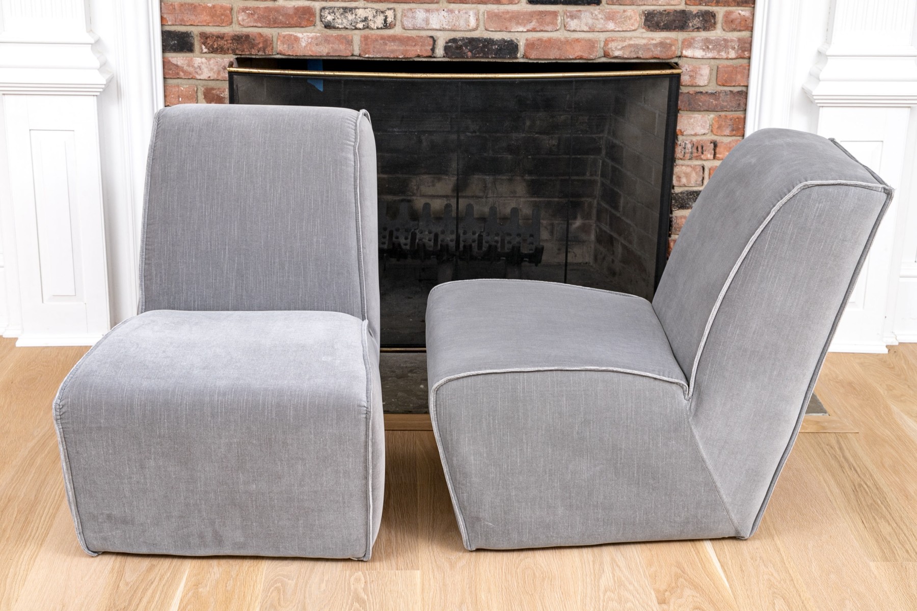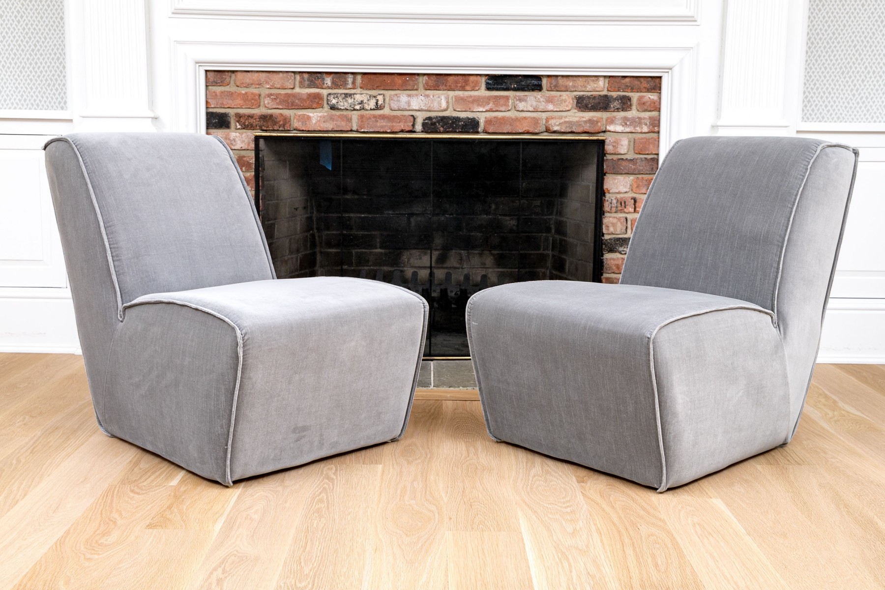 A fabulous pair of Restoration Hardware slipper chairs with chic, sleek profiles featuring comfortably angled wedge backs and impactful, wide seats with waterfall fronts leading to solid aprons. Upholstered in versatile gray velvet. The edges are piped for a stylish finish.