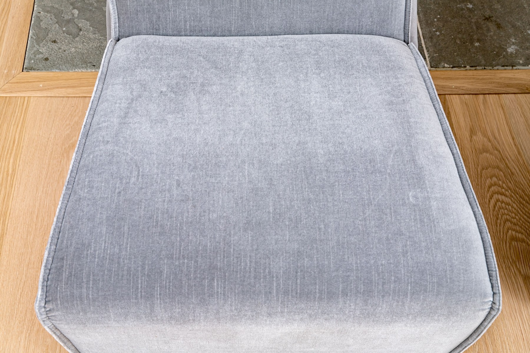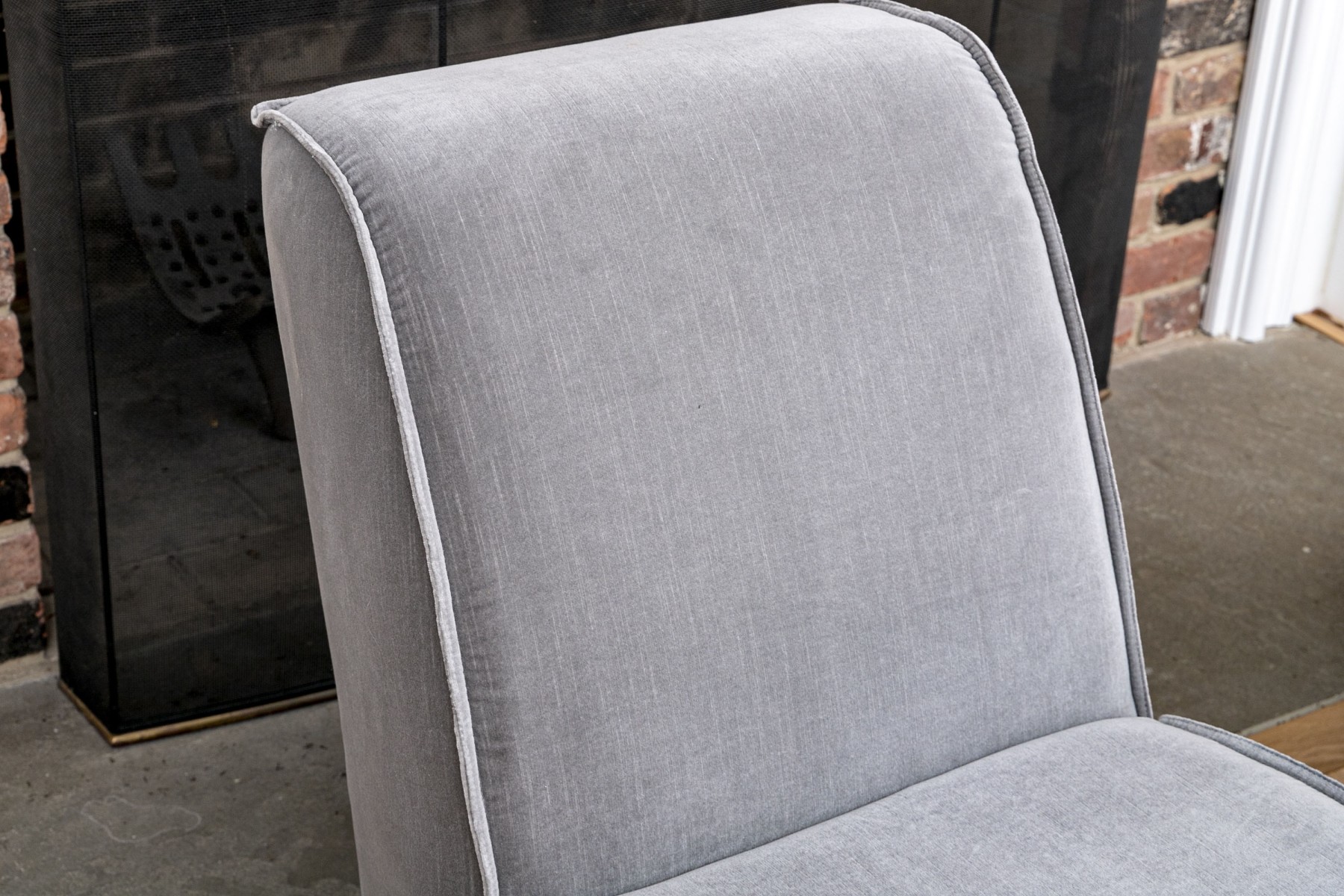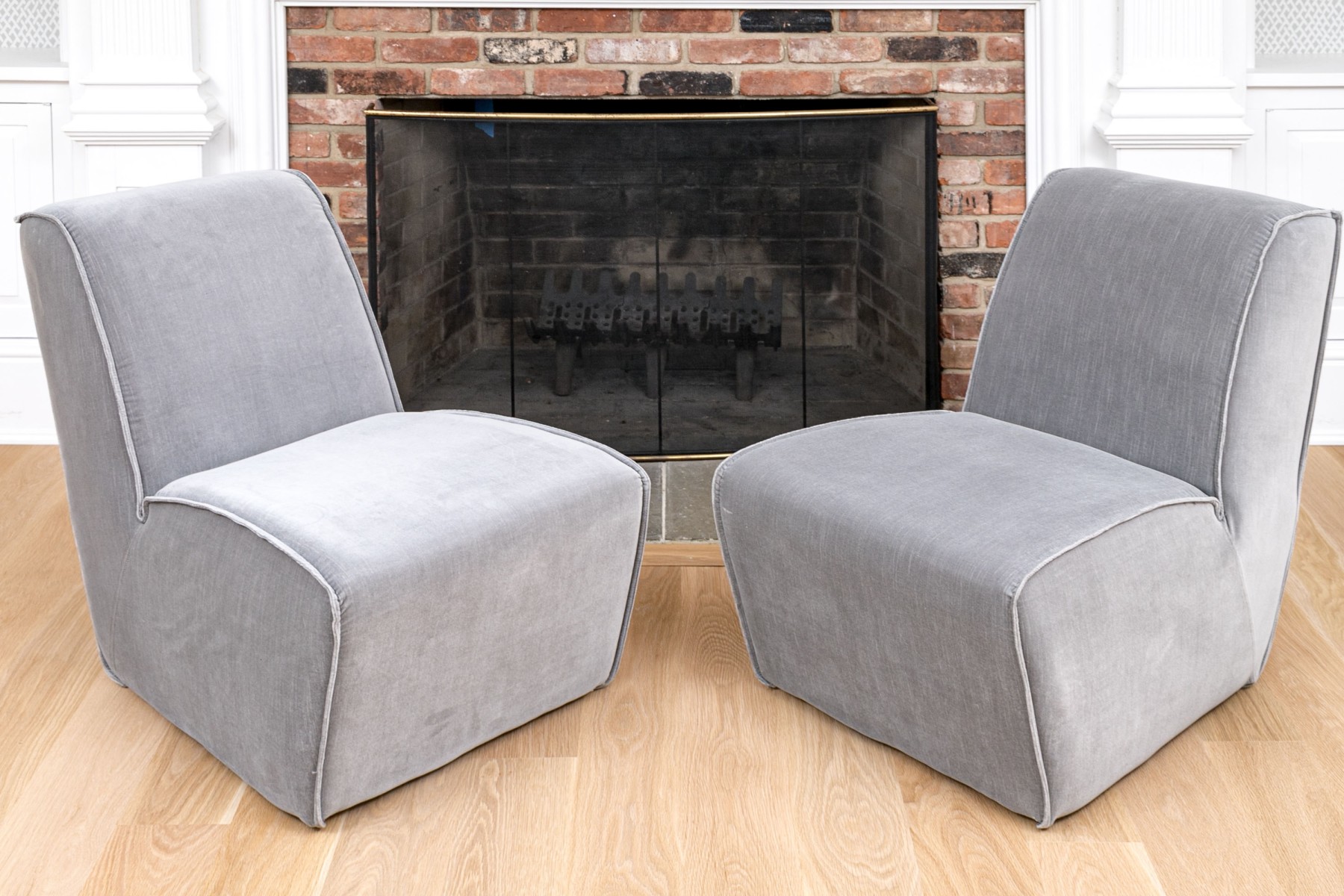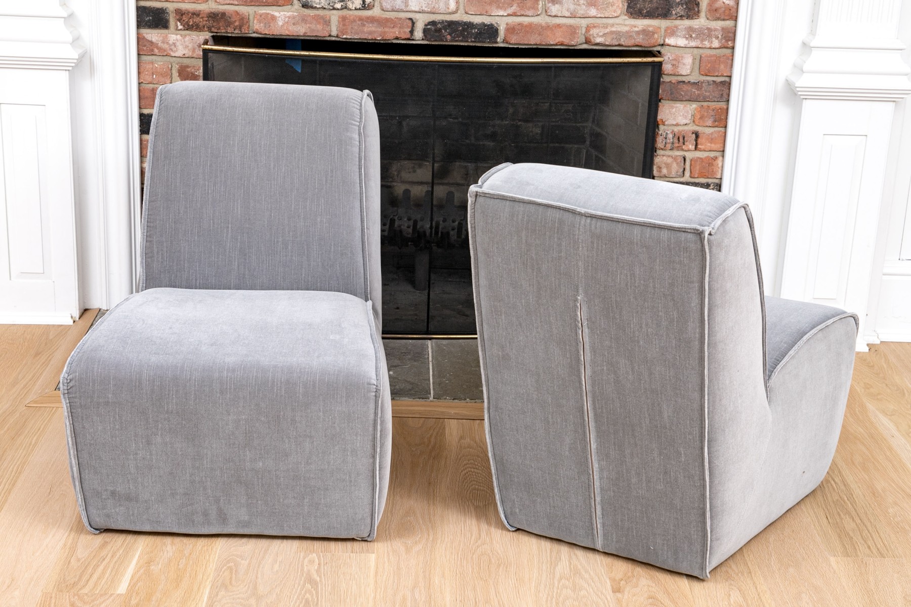 A fabulous pair of Restoration Hardware slipper chairs with chic, sleek profiles featuring comfortably angled wedge backs and impactful, wide seats with waterfall fronts leading to solid aprons. Upholstered in versatile gray velvet. The edges are piped for a stylish finish.