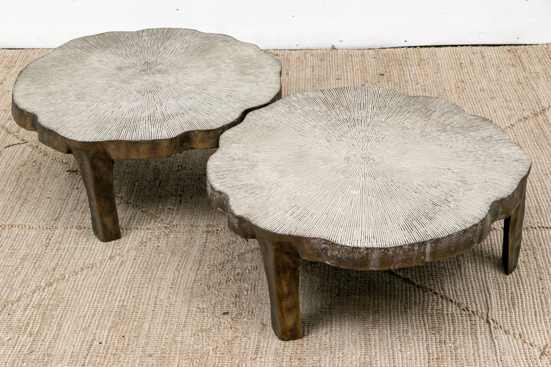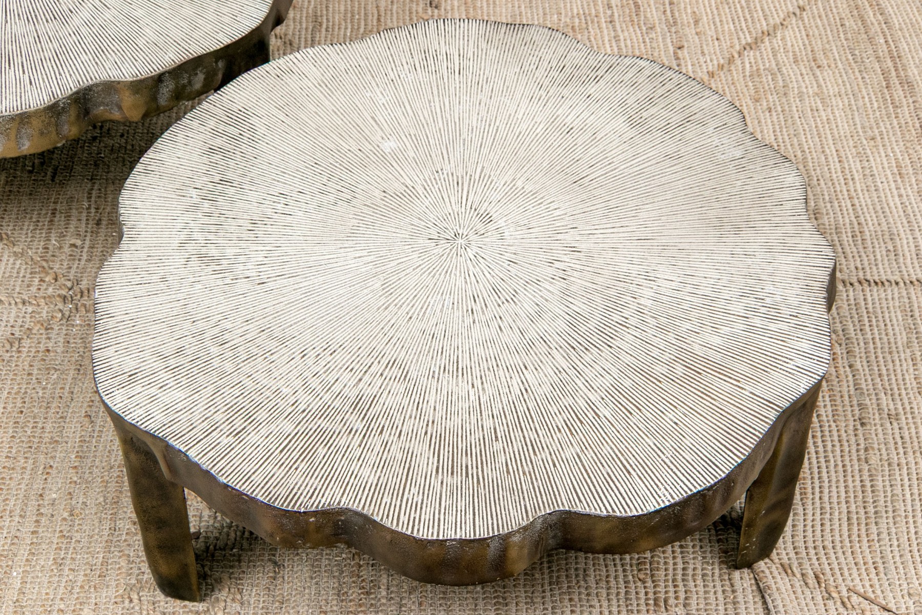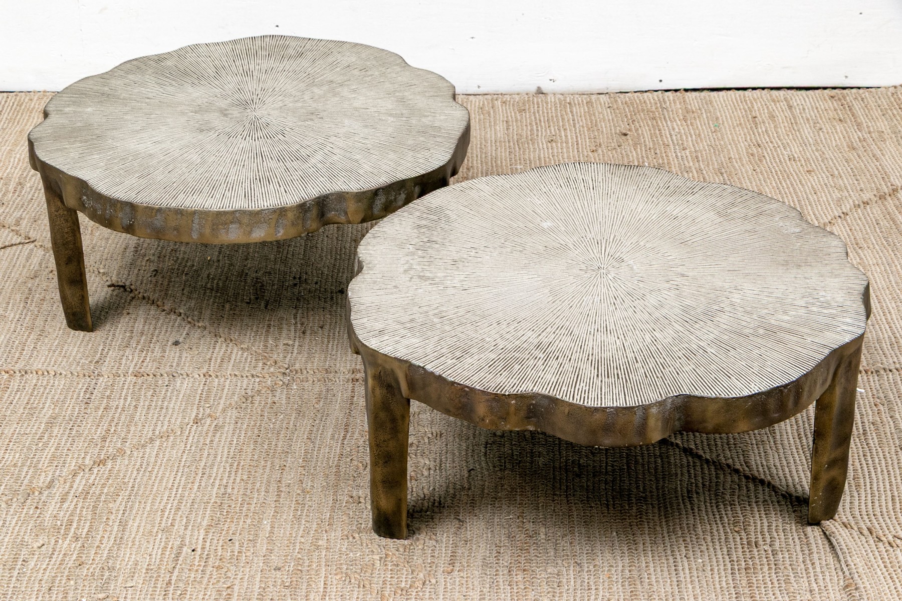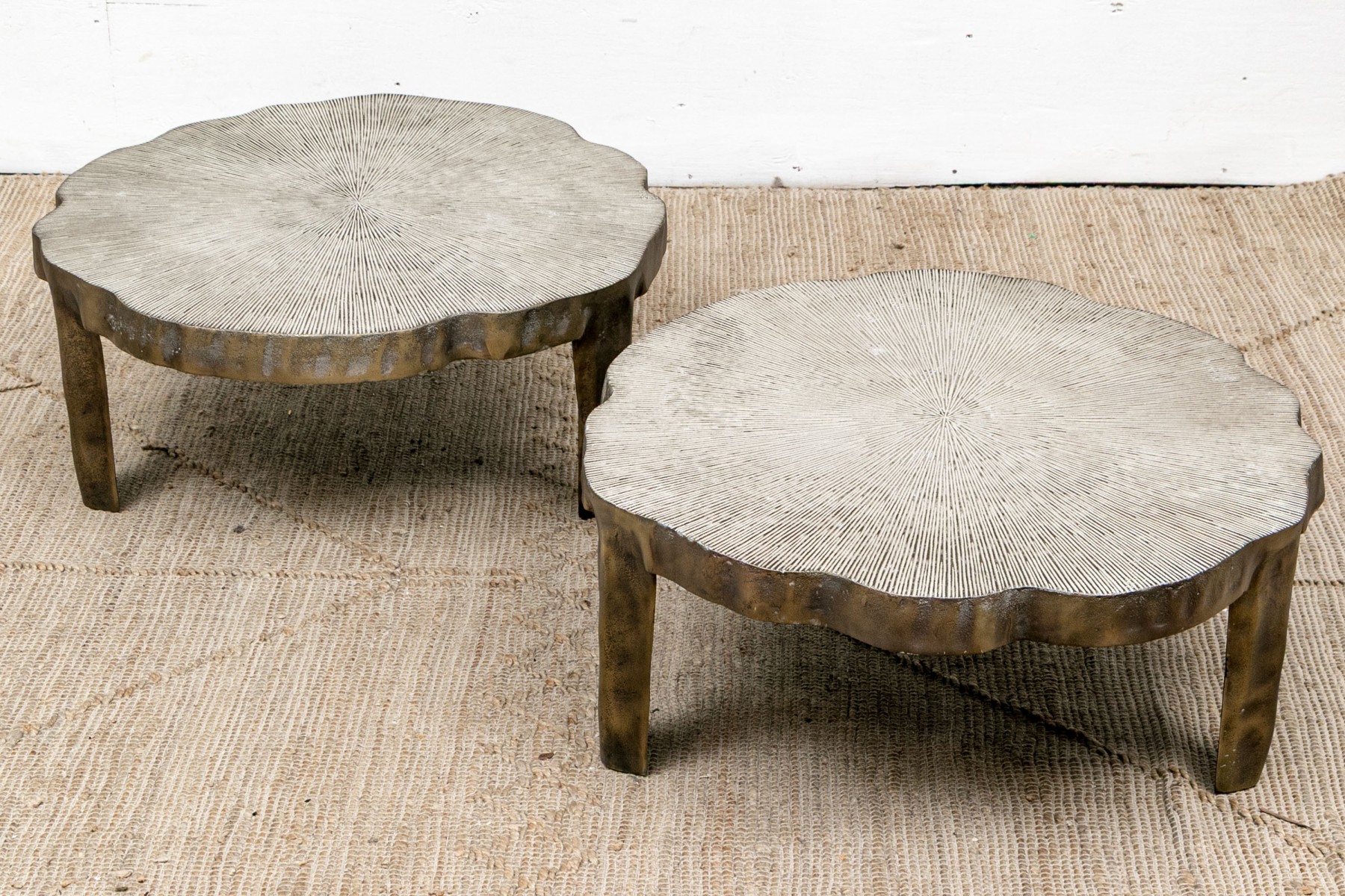 Each table of the pair is supported on three legs with a lily pad form top with naturalistic decoration of a water lily to the table tops. Each is handsome with loads of curb appeal.