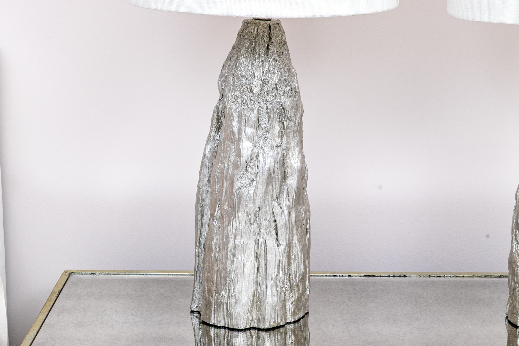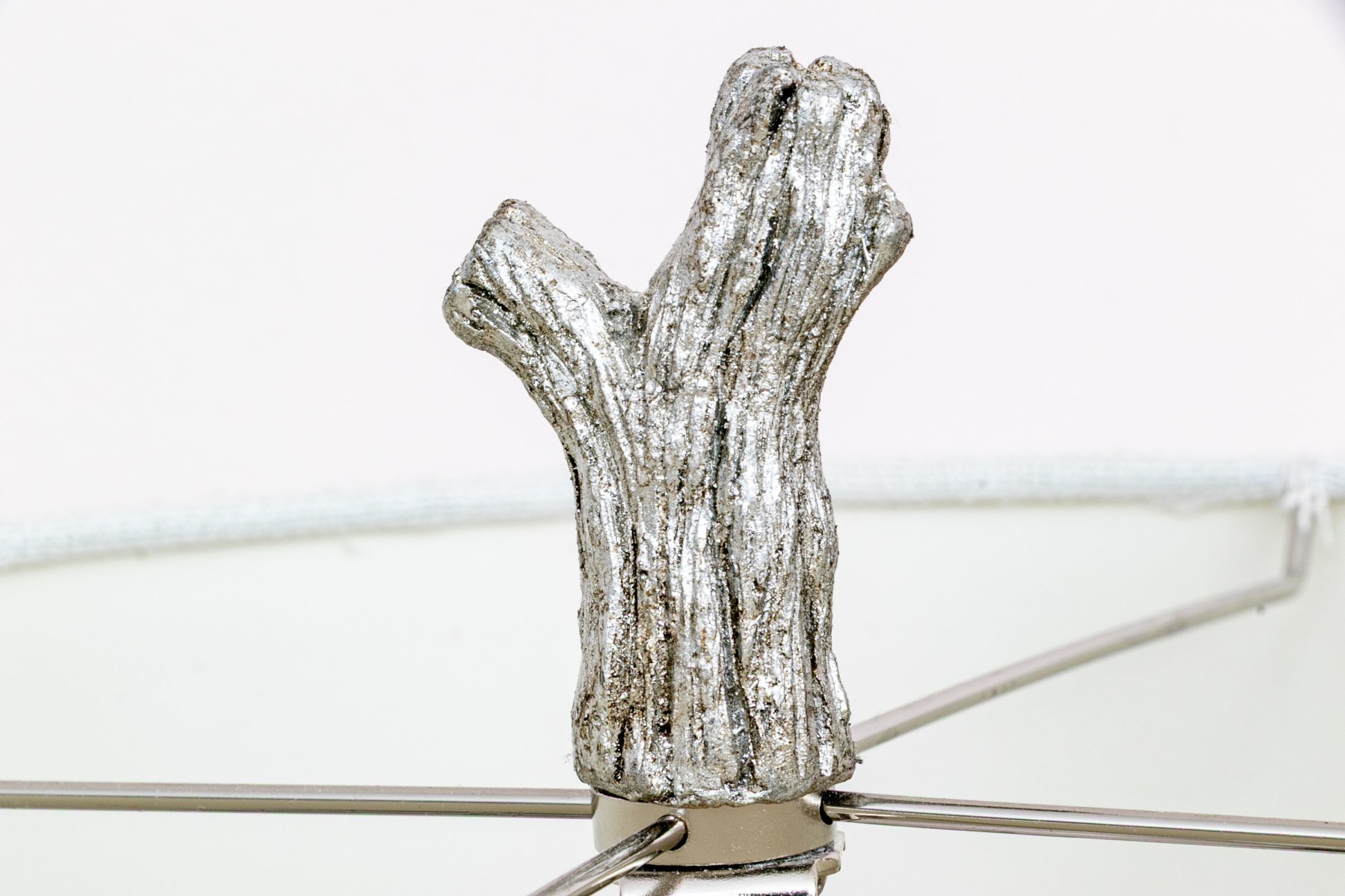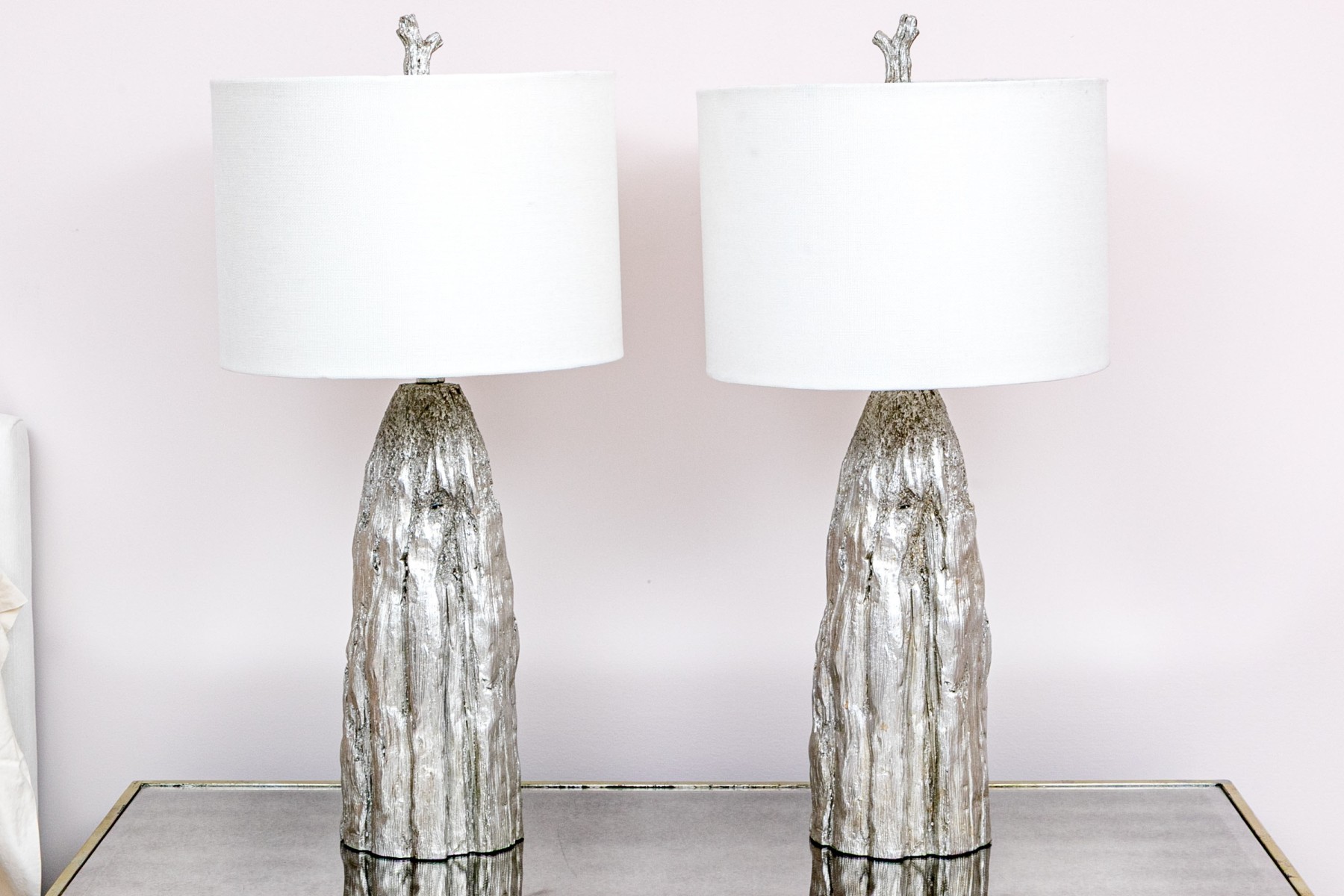 A chic pair of resin table lamps sporting silver tone faux bois trunk forms gently tapering towards the tops. Beautifully textured with naturalistic form. Surmounted by white drum shade with matching branch form finials.