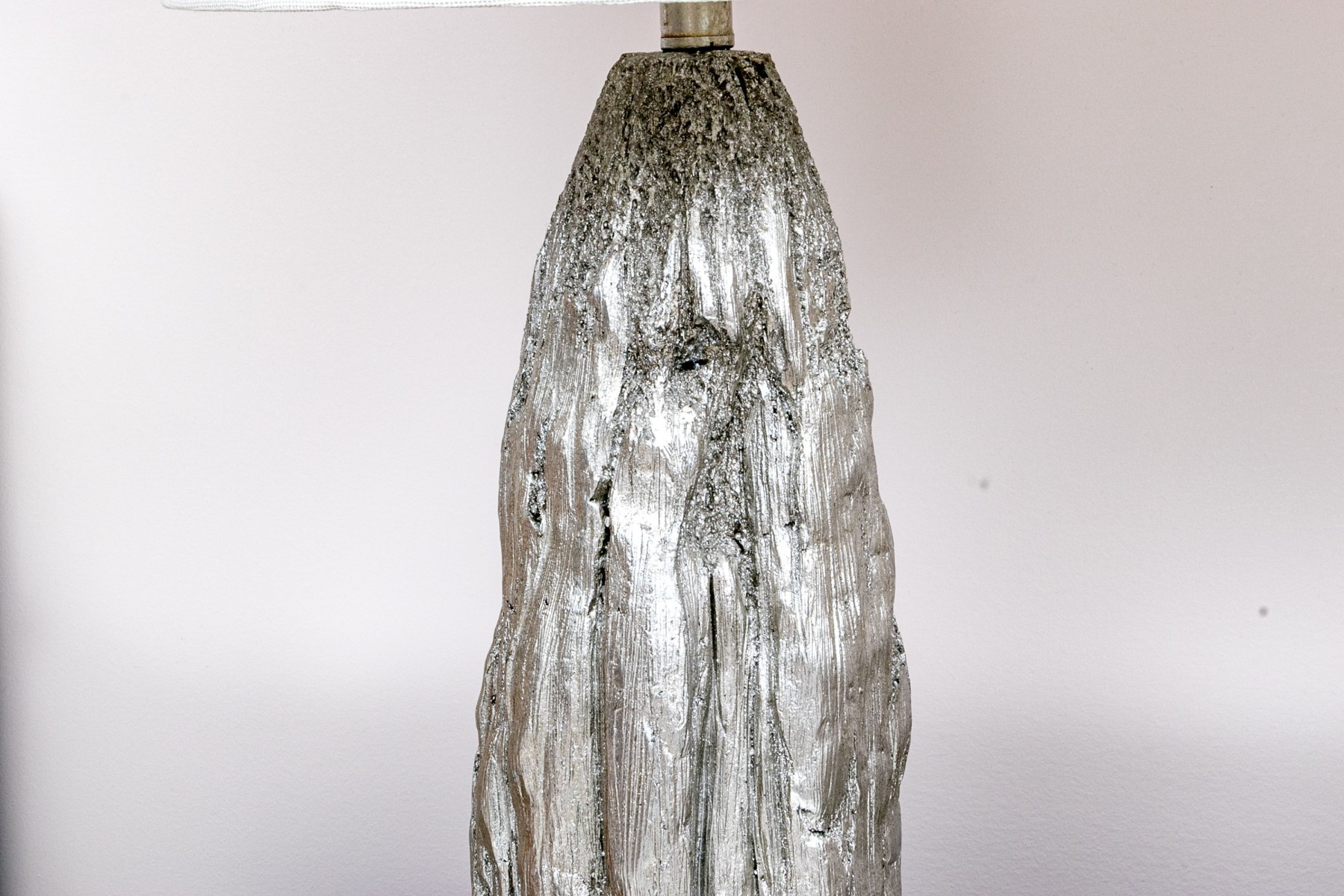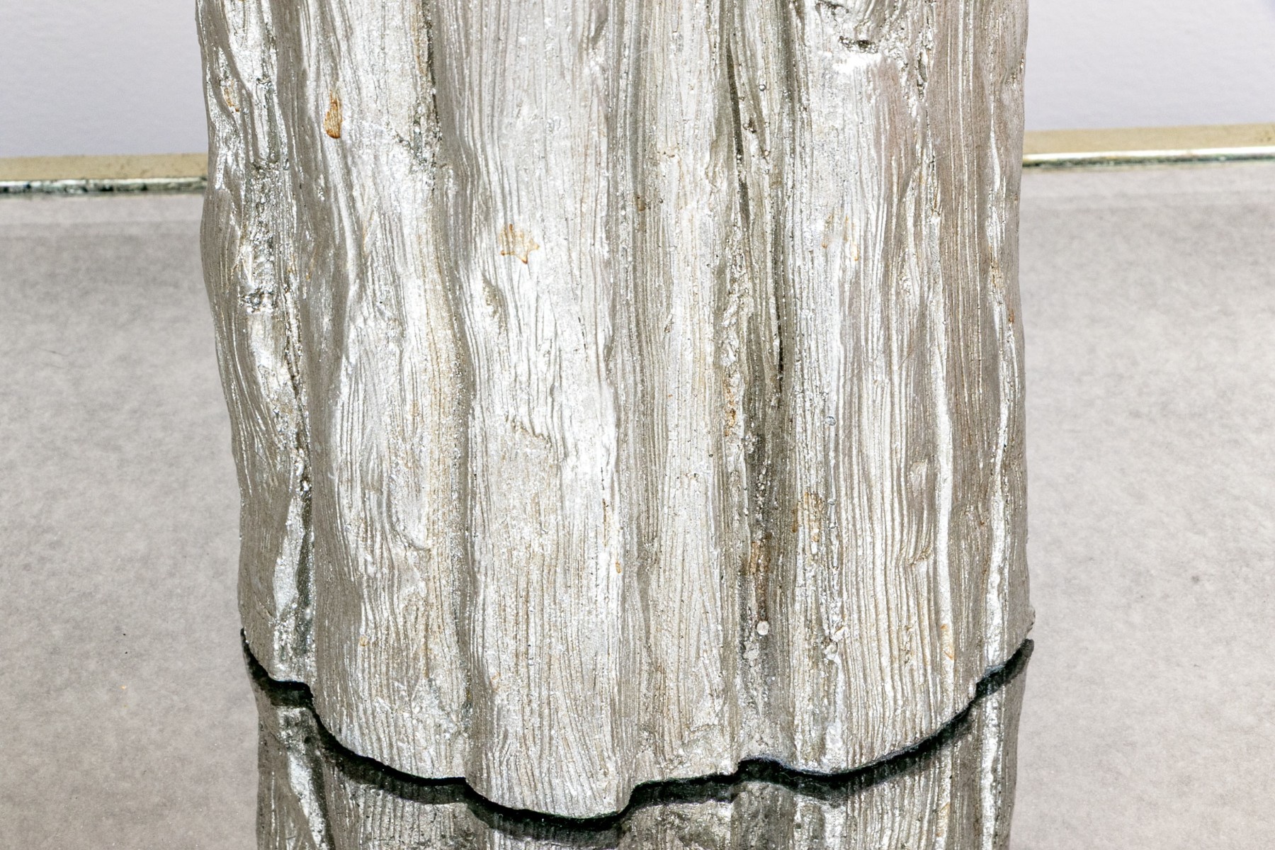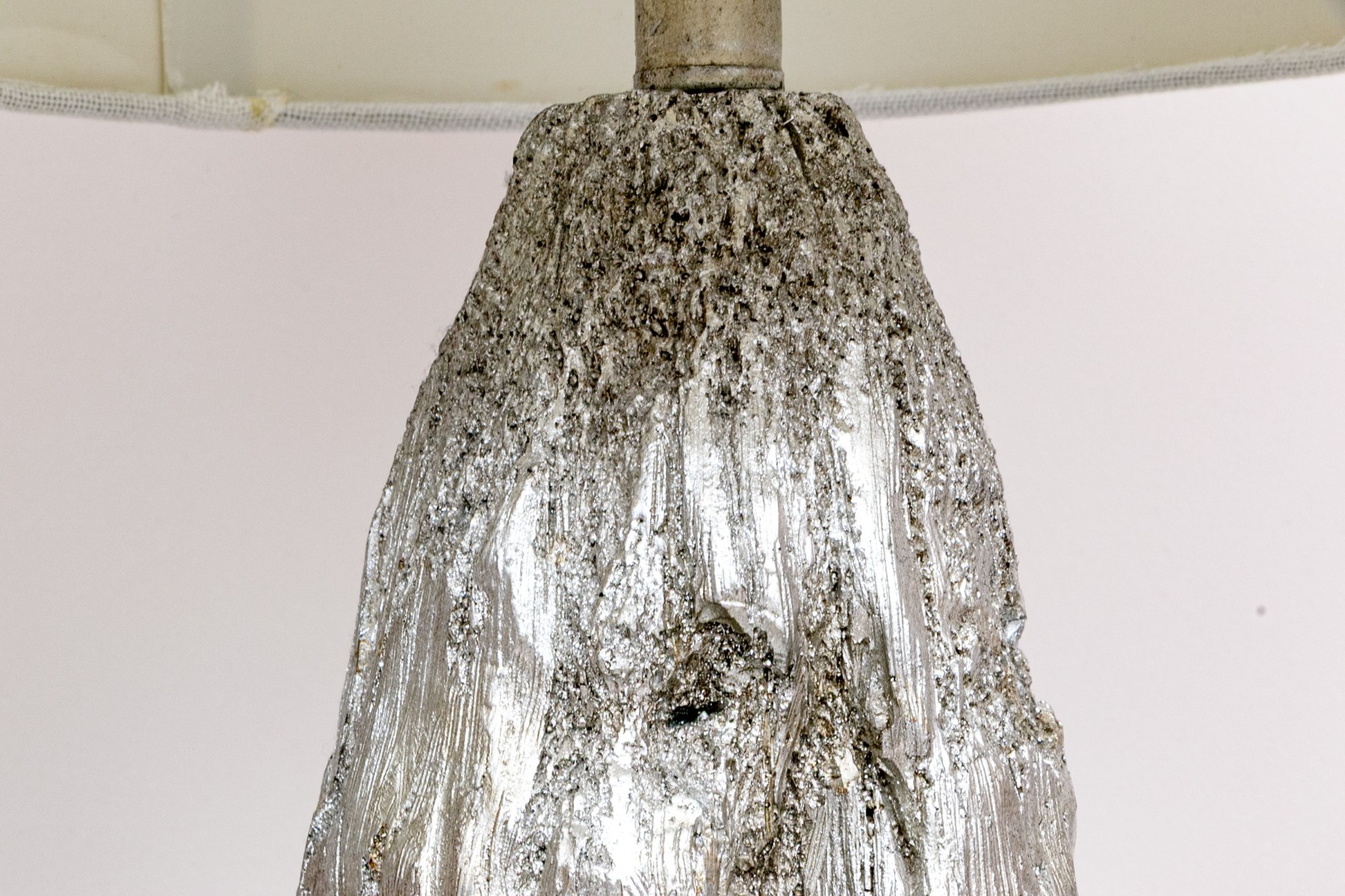 A chic pair of resin table lamps sporting silver tone faux bois trunk forms gently tapering towards the tops. Beautifully textured with naturalistic form. Surmounted by white drum shade with matching branch form finials.