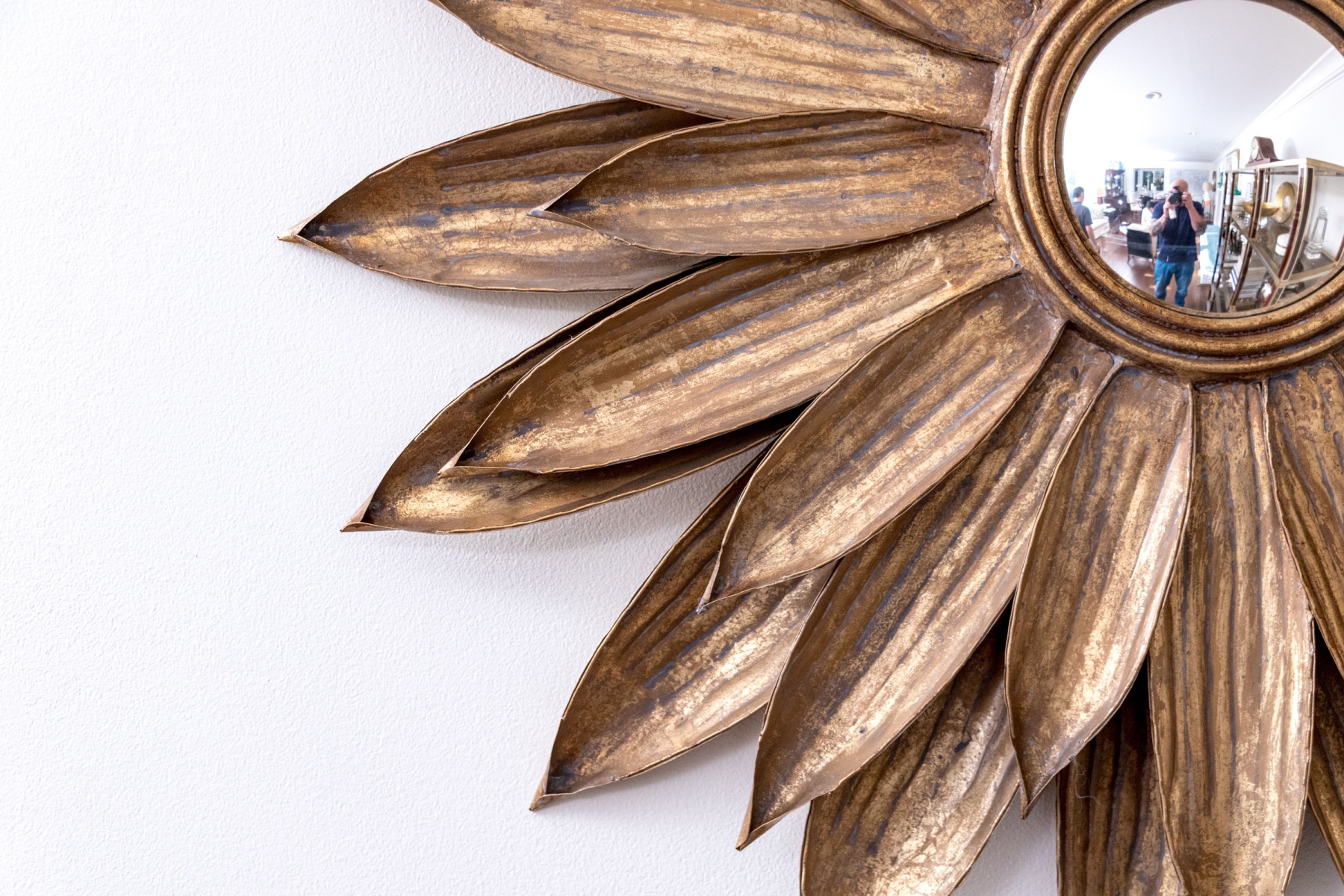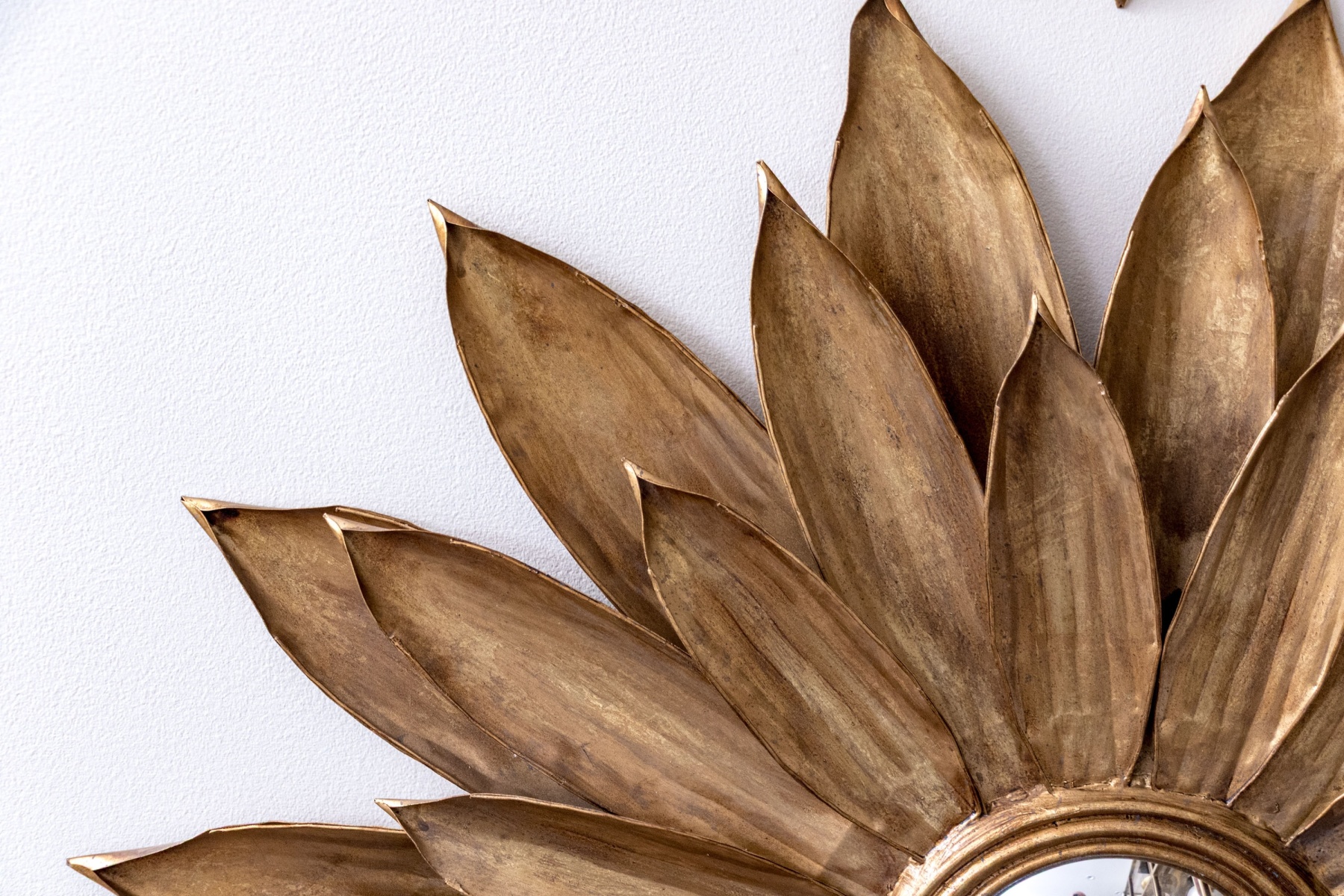 A fabulous pair of wall mirrors with beautiful flower forms suitable for both traditional and contemporary aesthetics. Circular convex centers are surrounded by tole gilt metal petals with rustic detailing adding great visual intrigue and texture along subtle veining and curled petal tips.