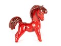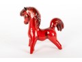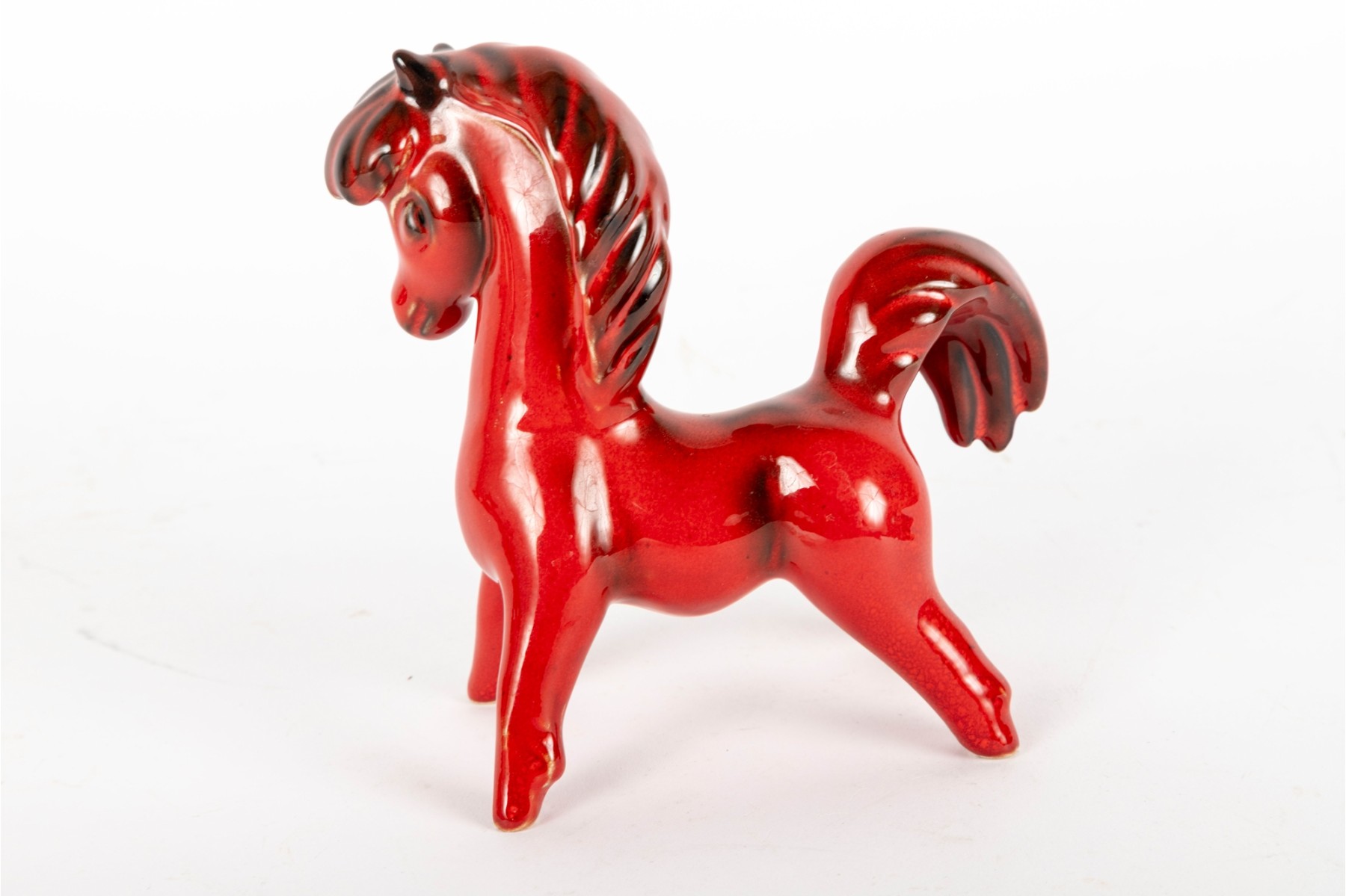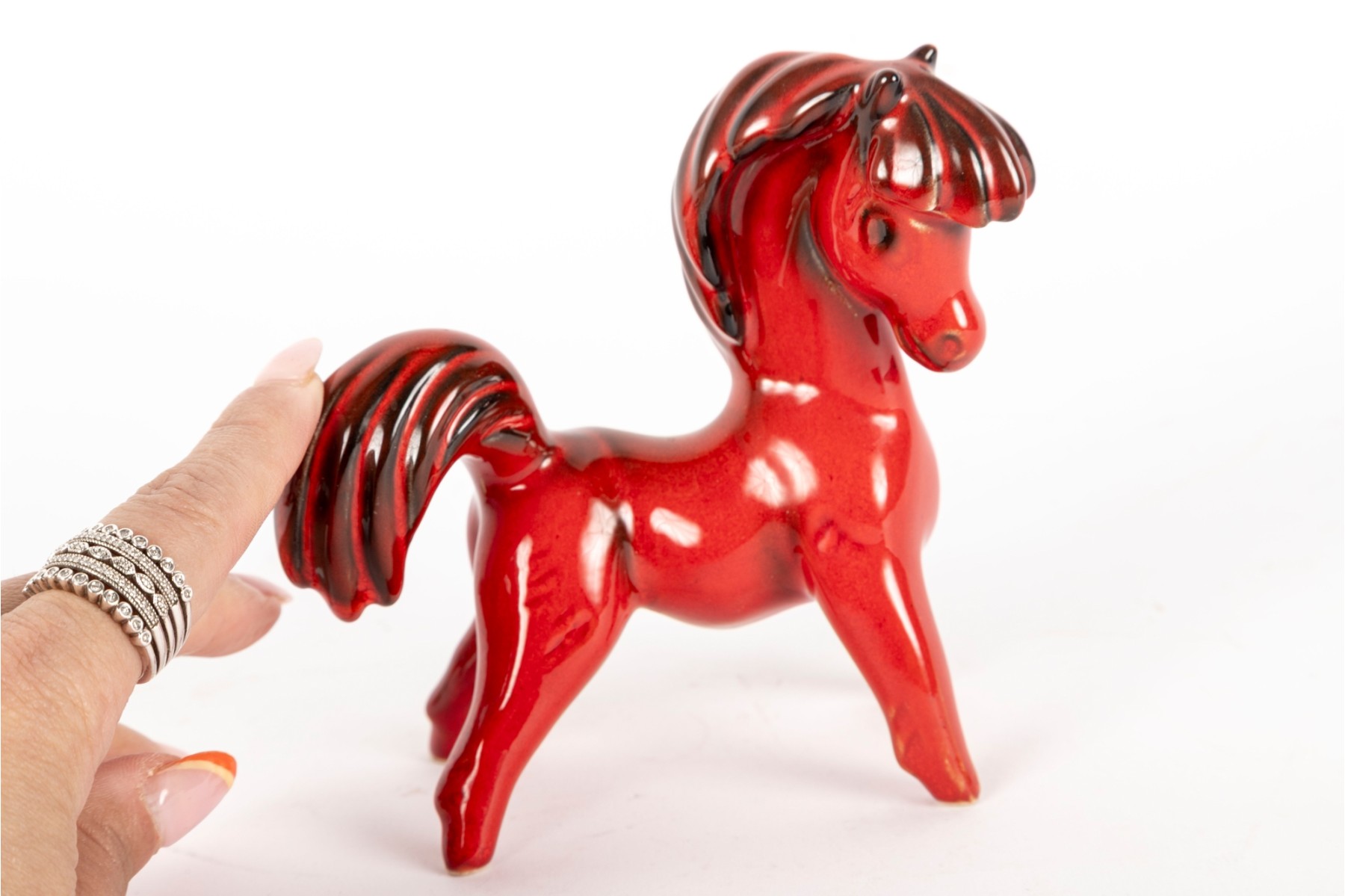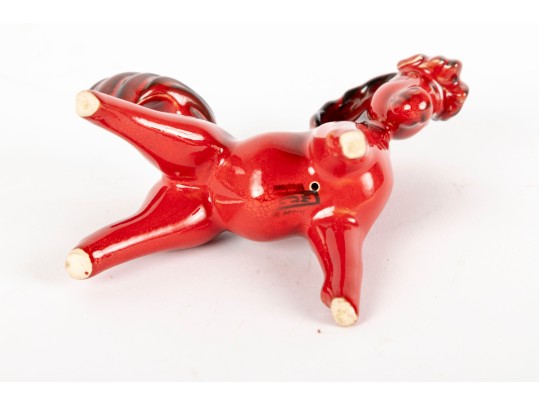 A chic ceramic figure of a cute horse in vibrant red with black shadows throughout a nicely detailed pane and high arched tail. Marked on the underbelly.