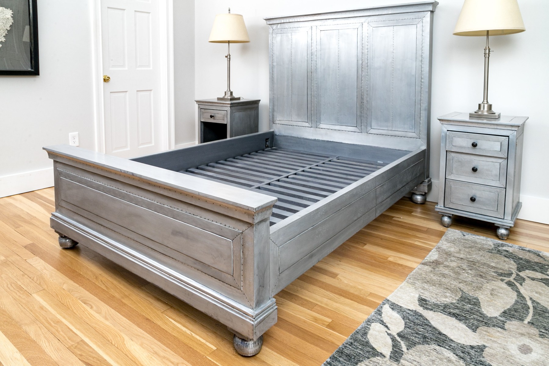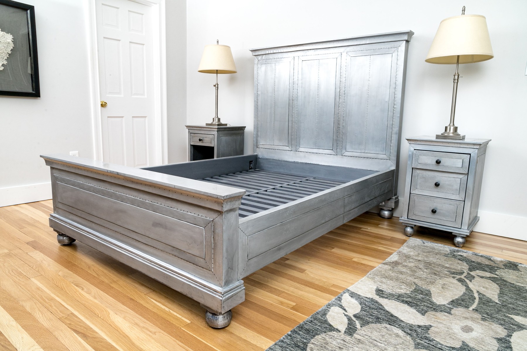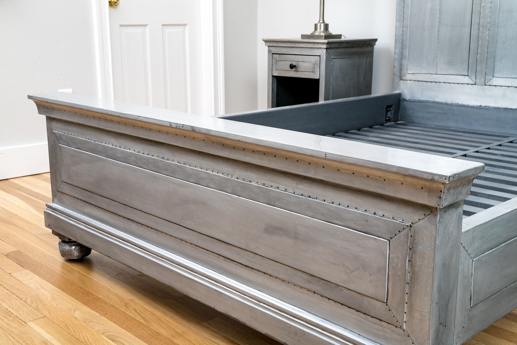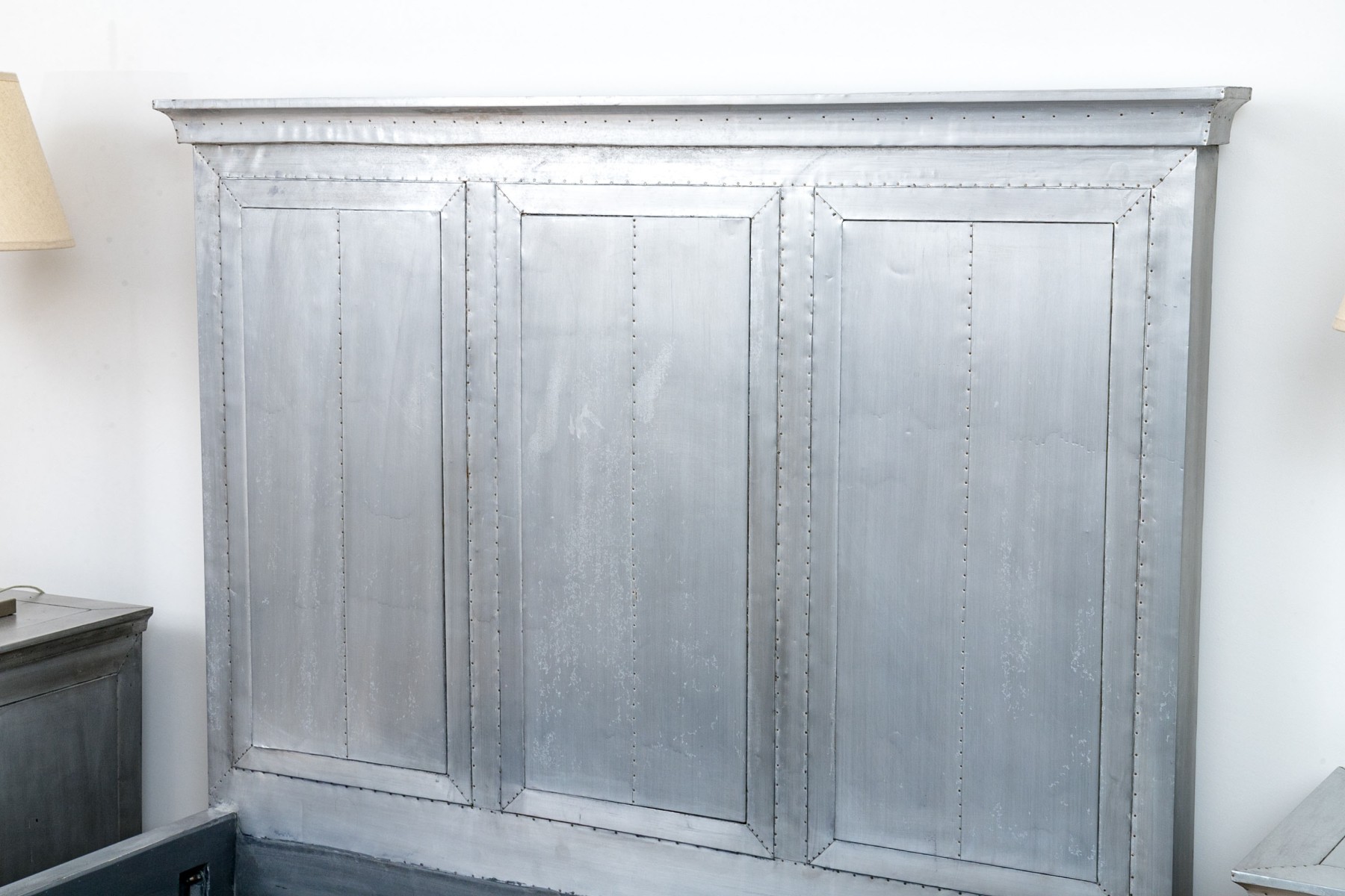 A fabulous Restoration Hardware full size bed frame with a striking blend of industrial chic and farmhouse elegance emphasized by a traditional form wrapped in gray metal. Detailed with nail tacks and beveled paneling, raised on pleated bun feet.
