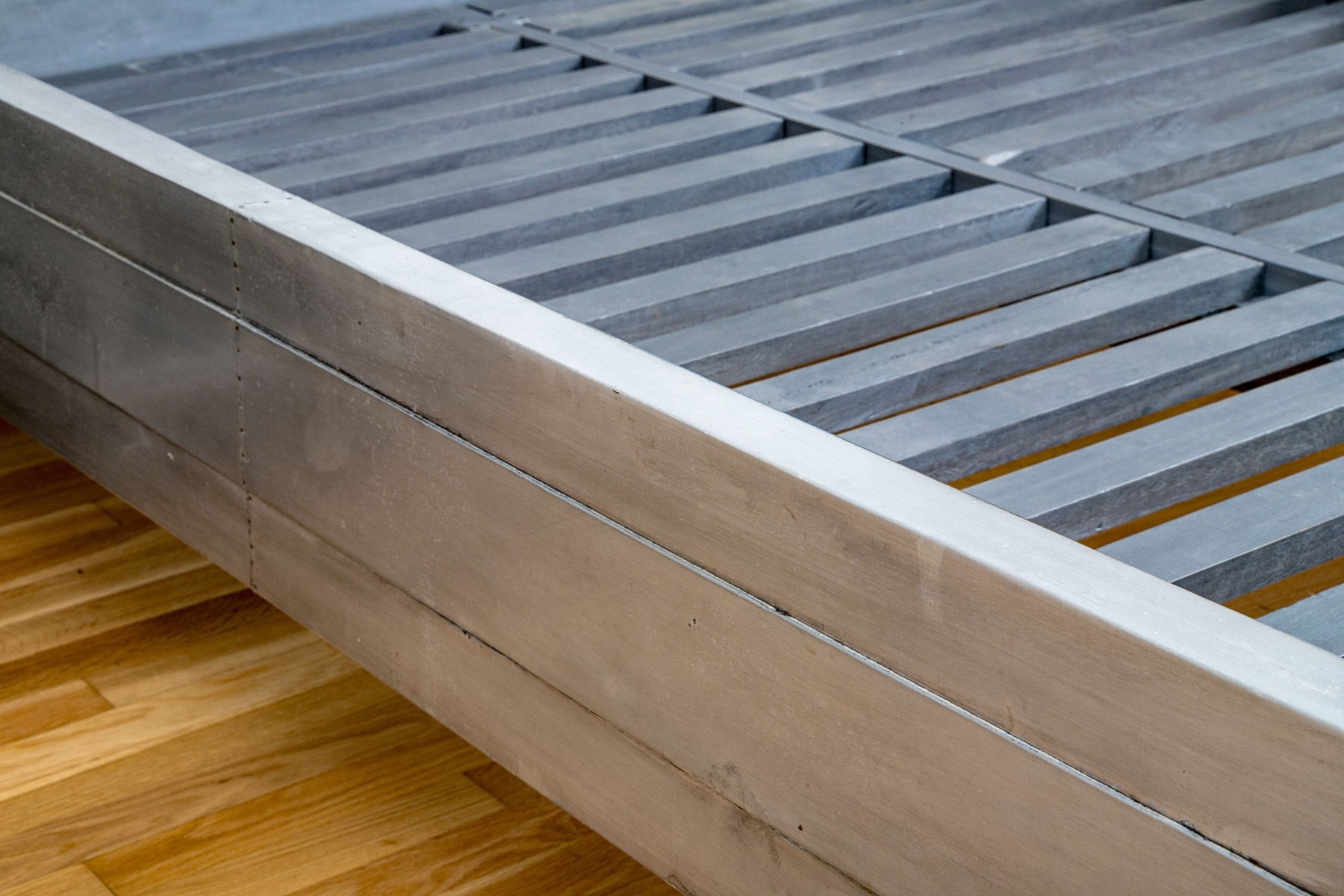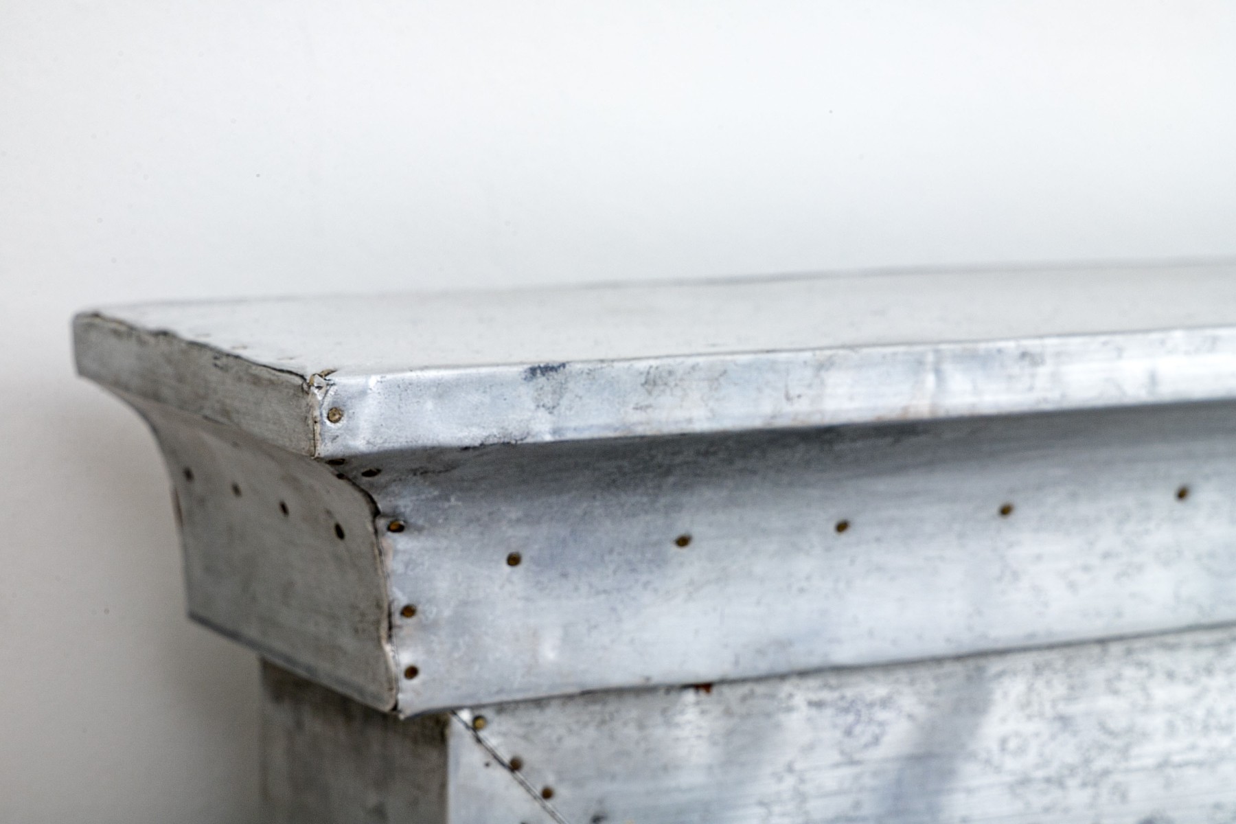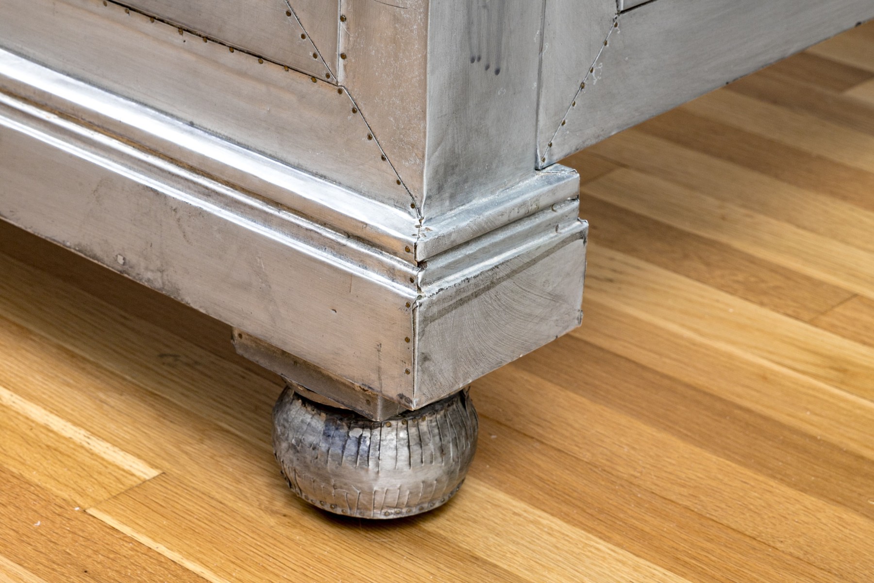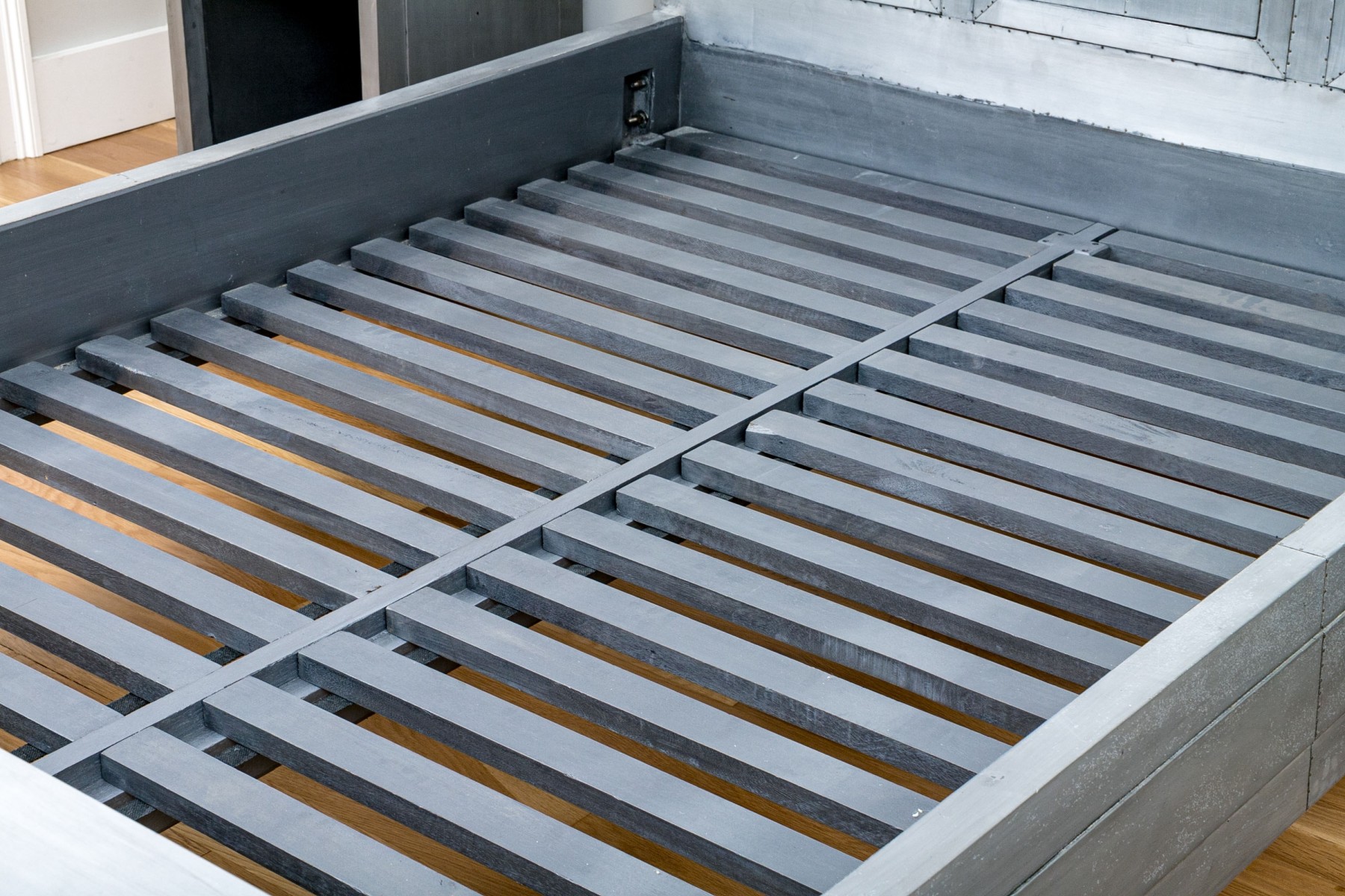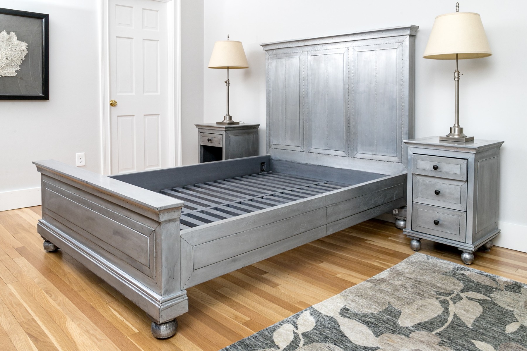 A fabulous Restoration Hardware full size bed frame with a striking blend of industrial chic and farmhouse elegance emphasized by a traditional form wrapped in gray metal. Detailed with nail tacks and beveled paneling, raised on pleated bun feet.