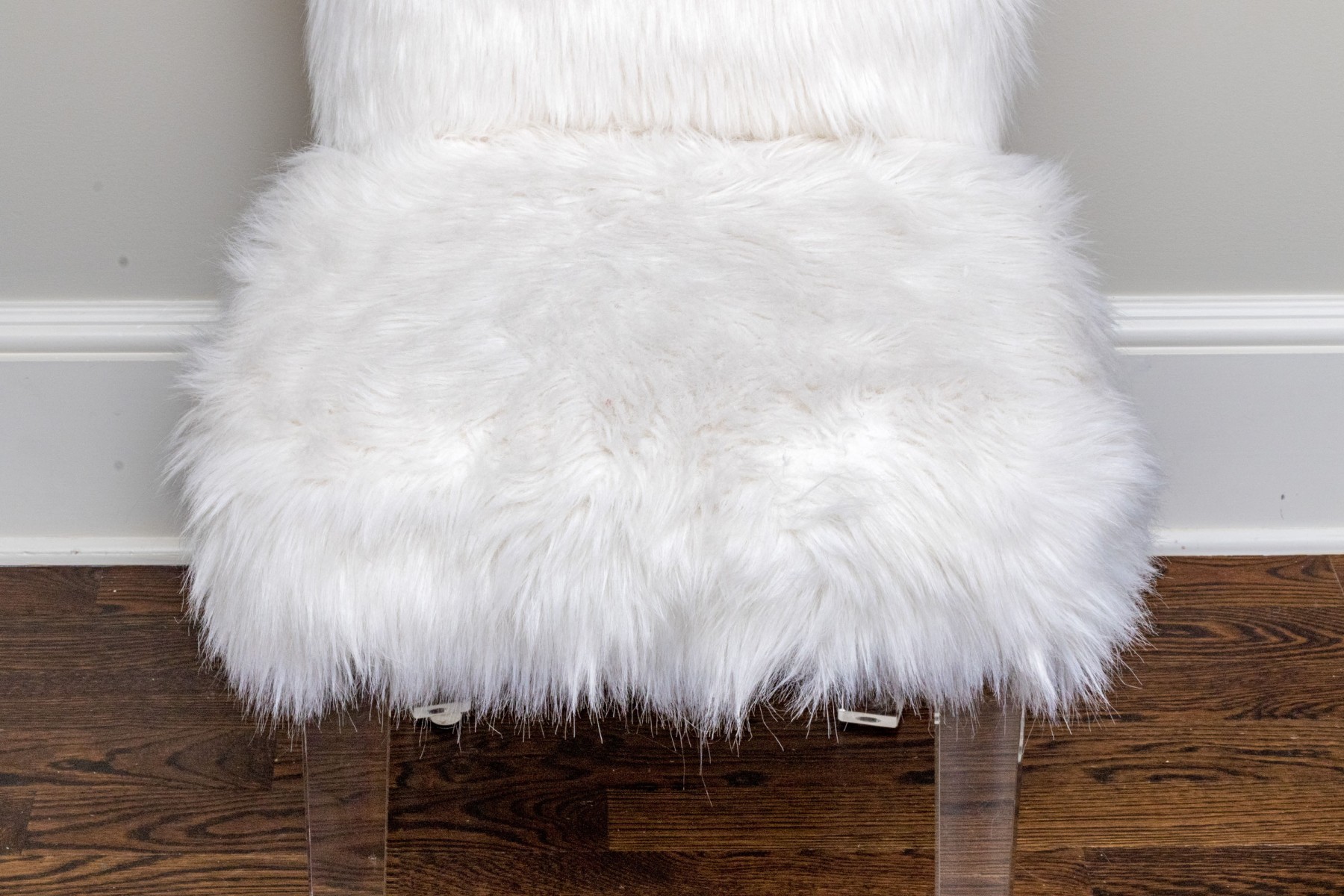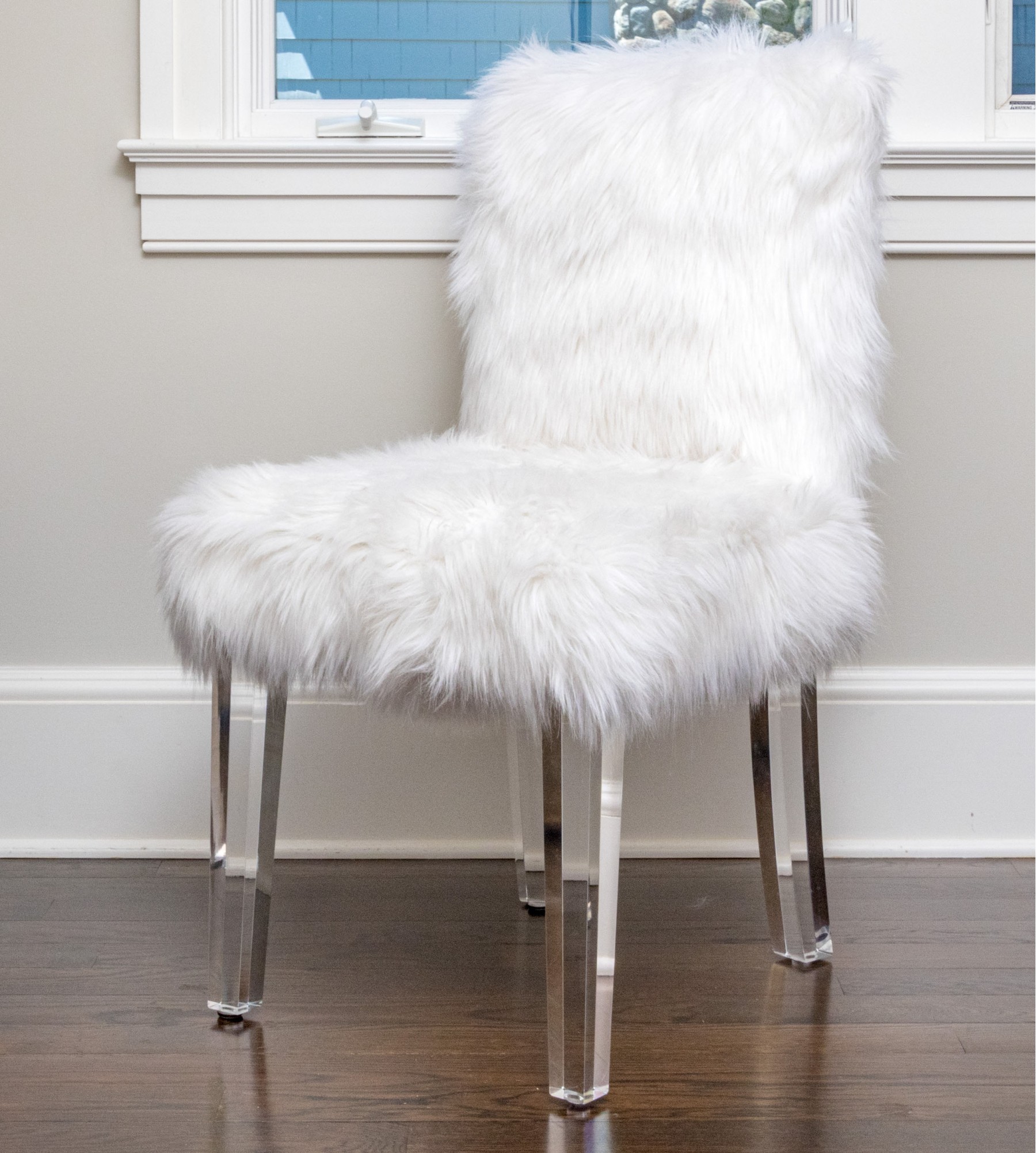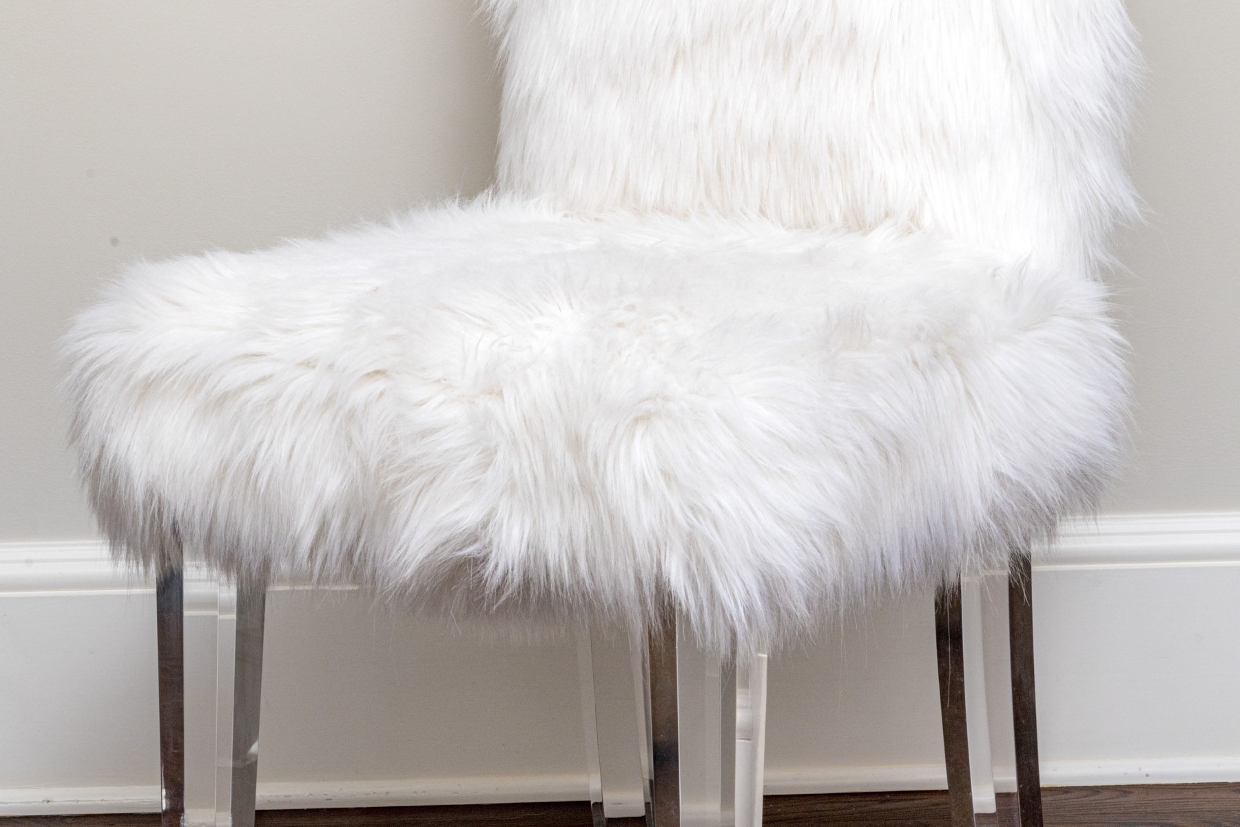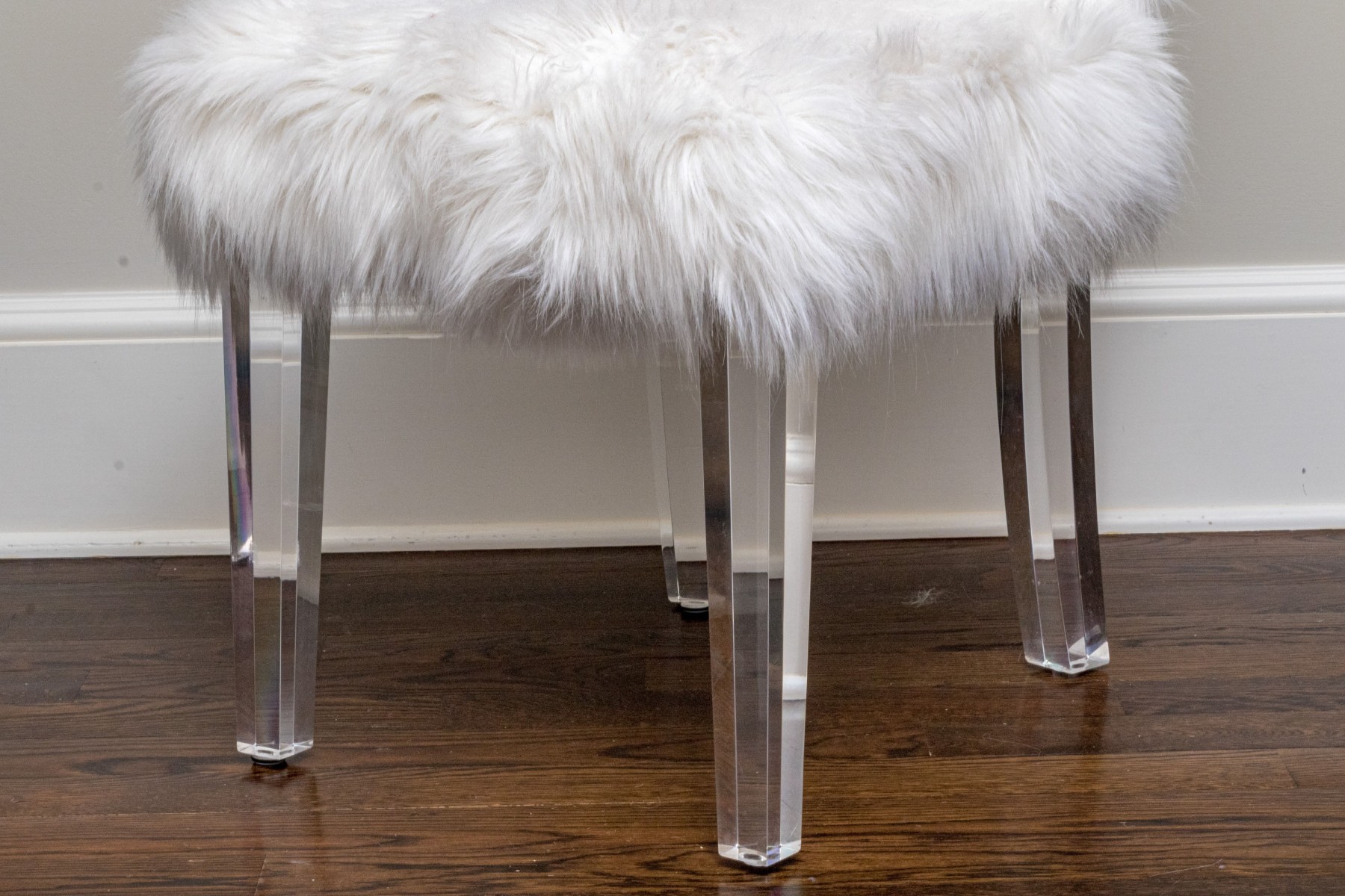 Fantastically raised on four lucite legs with furry upholstery to the seat and seat back.
