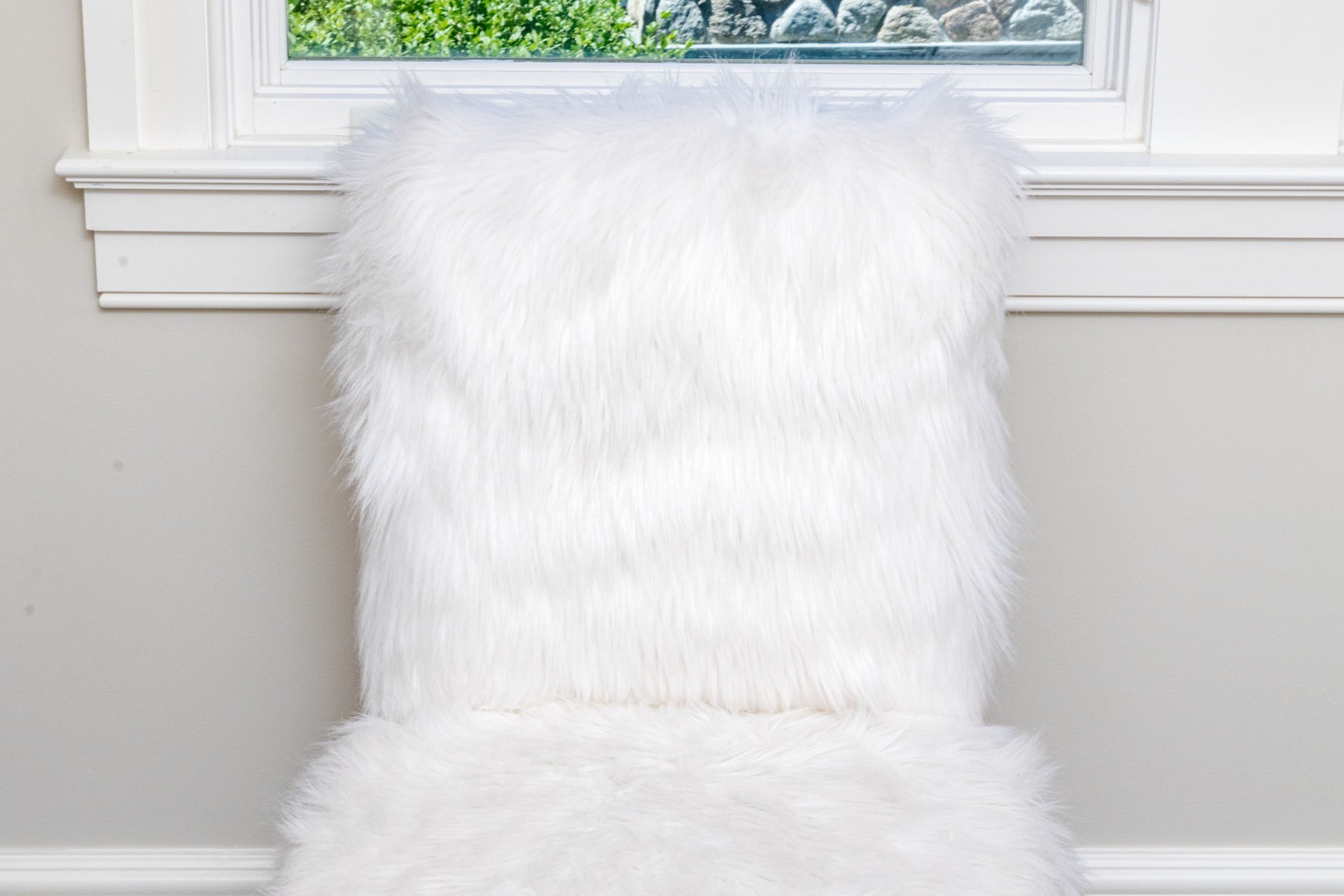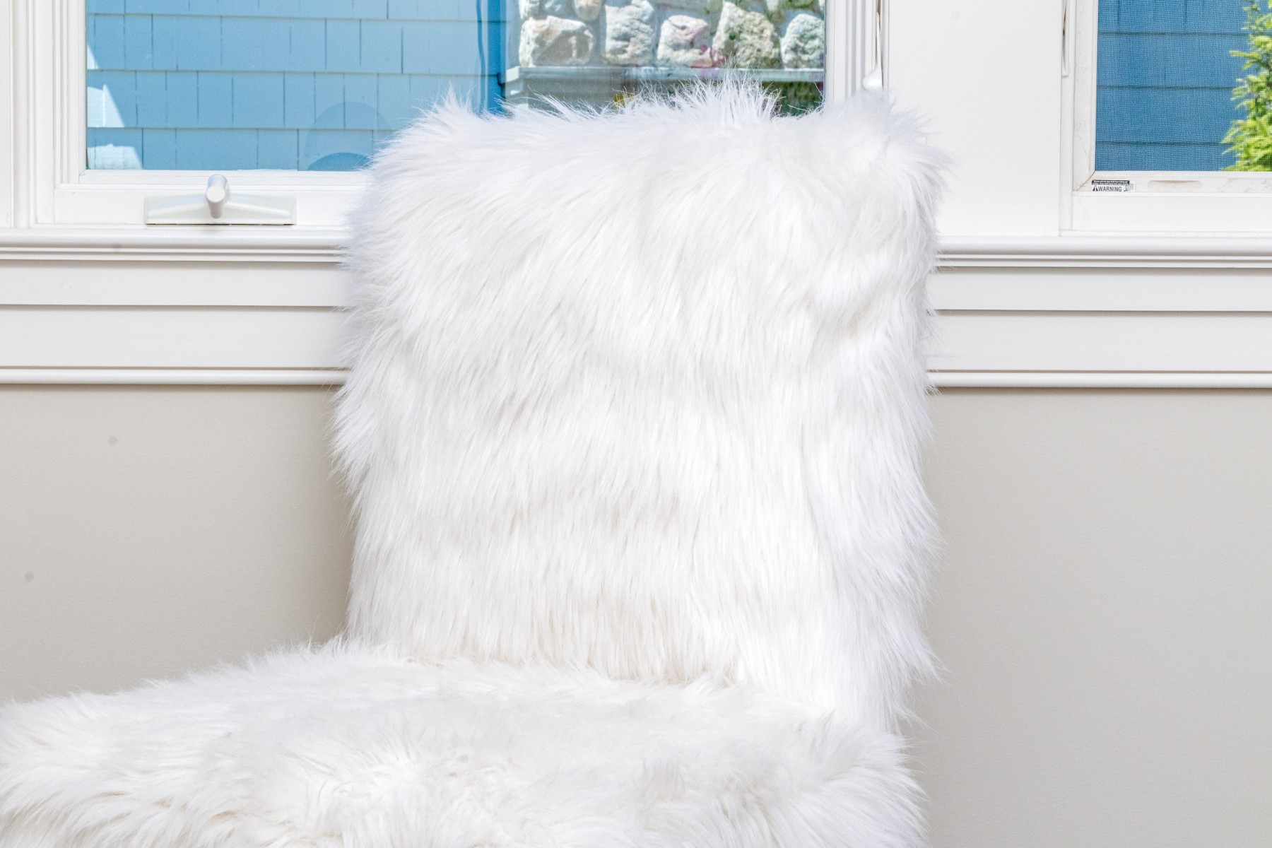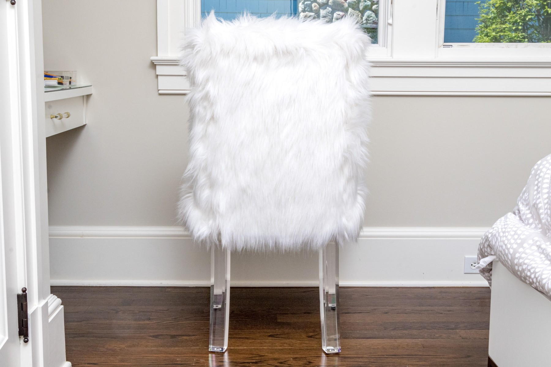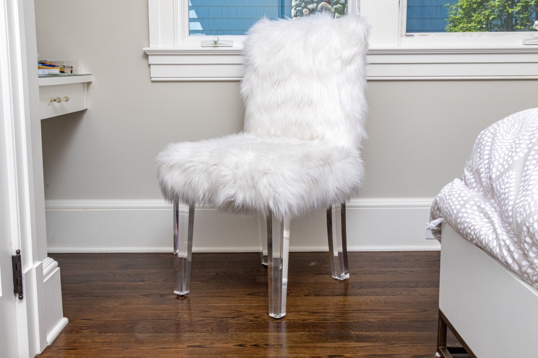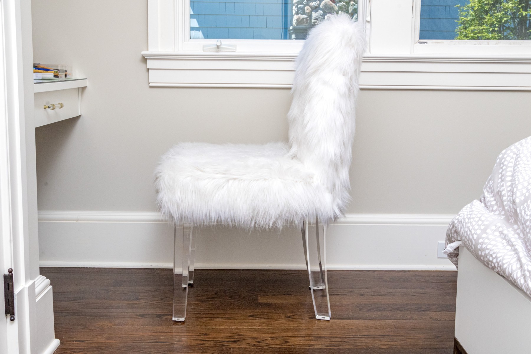 Fantastically raised on four lucite legs with furry upholstery to the seat and seat back.
