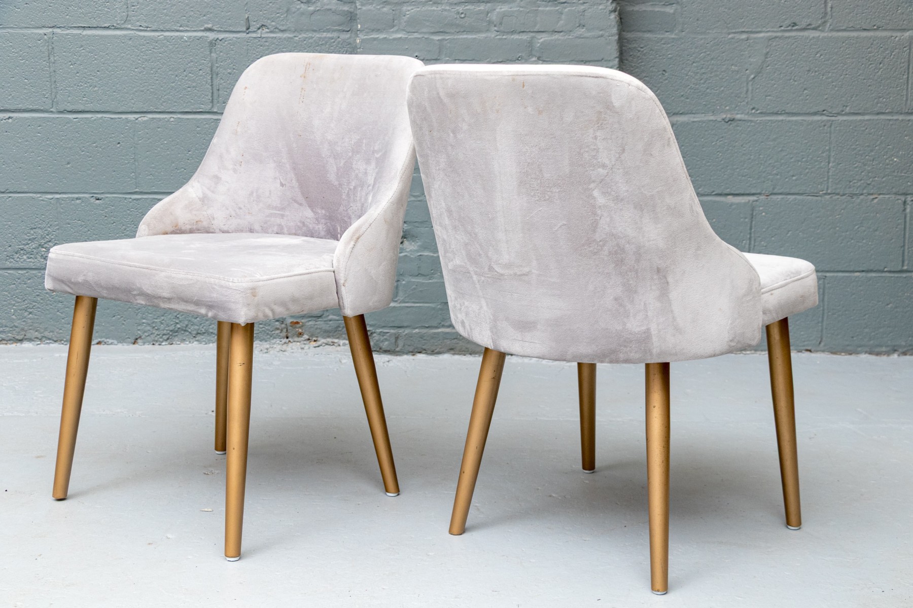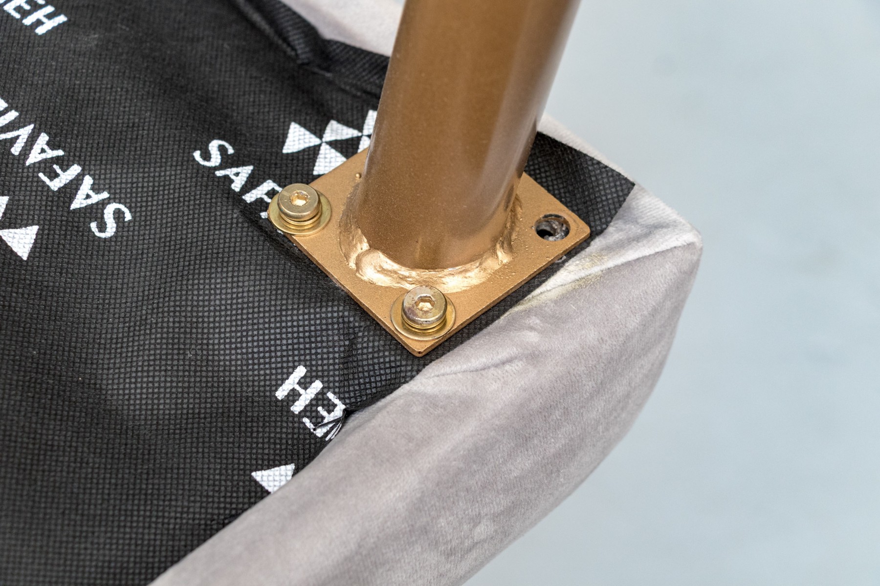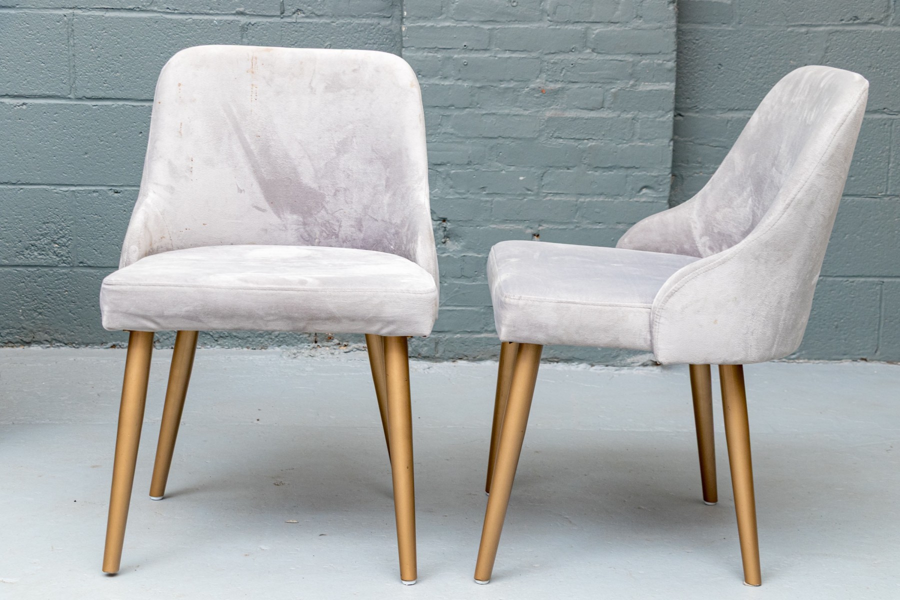 On four bronzed finished legs with grey upholstered seats and seat backs.