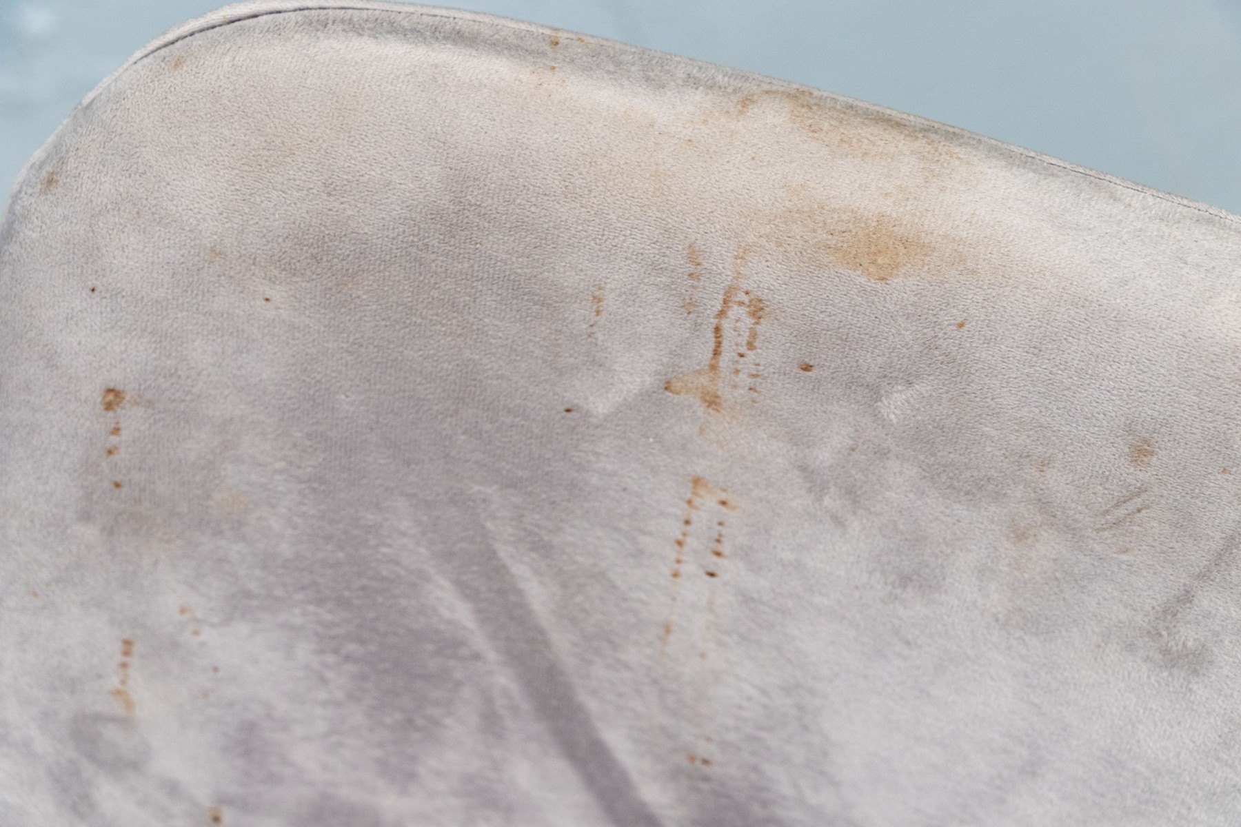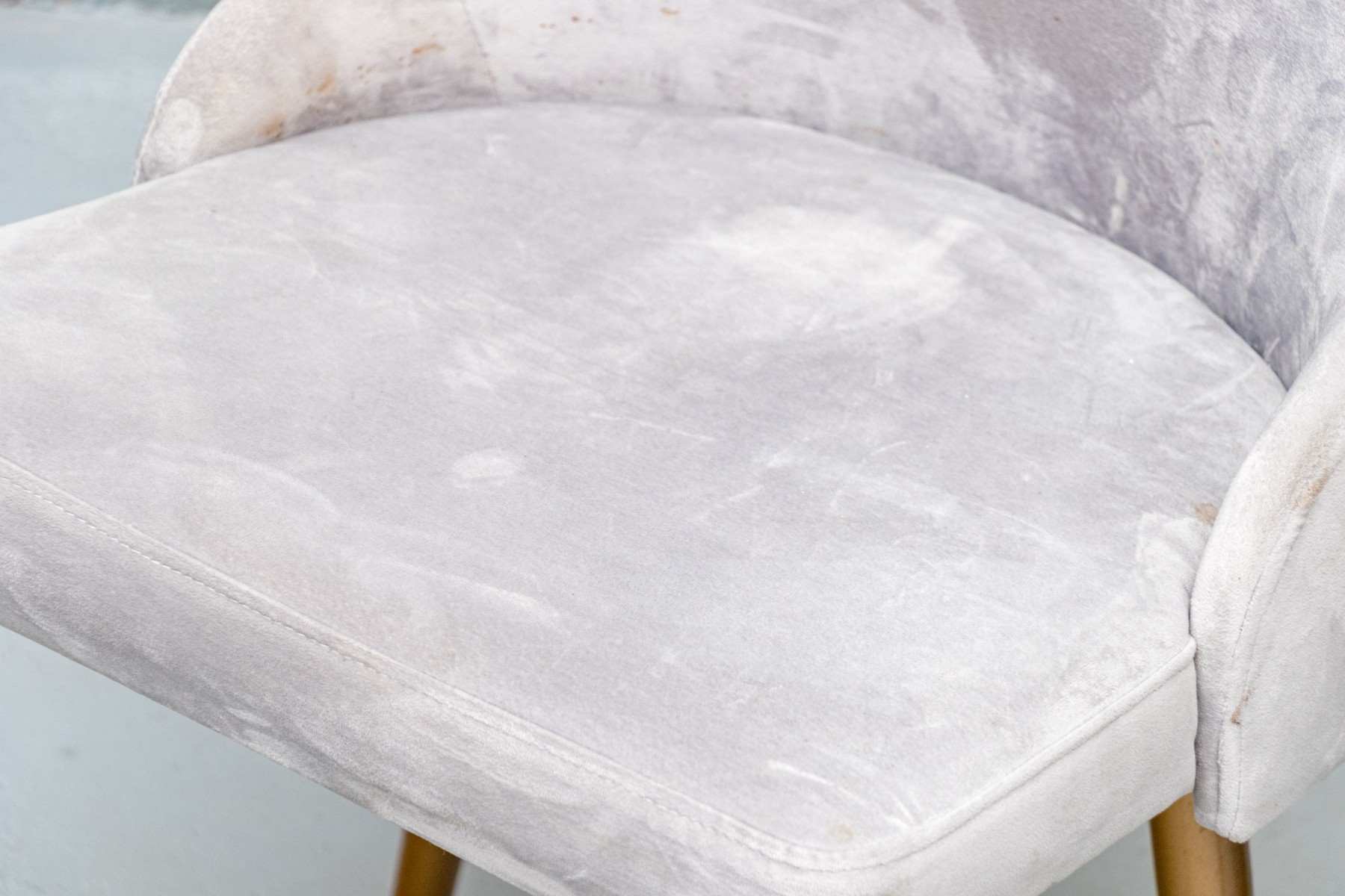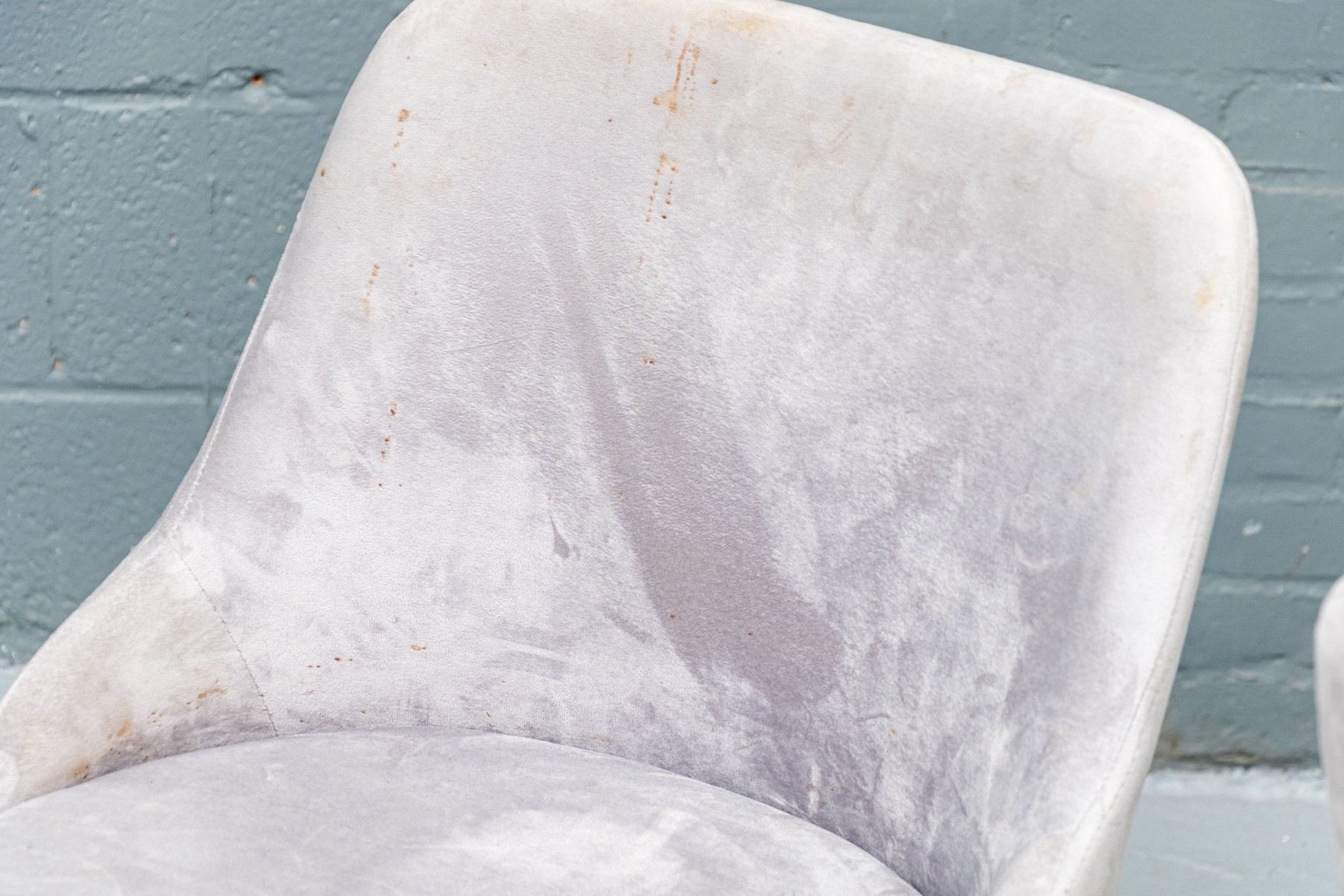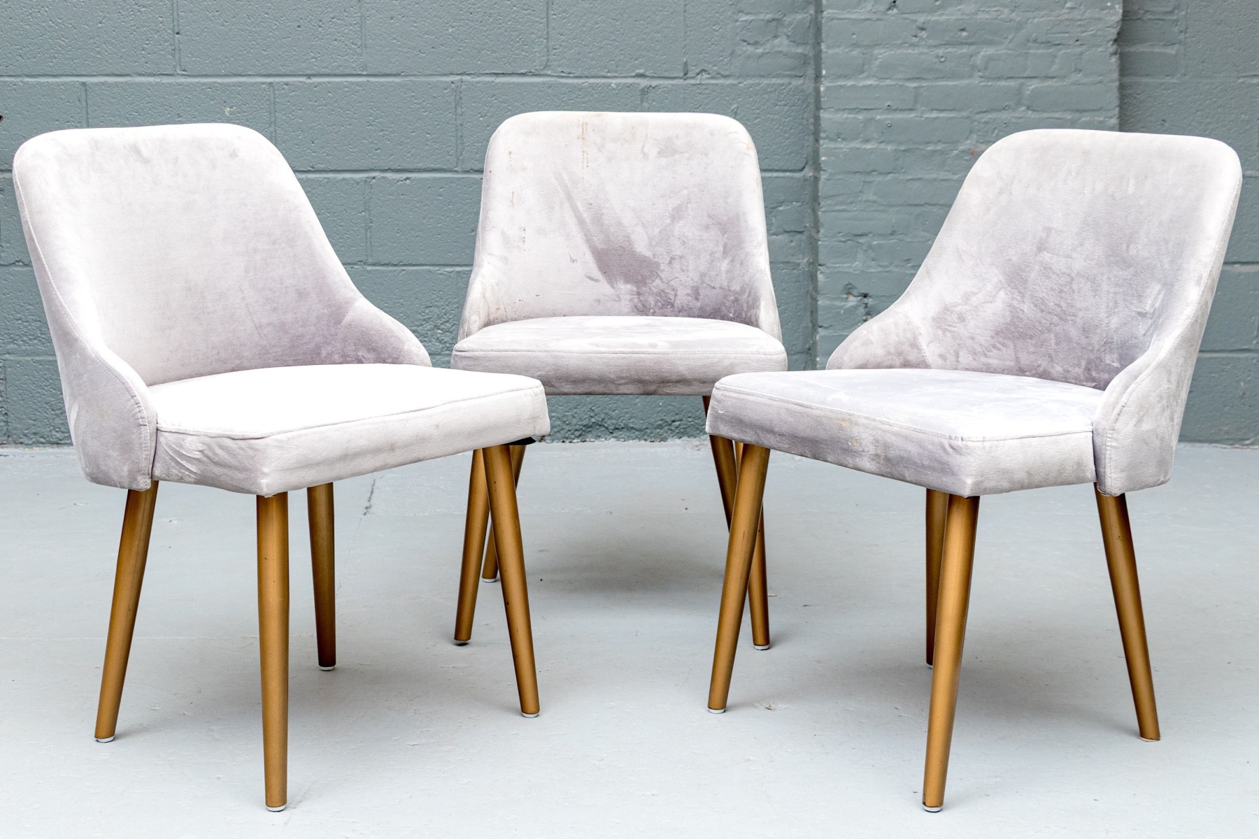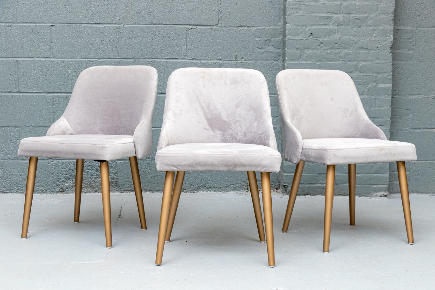 One chair with loose front left leg. There is screws and hardware missing to the bases of all three which could likely be purchased after market. Gentle wear to the upholstery, presents well. *Please note: Items may not include all original parts or accessories. Some screws, brackets, hardware, assemblies may be missing.