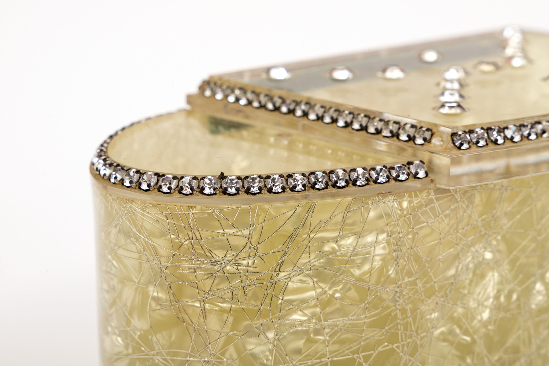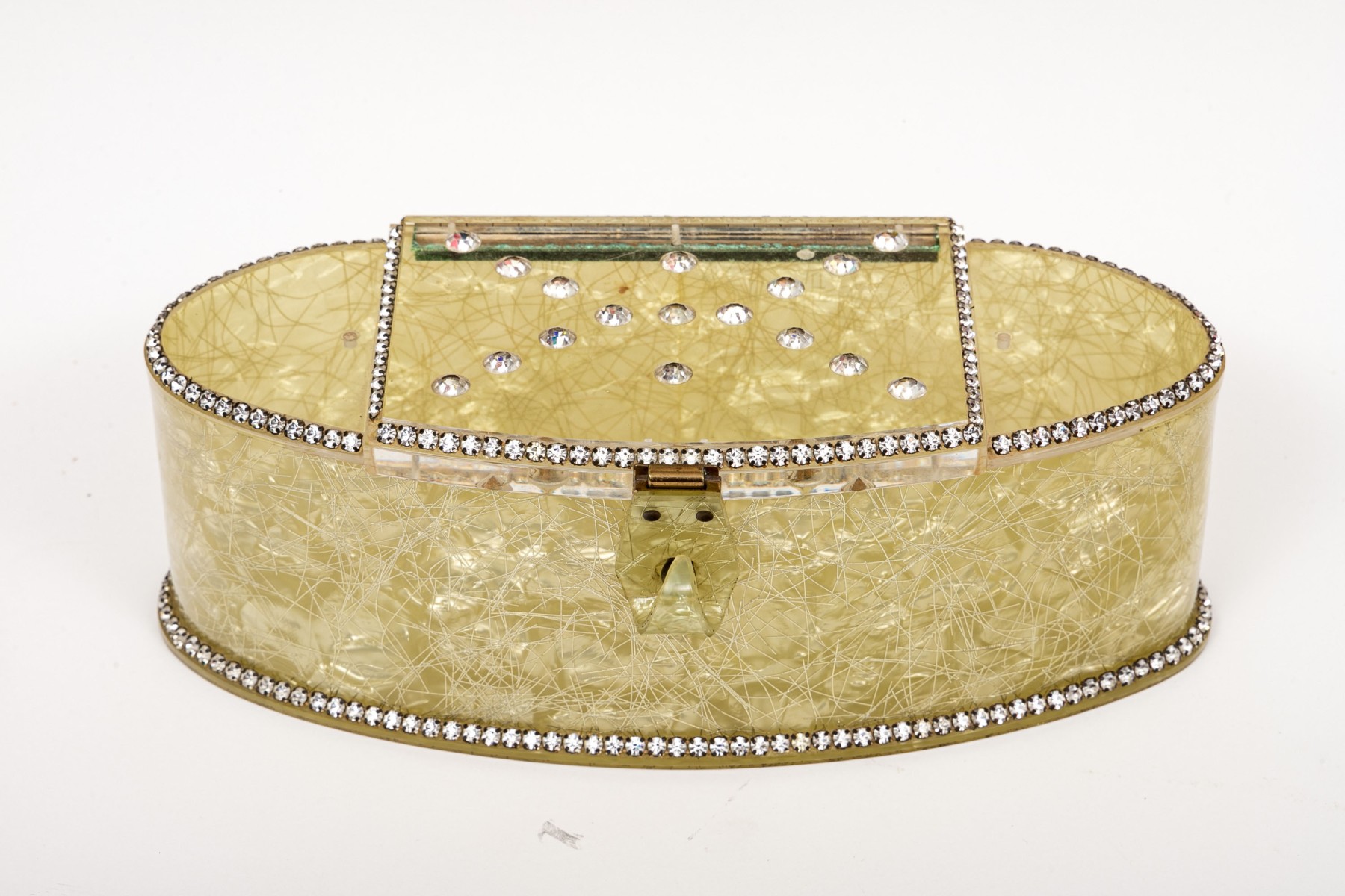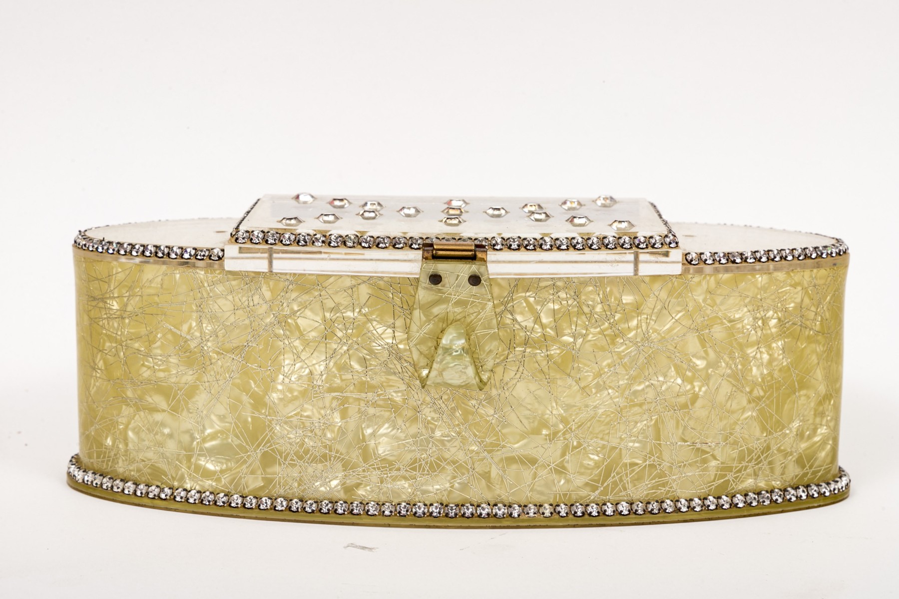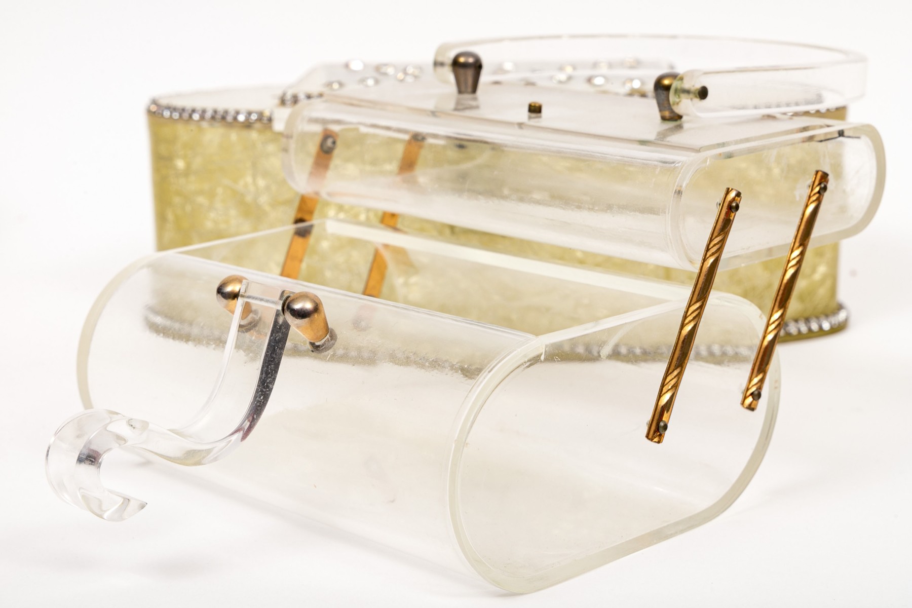 Some wear commensurate with some age and use along with storage. Slight wear to the mounts and lucite but overall a great lot of vintage handbags and dresser boxes. Please review the photos as they are part of the condition report.