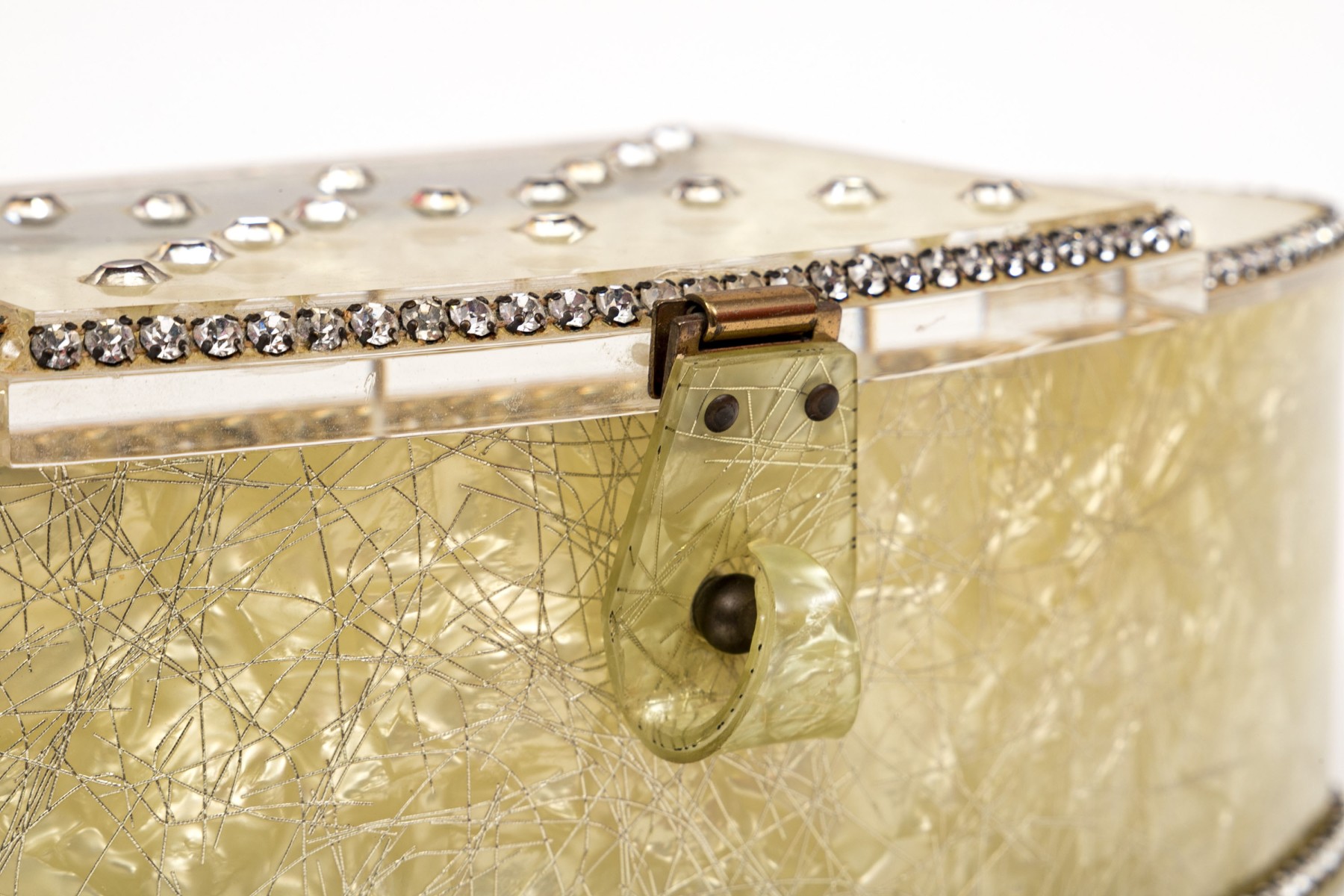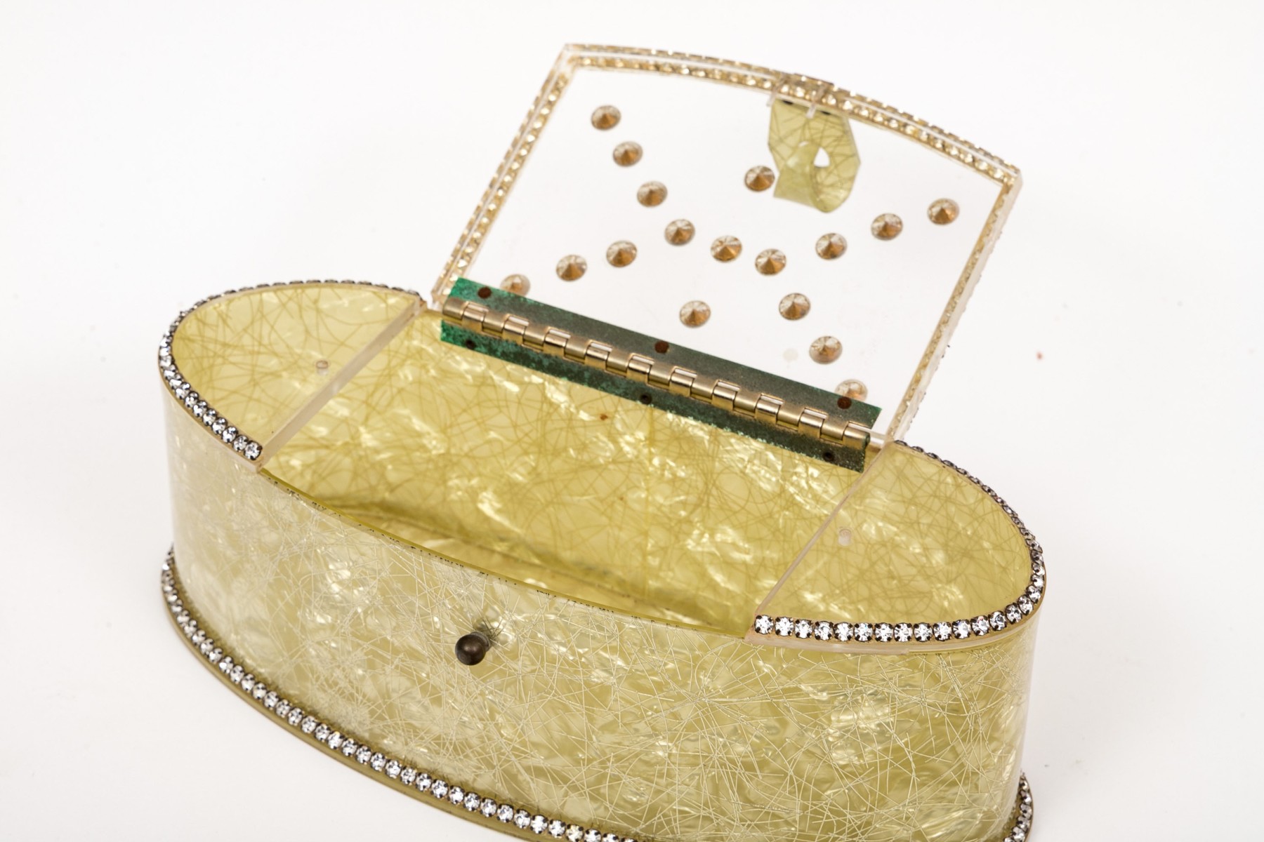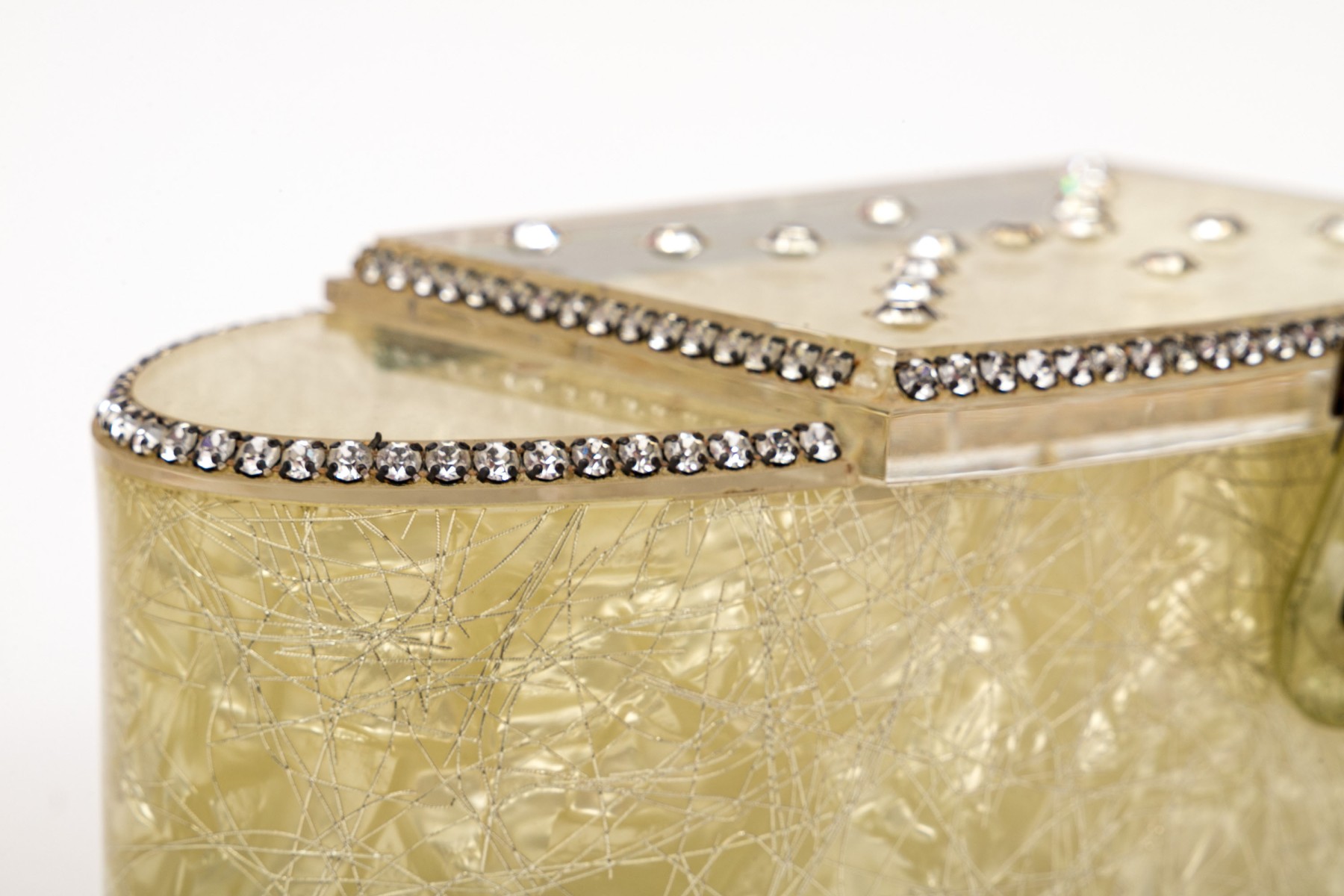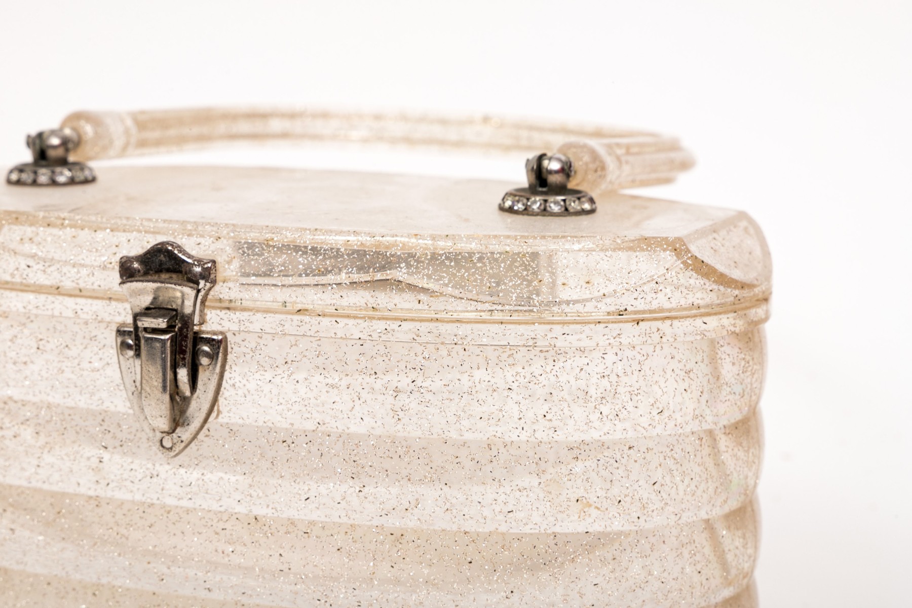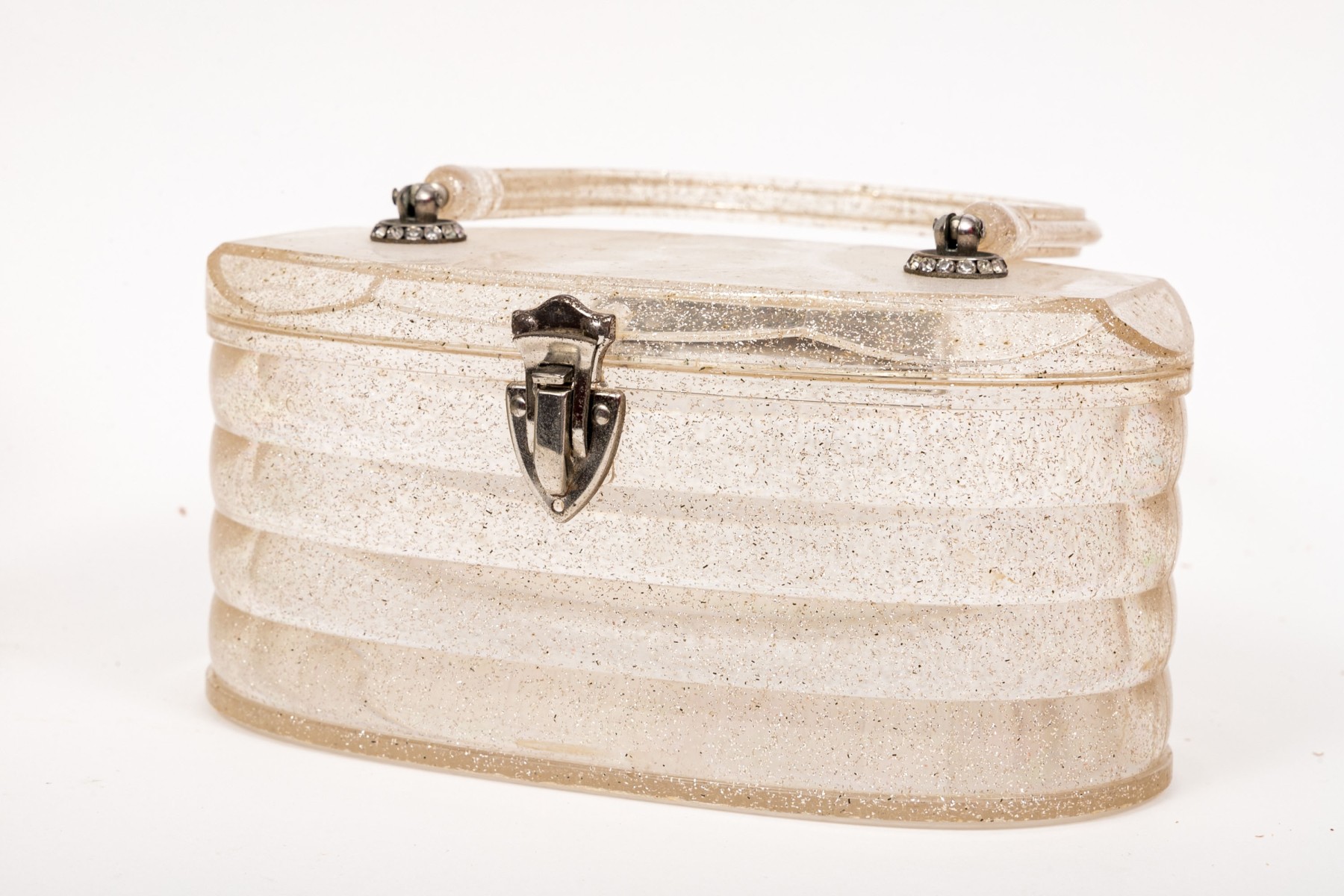 Some wear commensurate with some age and use along with storage. Slight wear to the mounts and lucite but overall a great lot of vintage handbags and dresser boxes. Please review the photos as they are part of the condition report.