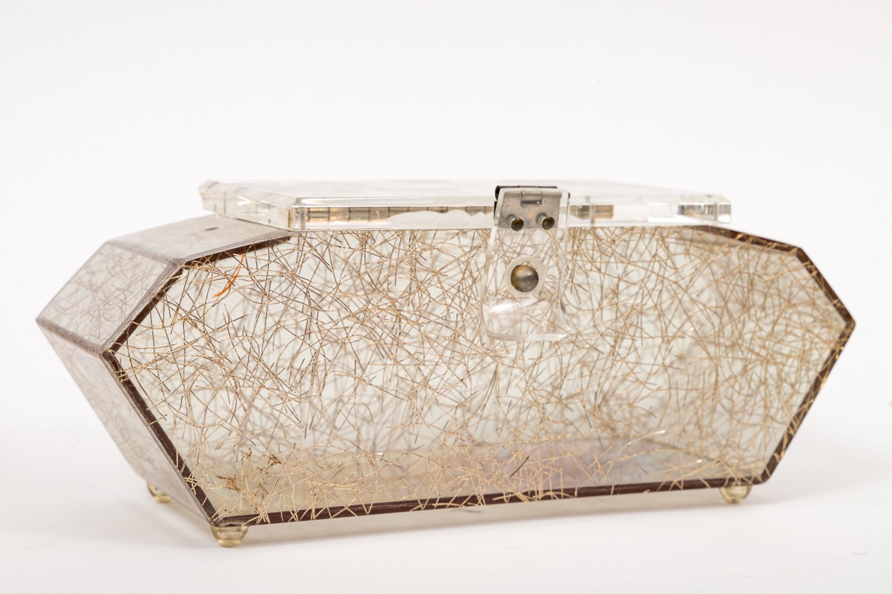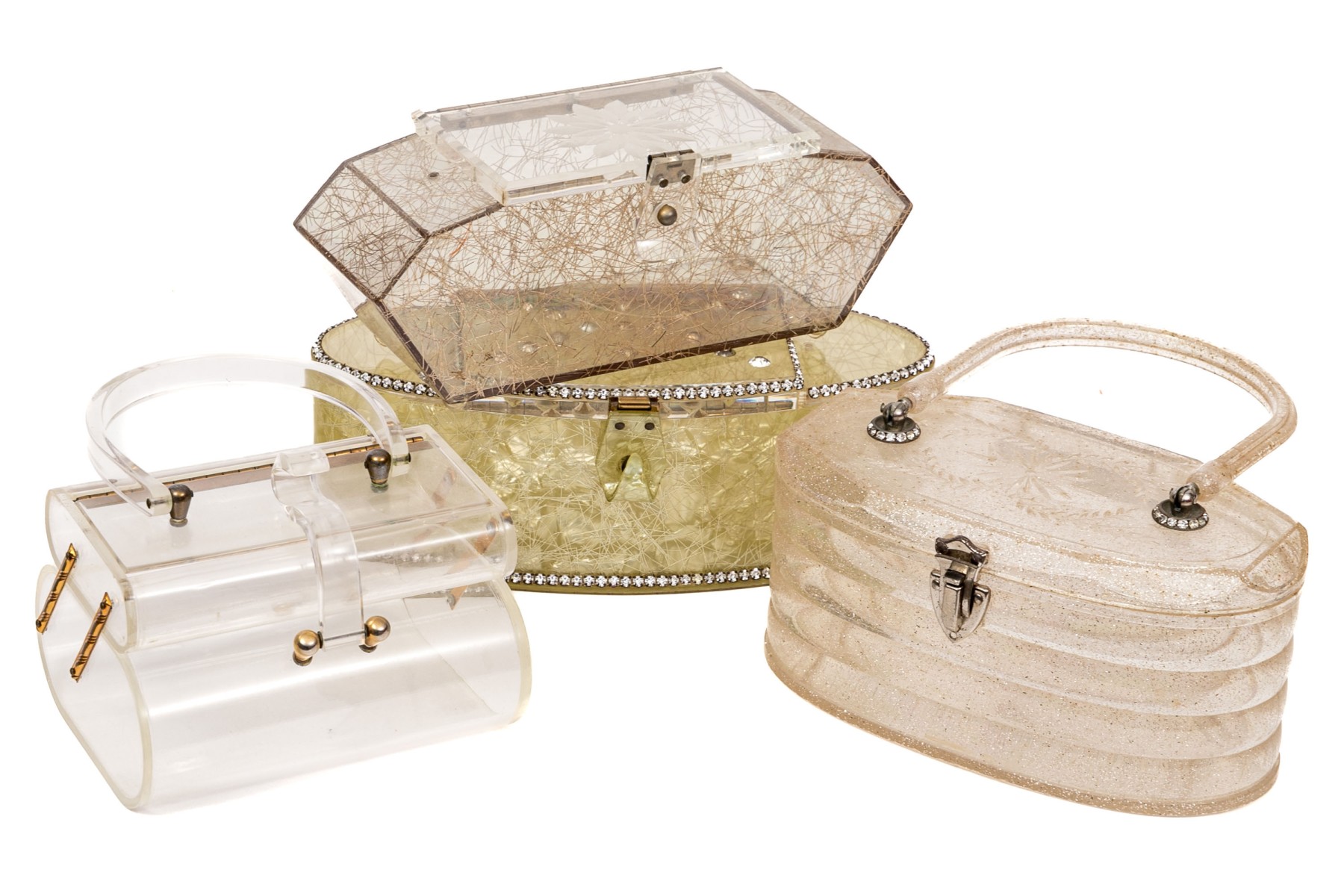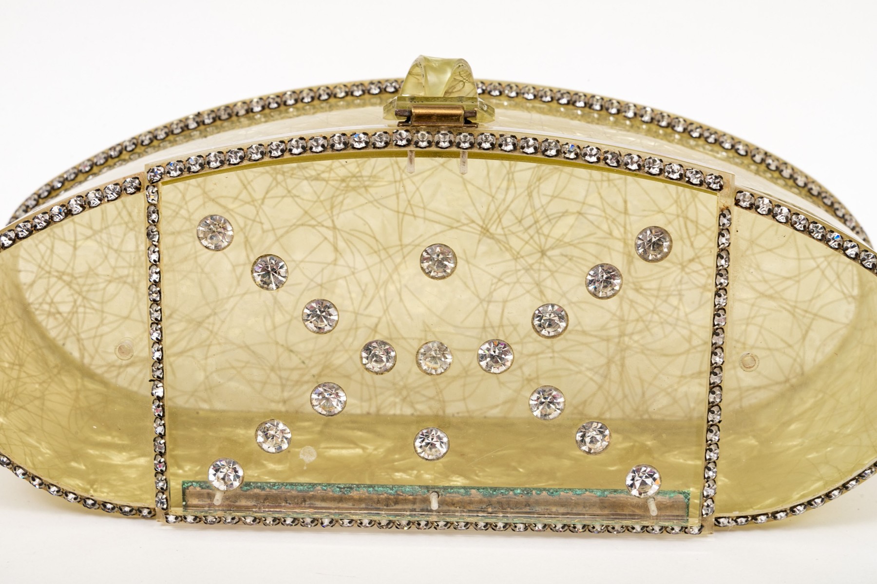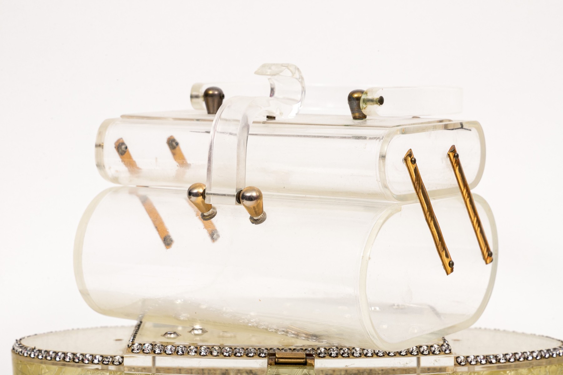 Some wear commensurate with some age and use along with storage. Slight wear to the mounts and lucite but overall a great lot of vintage handbags and dresser boxes. Please review the photos as they are part of the condition report.